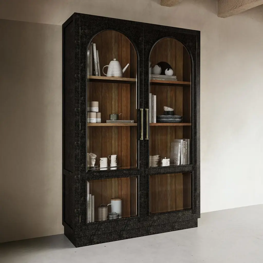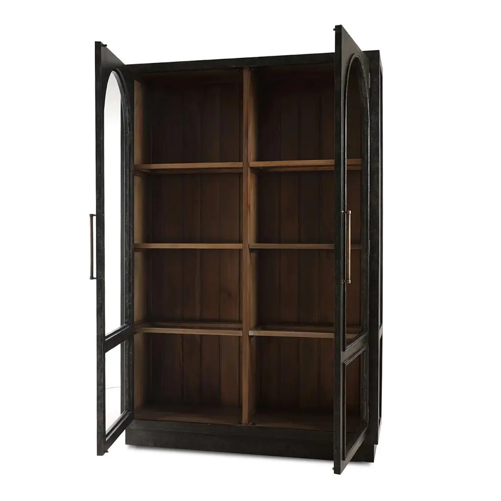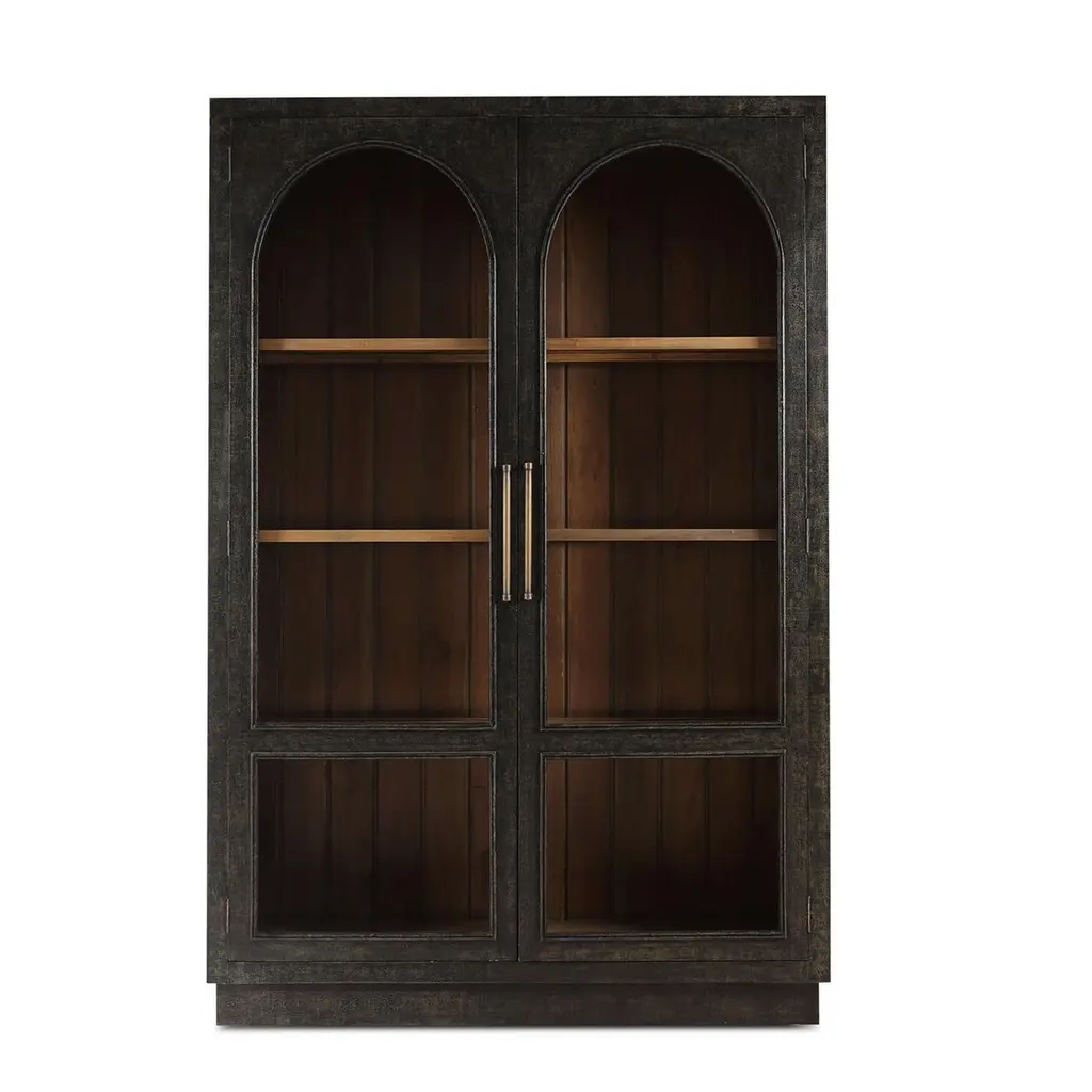 Finished in a vintage black and featuring a charming straw wash interior. This cabinet serves as a striking focal point in any room, offering a sophisticated touch with its classic design. The arched glass doors provide the perfect stage to showcase your favorite collectibles, books, or decorative pieces, while the doors open to reveal ample storage space, ensuring all your treasures have a home.Dimensions: 55" W x 16" D x 83" HCustom finish options are also available. Contact us to learn more.