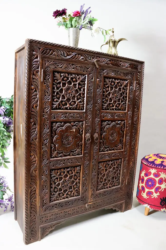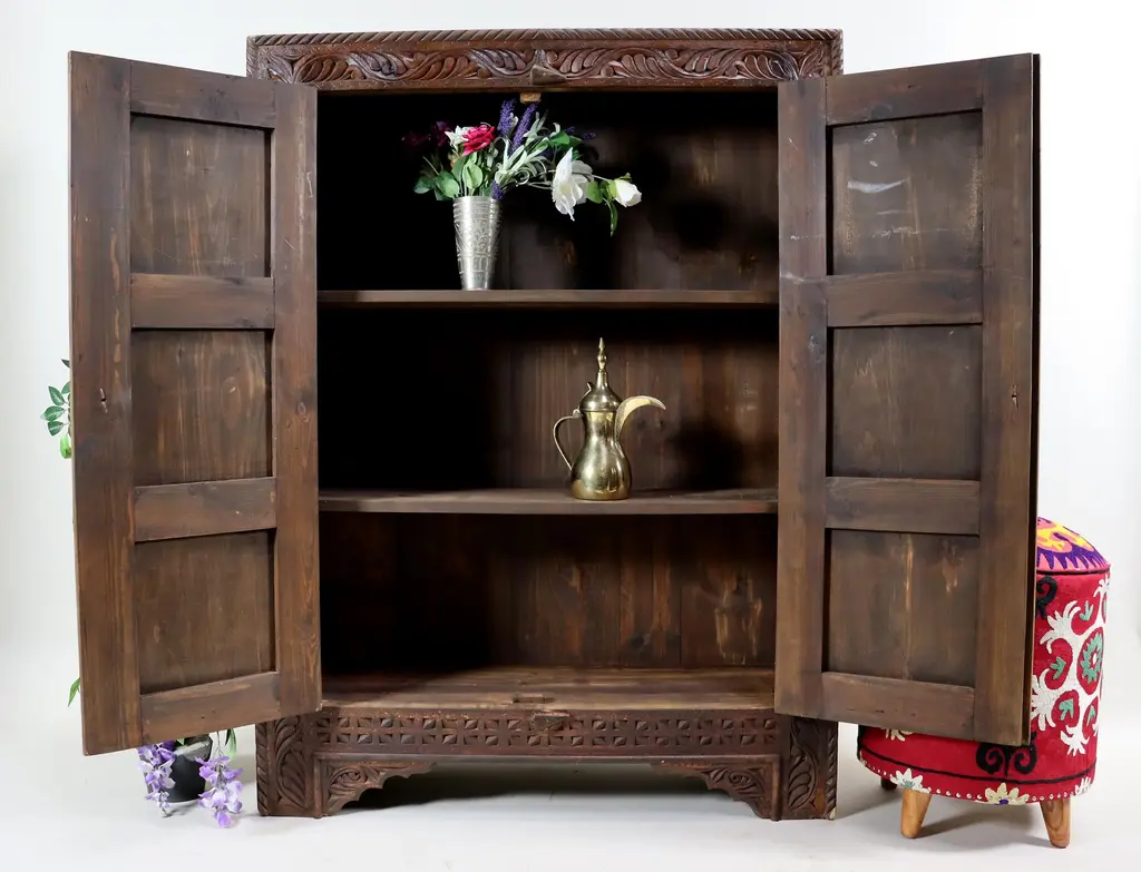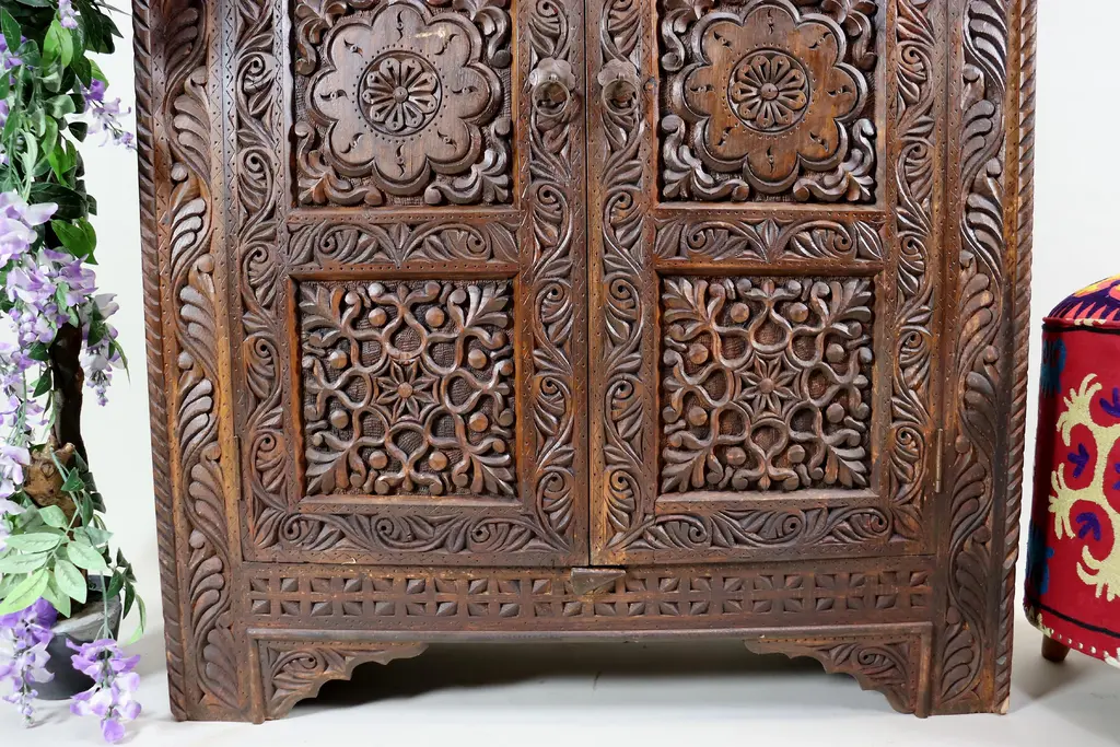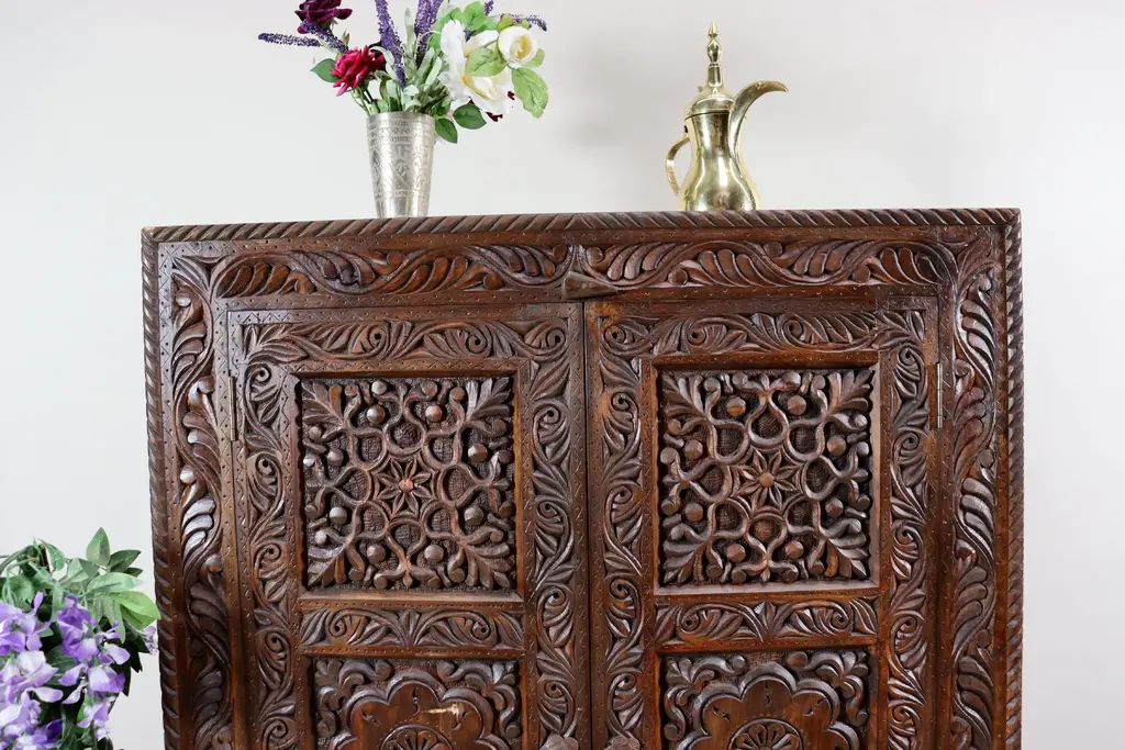 Solid wood hand -carved cabinet wall wall wall shelf shelf cabinet chest of drawers hallway sideboard semi -board semi -cupboard nuristan afghanistan. Surface: dark brown glazed Practical: the furniture is delivered whole! Execution: 1x closet Dimensions: H/B/T: approx. 143/107/35 cm Surface: hand -cheated and dark brown glazed
