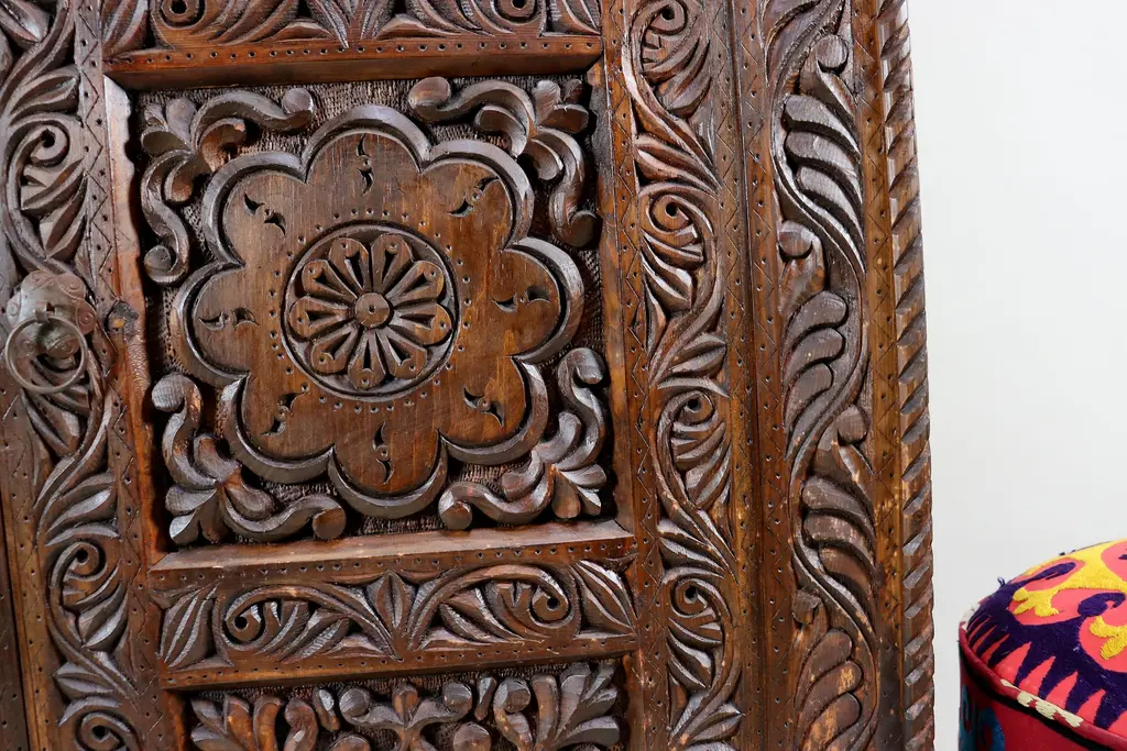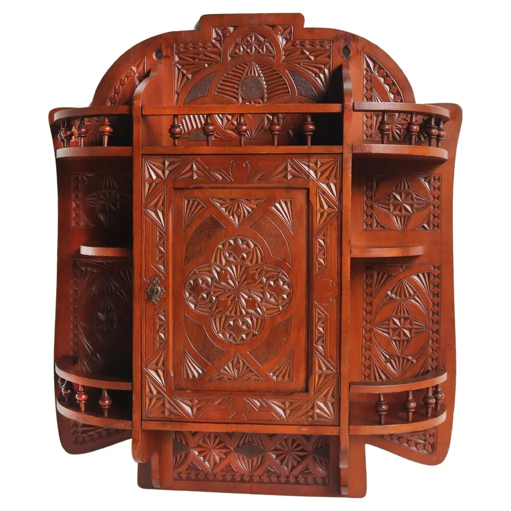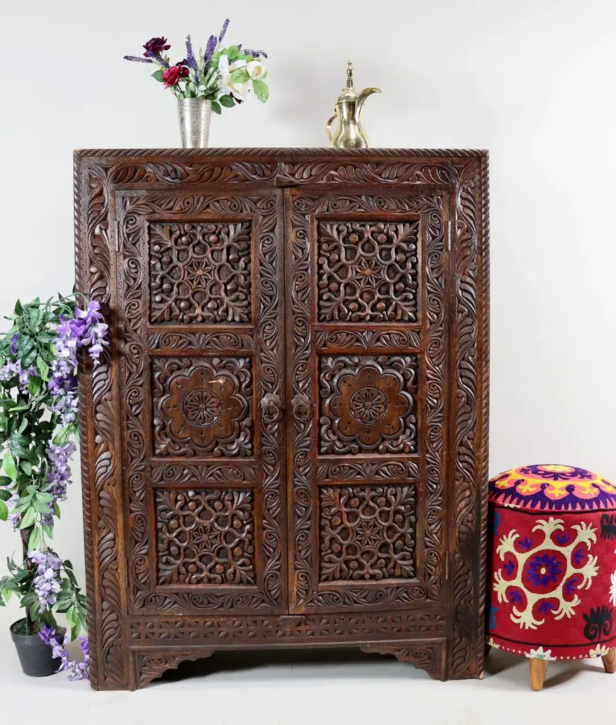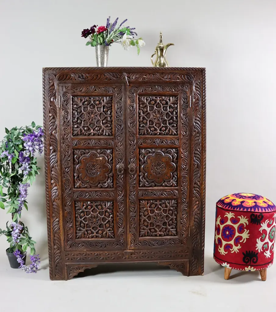 Solid wood hand -carved cabinet wall wall wall shelf shelf cabinet chest of drawers hallway sideboard semi -board semi -cupboard nuristan afghanistan. Surface: dark brown glazed Practical: the furniture is delivered whole! Execution: 1x closet Dimensions: H/B/T: approx. 143/107/35 cm Surface: hand -cheated and dark brown glazed