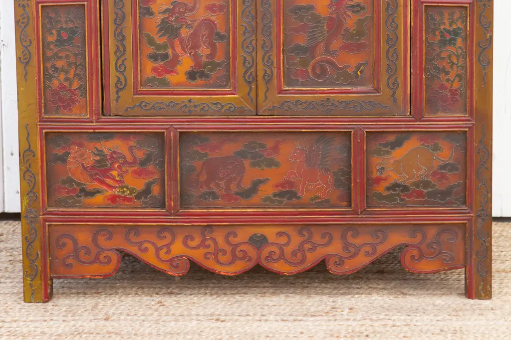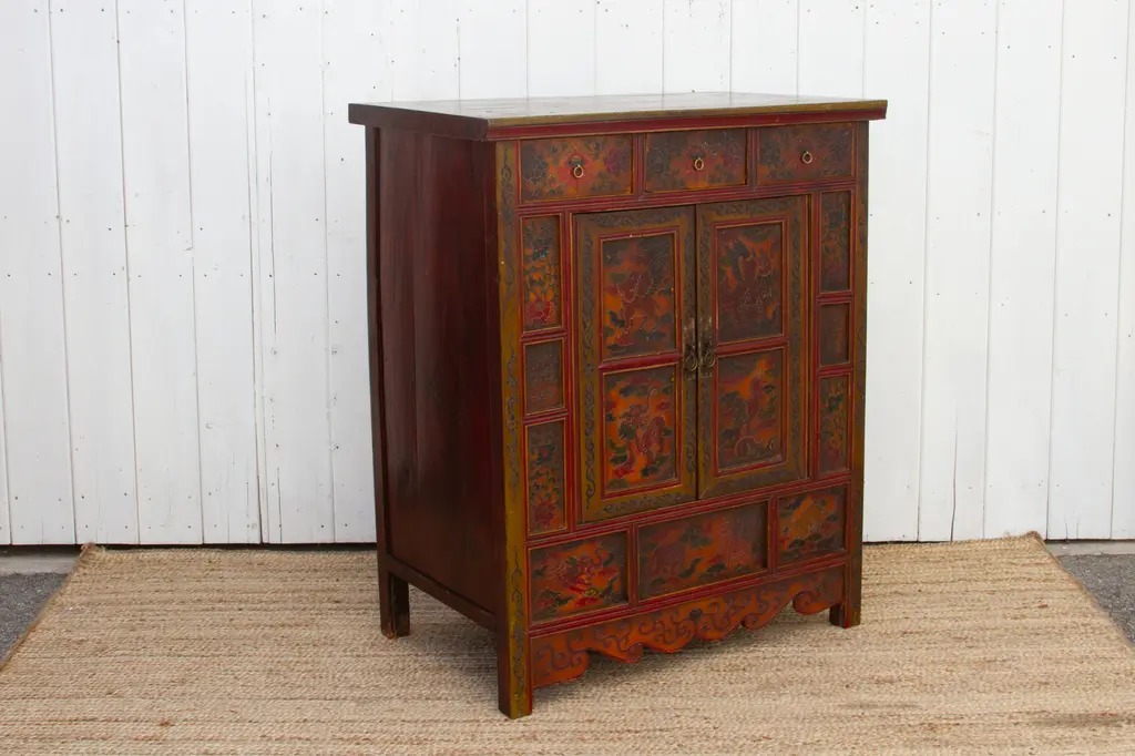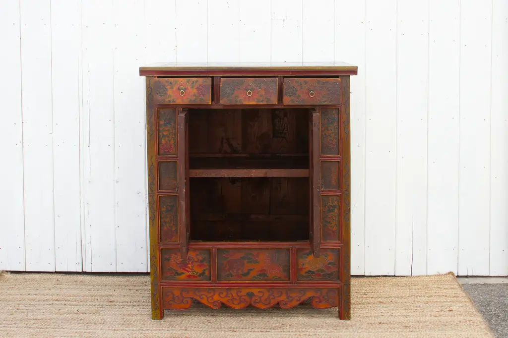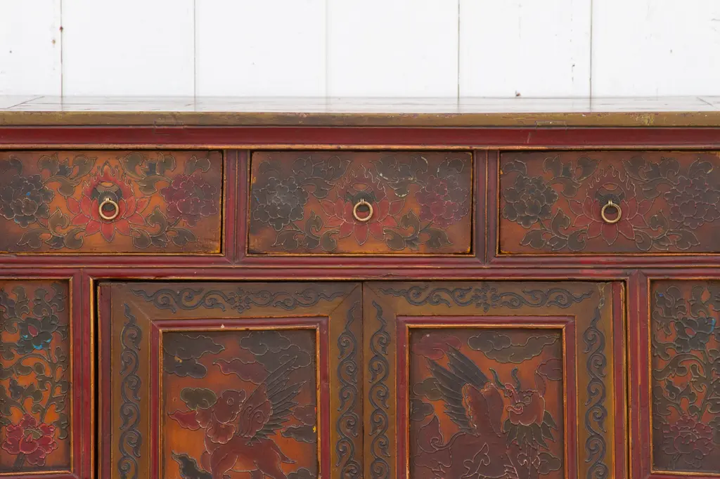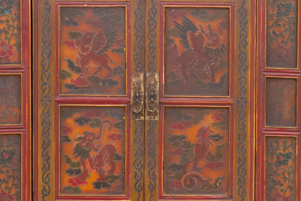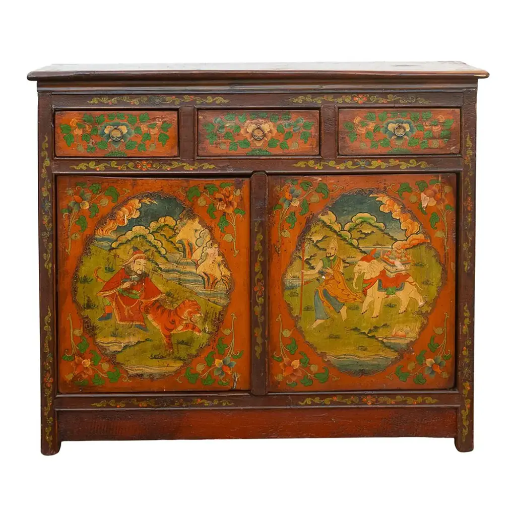 A vintage Mongolian buffet cabinet with 3 drawers over 2 doors, marrying beauty and functionality effortlessly. Adorned with a captivating painted scene on an aged yellow backdrop, this cabinet adds a touch of exotic allure to your space. Crafted from pine wood, this cabinet has a stunning painted depiction of animals in nature, including a remarkable phoenix flying design above royal medallions, symbolizing power and elegance.