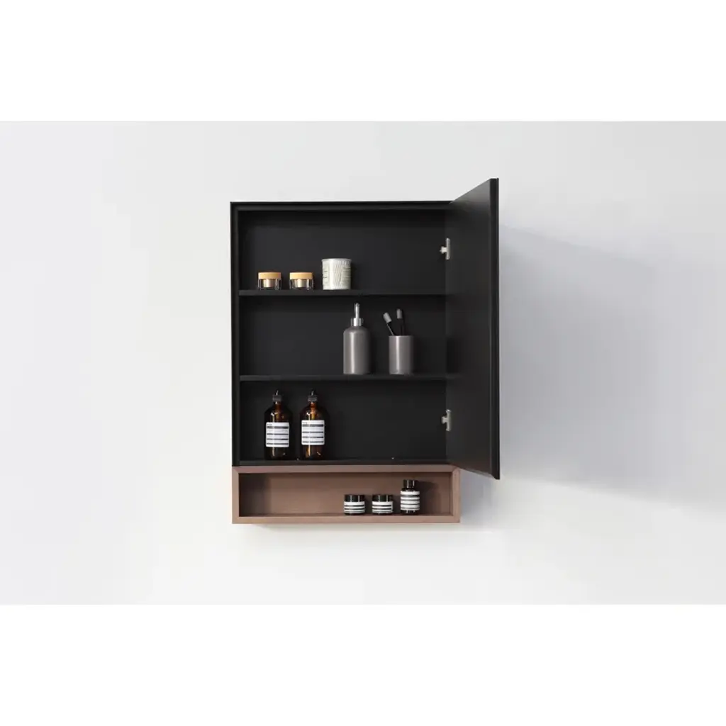 The elegant mirrored door opens easily to reveal three shelves with ample storage space. Underneath, an additional sturdy shelf made of high quality wood emphasizes the unit's utility. The clean lines and high quality build will bring a sense of organization and warmth to your bathing space.