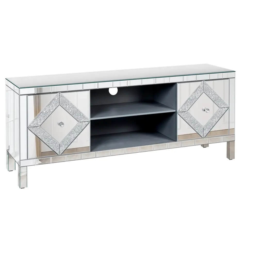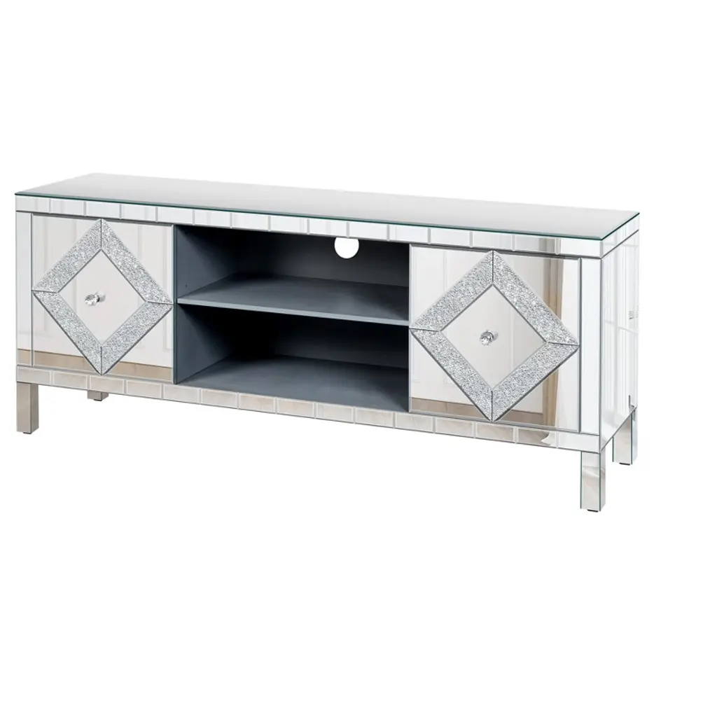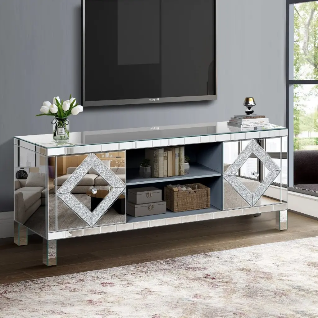 Transform your living room with the VYNXARIA Mirrored TV Stand, designed for TVs up to 65 inches. This stunning console features a fully mirrored exterior with diamond-shaped sparkling mirror doors, adding a touch of elegance and modernity to your space. Measuring 59''W x 25.2''H x 15.7''D, it offers versatile storage solutions with two open shelves and two cabinet doors adorned with crystal pulls, perfect for organizing books, video games, and more. Crafted from durable MDF and smooth glass mirror, this stylish TV stand is not only a statement piece but also easy to maintain, making it a perfect addition to any home decor.