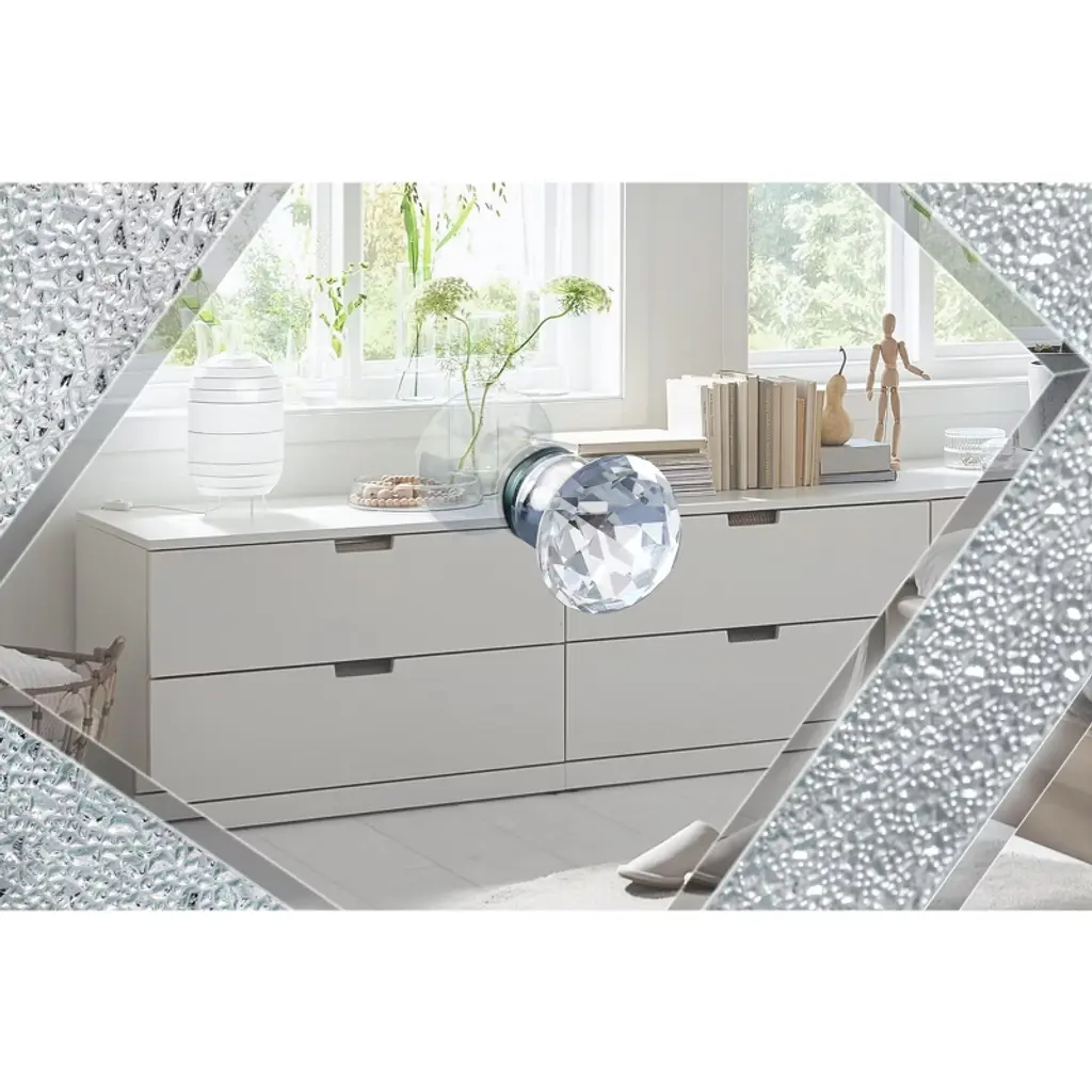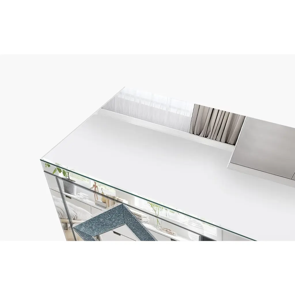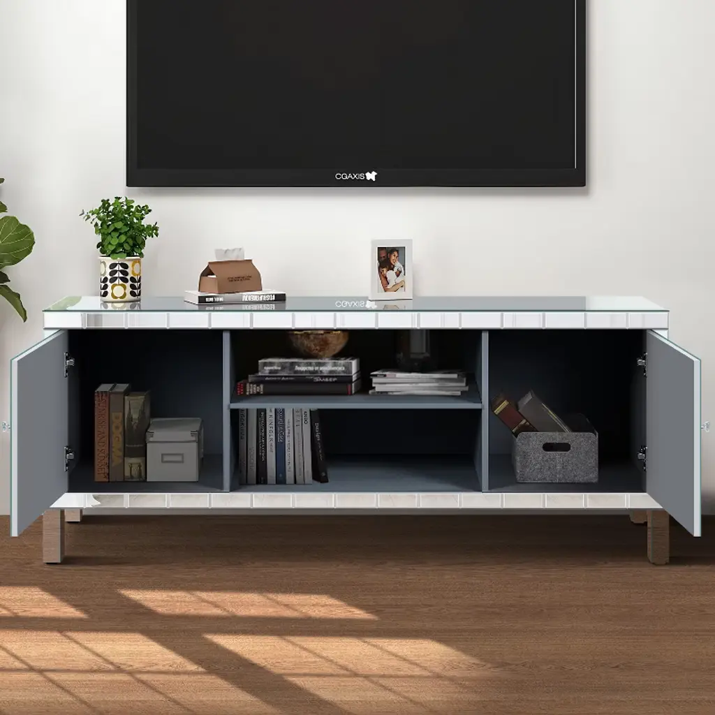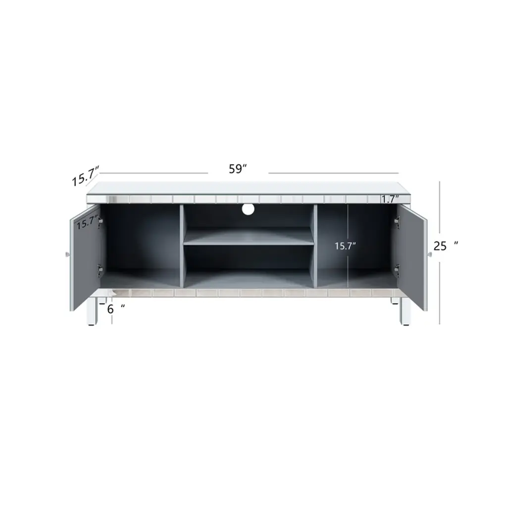 Transform your living room with the VYNXARIA Mirrored TV Stand, designed for TVs up to 65 inches. This stunning console features a fully mirrored exterior with diamond-shaped sparkling mirror doors, adding a touch of elegance and modernity to your space. Measuring 59''W x 25.2''H x 15.7''D, it offers versatile storage solutions with two open shelves and two cabinet doors adorned with crystal pulls, perfect for organizing books, video games, and more. Crafted from durable MDF and smooth glass mirror, this stylish TV stand is not only a statement piece but also easy to maintain, making it a perfect addition to any home decor.