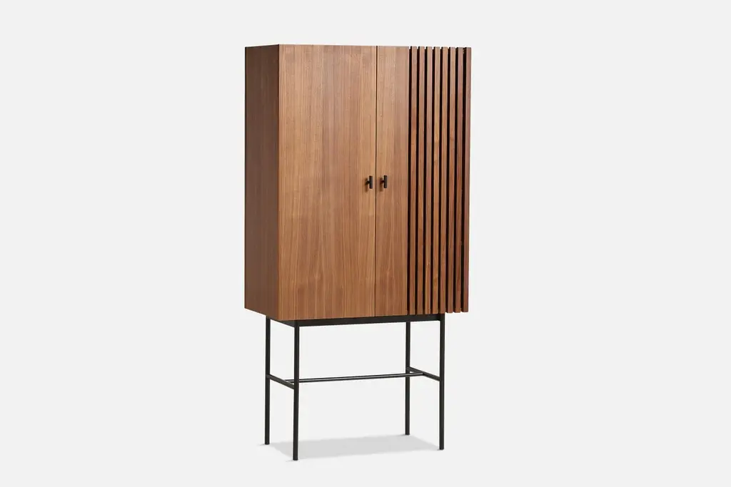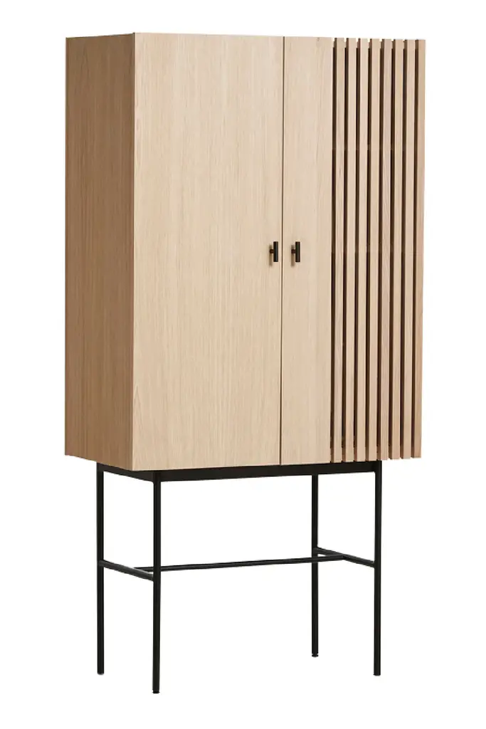 Walnut array highboard 80 by Says Who.Materials: Walnut, metal.Dimensions: D 44 x W 80 x H 160 cm.Also available in different colours and materials.The founders, Mia and Torben Koed, decided to put their 30 years of experience into a new project. It was time for a change and a new challenge. The challenge was to build an ambitious design brand from the ground up with high-quality materials and great attention to the little details. With a drive to create new originals, the WOUD collection is founded upon the idea to look ahead instead of looking back and share the love for honest design. Therefore, we are eager to discover and develop new ideas whether it being in form, function or choice of material. Says Who is a Danish design studio founded by Kasper Meldgaard and Nikolaj Duve. Rooted in the traditions of Scandinavian design, Says Who combines Nordic minimalism with functionality to create furniture and design solutions. Sharing their love for simplicity, the duo has collaborated with various design brands. The studio is part of the movement of New Scandinavian Design with respect for the design heritage while reinventing it to fit the present time and environment. With curiosity and passion for discovering new ways forward, they create designs with clean lines and geometrical shapes. This dedication recurs in the Barn cabinet and their most recent design to the WOUD collection, the Array series, which beautifully communicates the characteristic lines found in modern architecture.