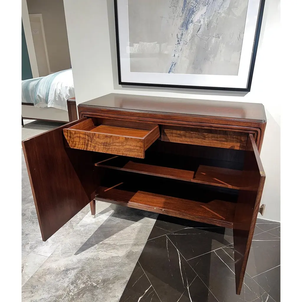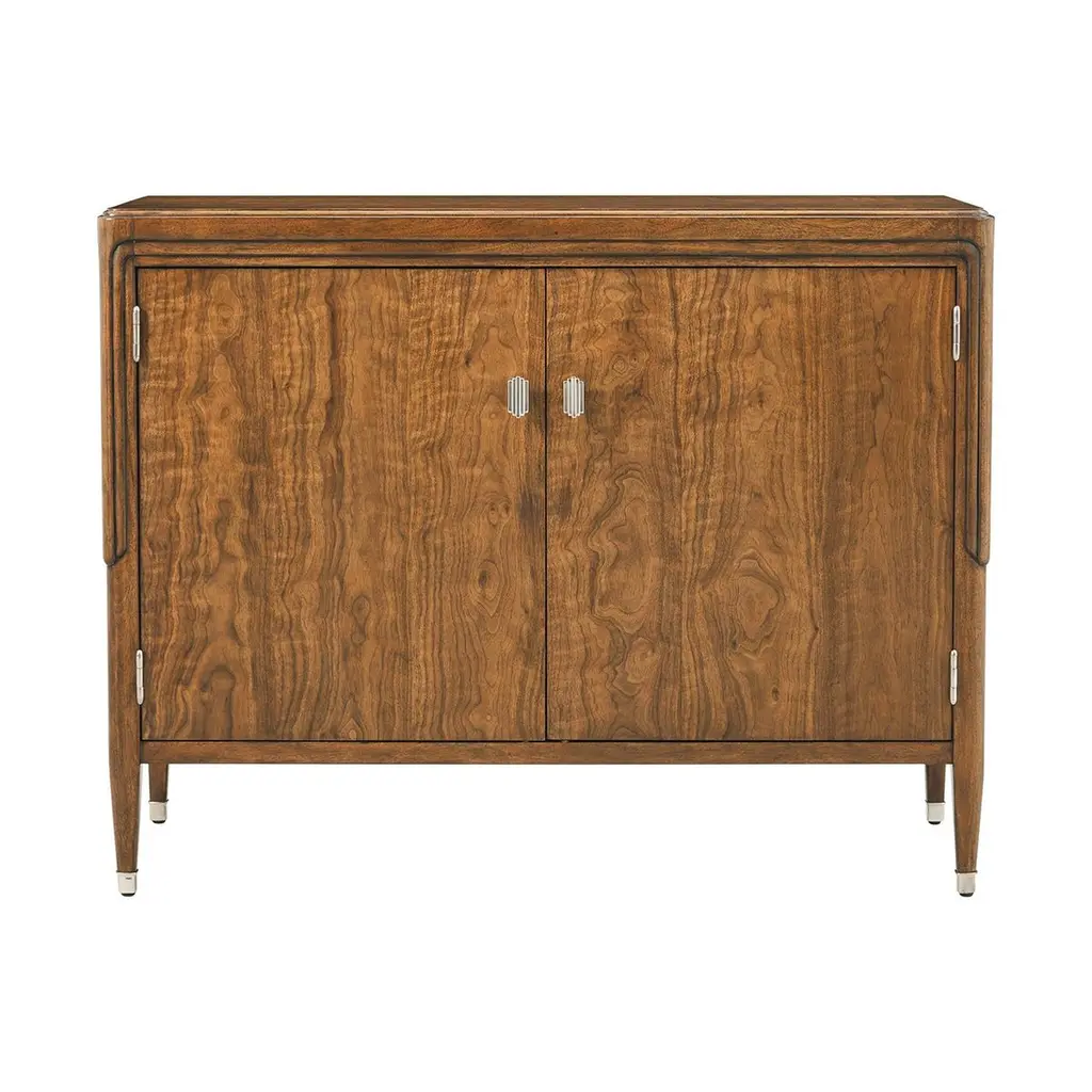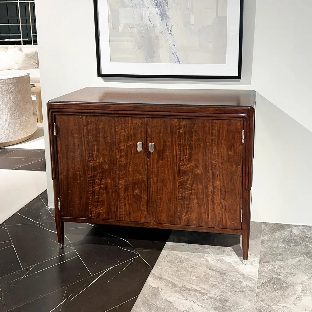 Crafted from exquisite figured walnut, its rich wood grain and slender decorative motif create a statement of understated opulence. The expertly tapered legs and subtle molding details enhance its poised silhouette, while sleek metal hardware adds a contemporary touch.Designed for both beauty and function, this side cabinet offers generous storage concealed behind cupboard doors, making it a sophisticated addition to dining rooms, living spaces, or grand entryways. This piece brings a harmonious balance of Art Deco grandeur and modern versatility to any interior.Dimensions: 48" W x 20" D x 37" H