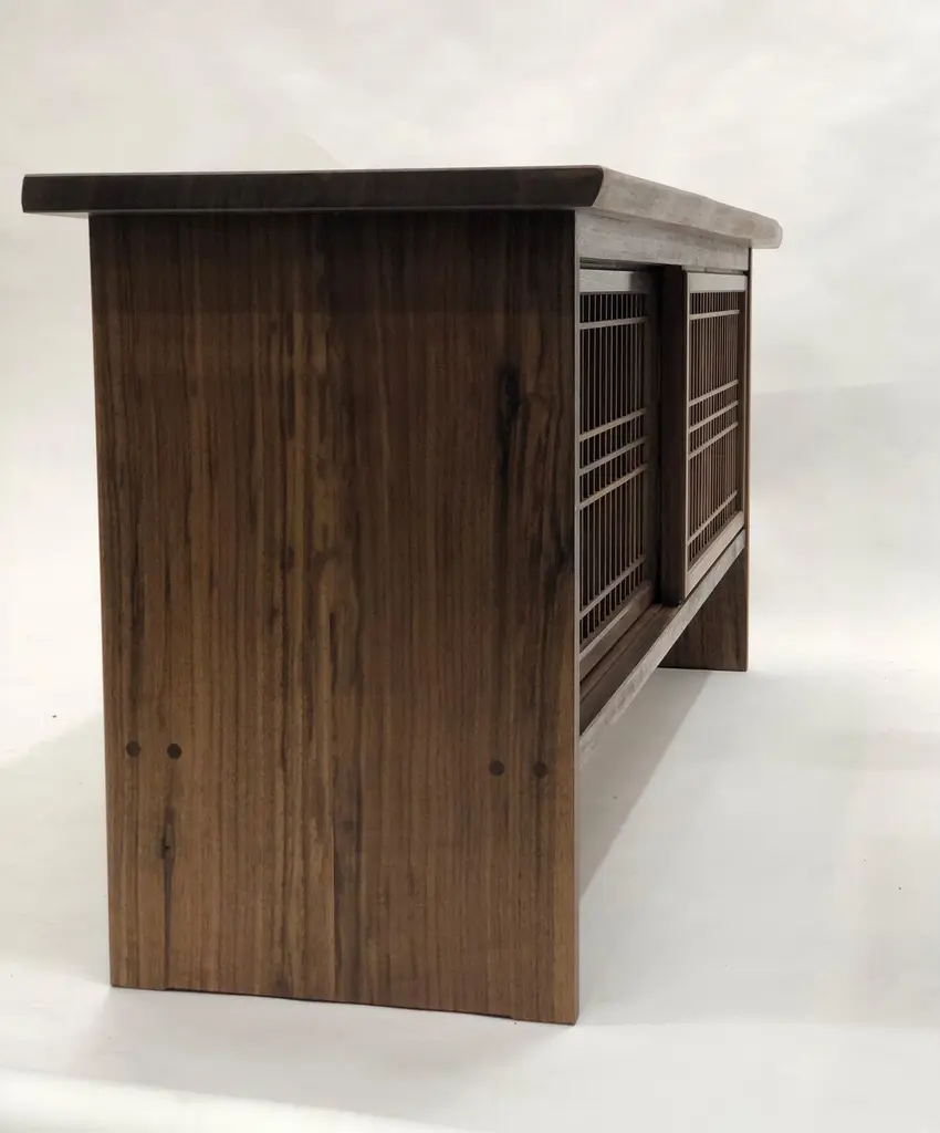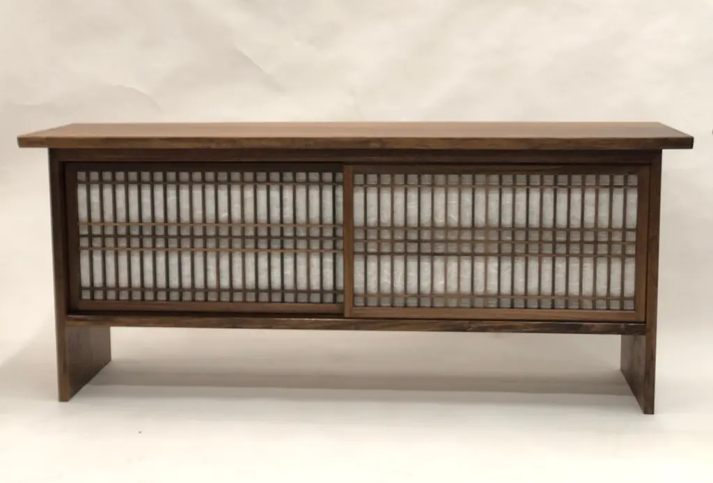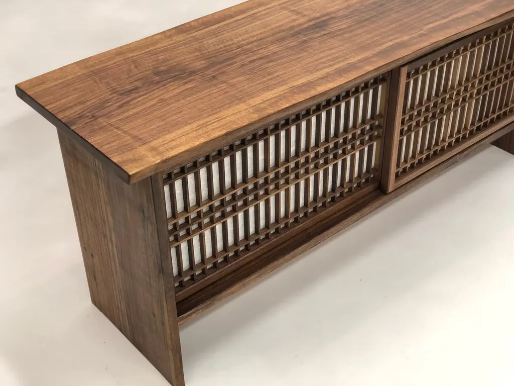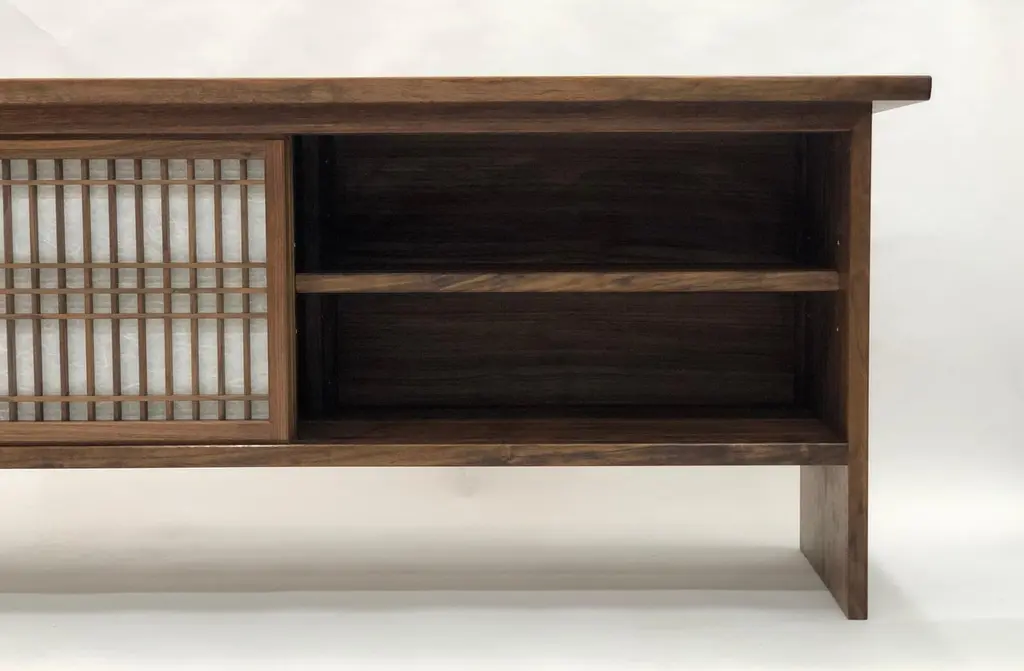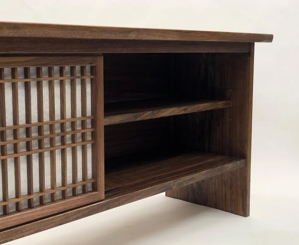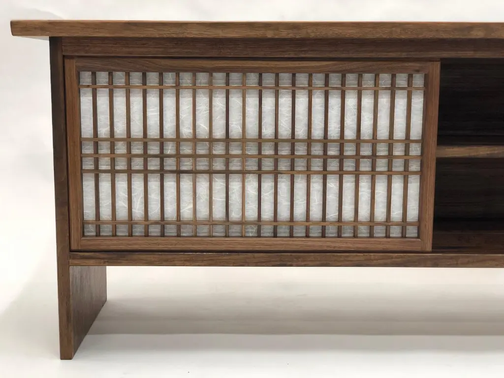 Walnut credenza made by hand and featuring sliding shoji doors and a shelf. This cabinet is constructed utilizing time honored joinery techniques featured in Japanese temple carpentry in addition it features shoji made utilizing those same traditional joinery techniques. The result is a cabinet that will serve you for many years to come.The shoji doors are backed with mulberry paper, the traditional paper used in shoji construction. This breathable material will allow the cabinet to circulate air while providing privacy to the storage space.Customizations are available including length and material.