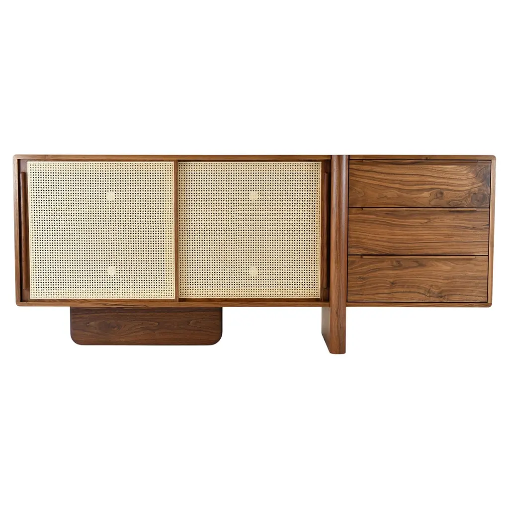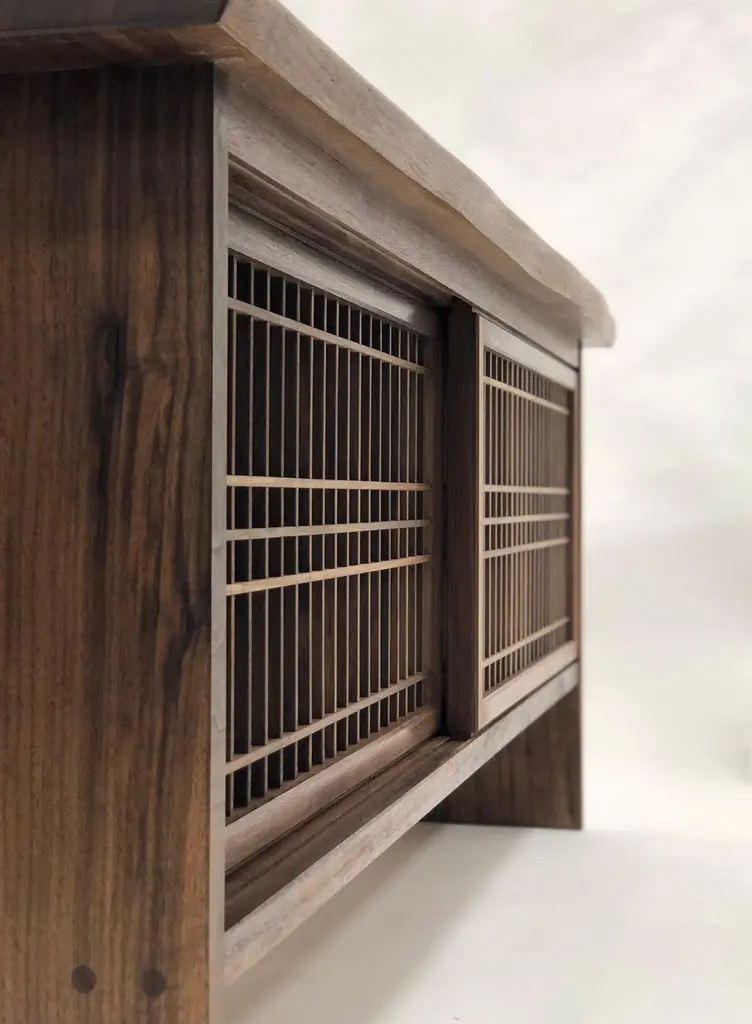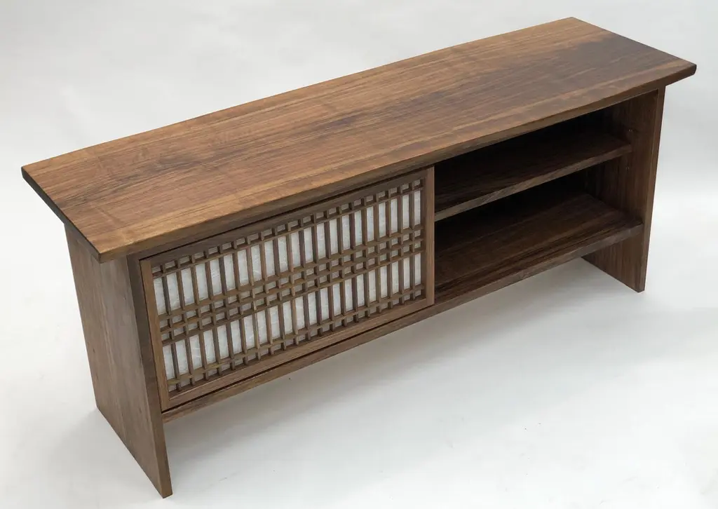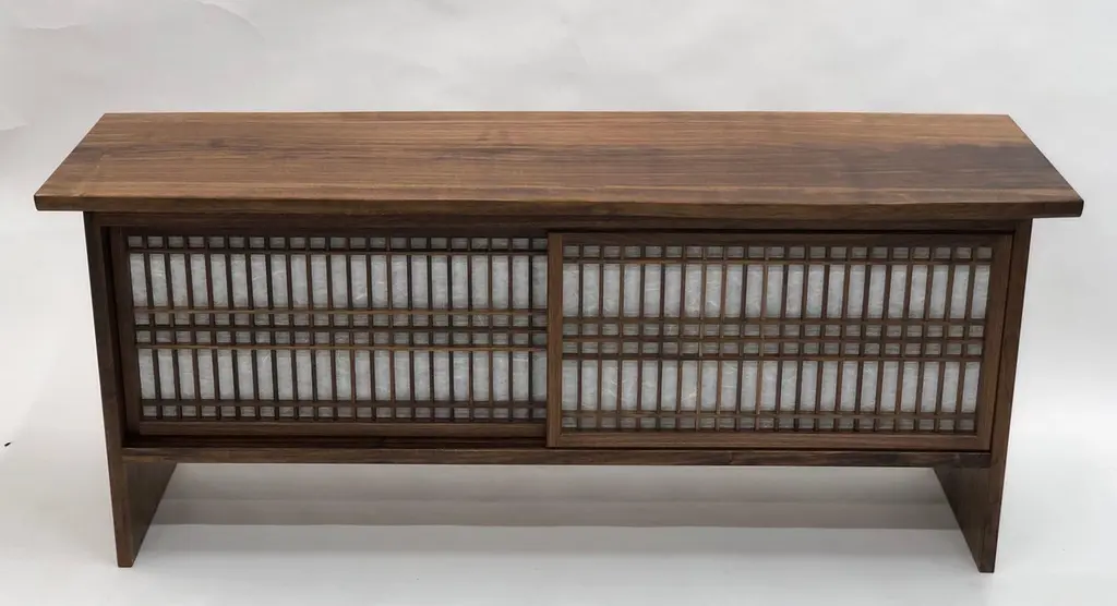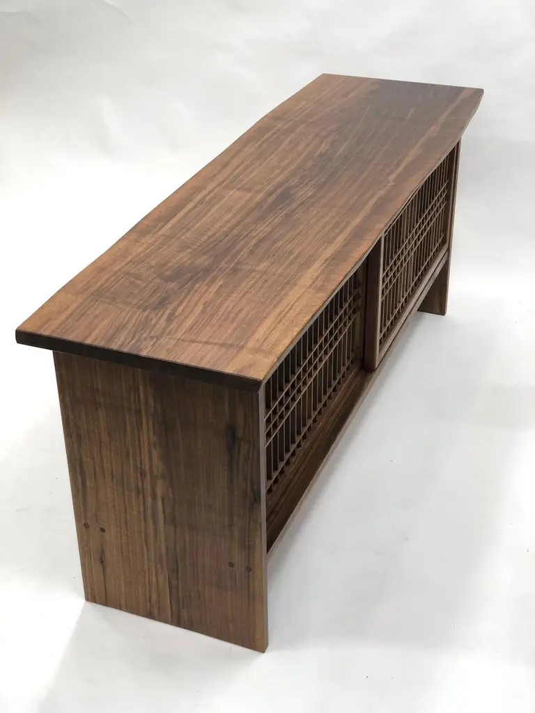 Walnut credenza made by hand and featuring sliding shoji doors and a shelf. This cabinet is constructed utilizing time honored joinery techniques featured in Japanese temple carpentry in addition it features shoji made utilizing those same traditional joinery techniques. The result is a cabinet that will serve you for many years to come.The shoji doors are backed with mulberry paper, the traditional paper used in shoji construction. This breathable material will allow the cabinet to circulate air while providing privacy to the storage space.Customizations are available including length and material.