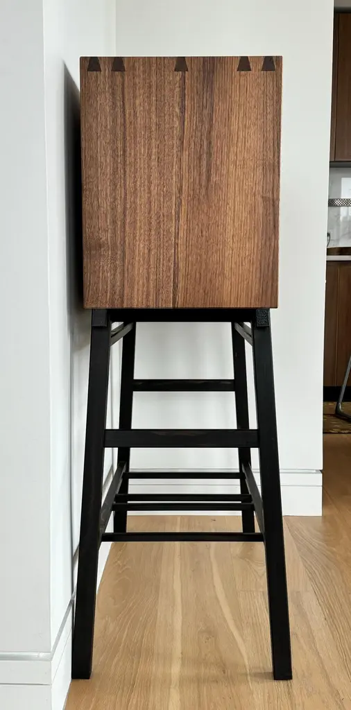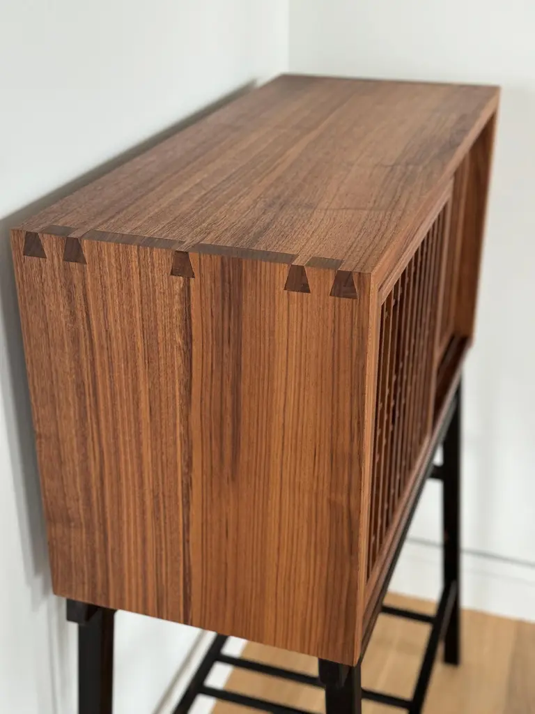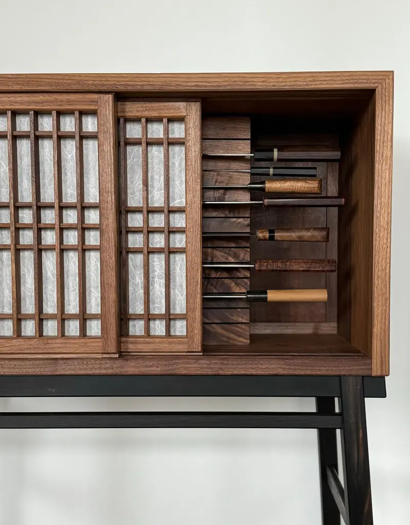 Walnut cabinet made by hand and featuring shoji doors and shelves. This cabinet is constructed utilizing time honored joinery techniques featured in Japanese temple carpentry in addition it features shoji made utilizing those same traditional joinery techniques. The result is a cabinet that will serve you for many years to come.The shoji doors are backed with mulberry paper, the traditional paper used in shoji construction. This breathable material will allow the cabinet to circulate air while providing privacy to the storage space.The interior of this cabinet can be customized to suit your specific needs, it is shown in a customized format but is typically available with two shelves. The shelves have adjustable heights and wire pass throughs can be provided if necessary. I cut the wire pass throughs in only when requested so that the cabinet can be used as a room divider without visible pass throughs.Customizations are available including length and material. The legs are shown in gaboon ebony which is available at additional cost. The standard leg material choice would be walnut, which can be ebonized if so desired, or left plain.