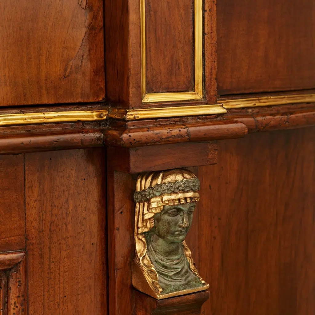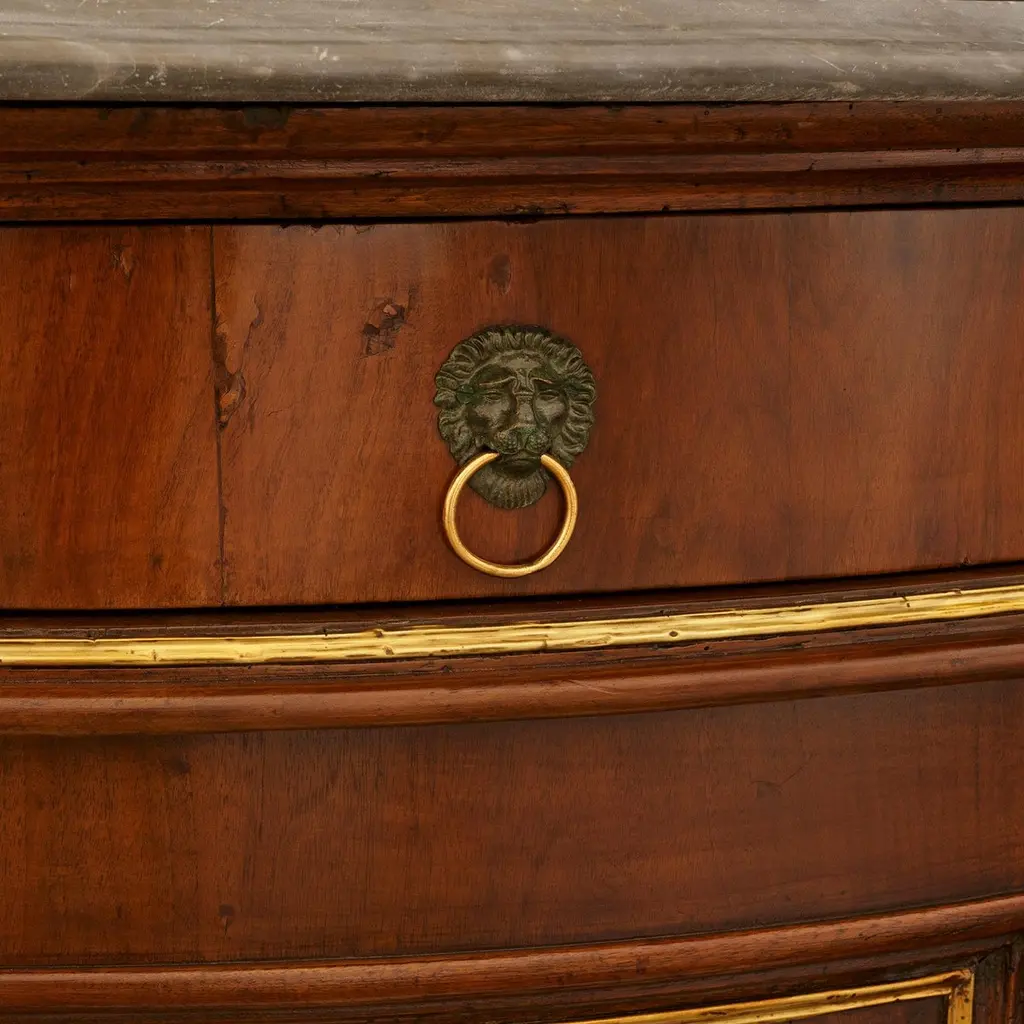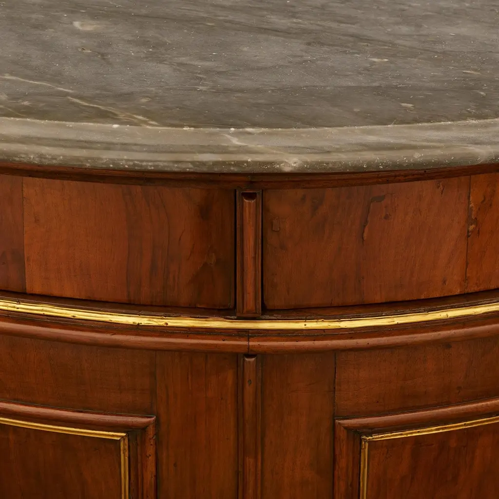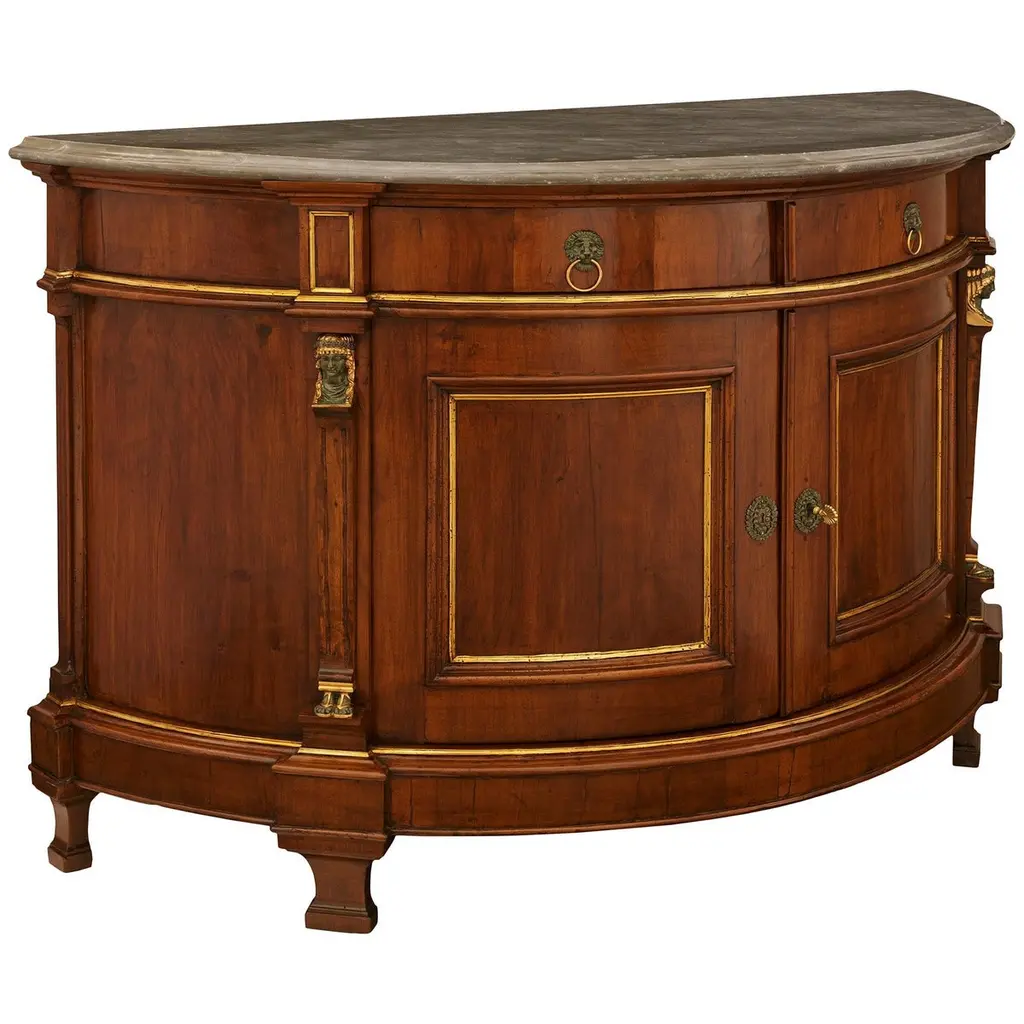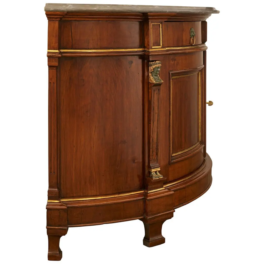 A sensational and most impressive Italian 18th century Neo-Classical st. Walnut, Verdigris Bronze, Giltwood and and Gris St. Anne marble cabinet. This handsome demi lune shaped cabinet is raised on four scrolled block feet below the mottled designed apron. The two curved front doors display wonderful recessed panels set within mottled Brass frames, which open to reveal a single interior shelf. The doors are flanked by most decorative tapered Walnut columns in the style of Caryatids with Giltwood sandals at the base and patinated Verdigris Bronze and Giltwood busts. Above are two drawers displaying handsome lion head pulls, while flanked by block reserves accented with Brass mottled inner frames. The drawers and doors are fitted by their original hardware including the keyhole escutcheons, pulls and locks. Above lays the solid Gris St. Anne marble top with an ogee edge and following the shape of the cabinet.