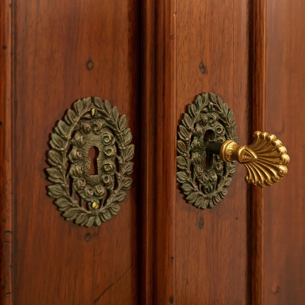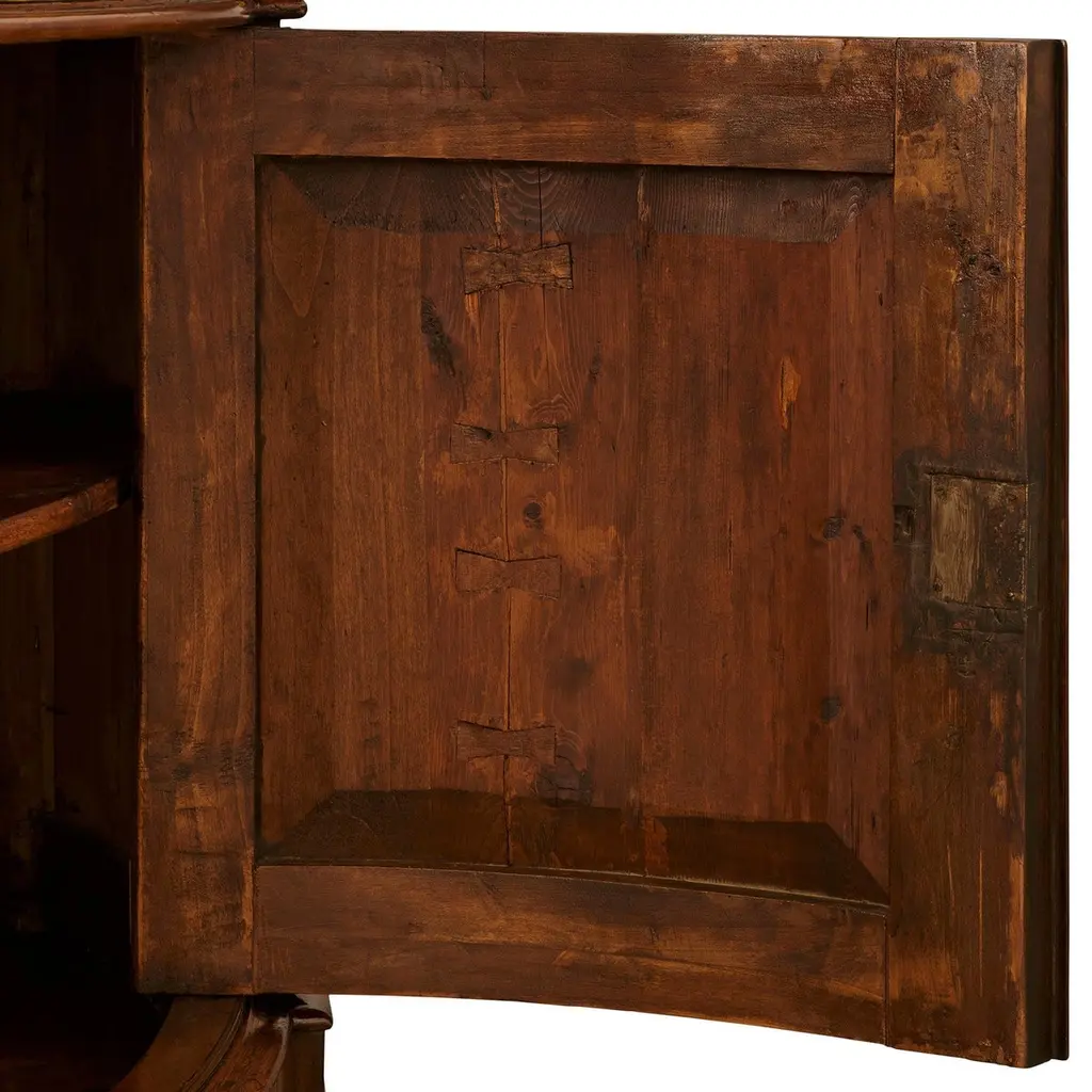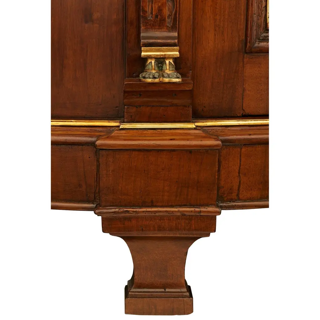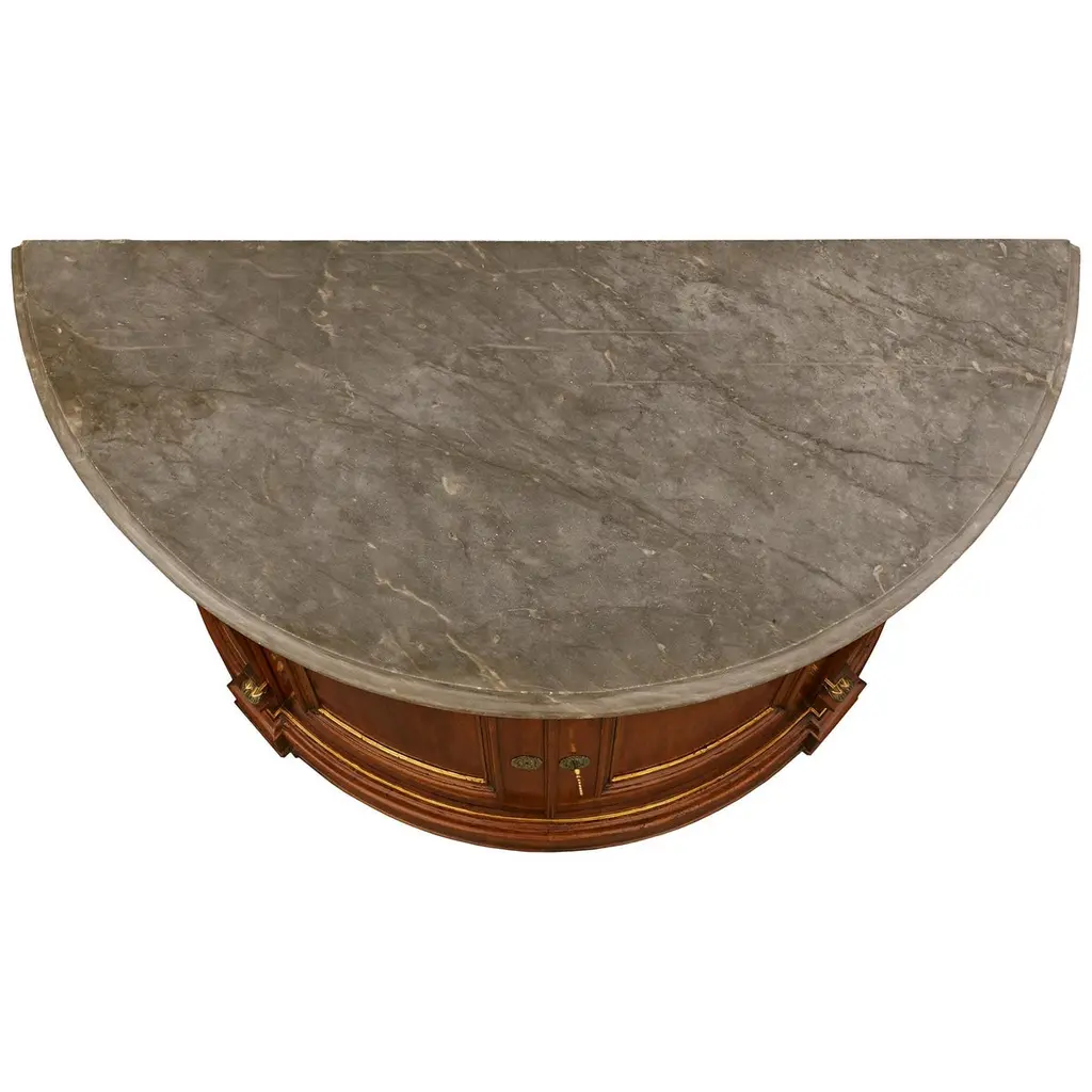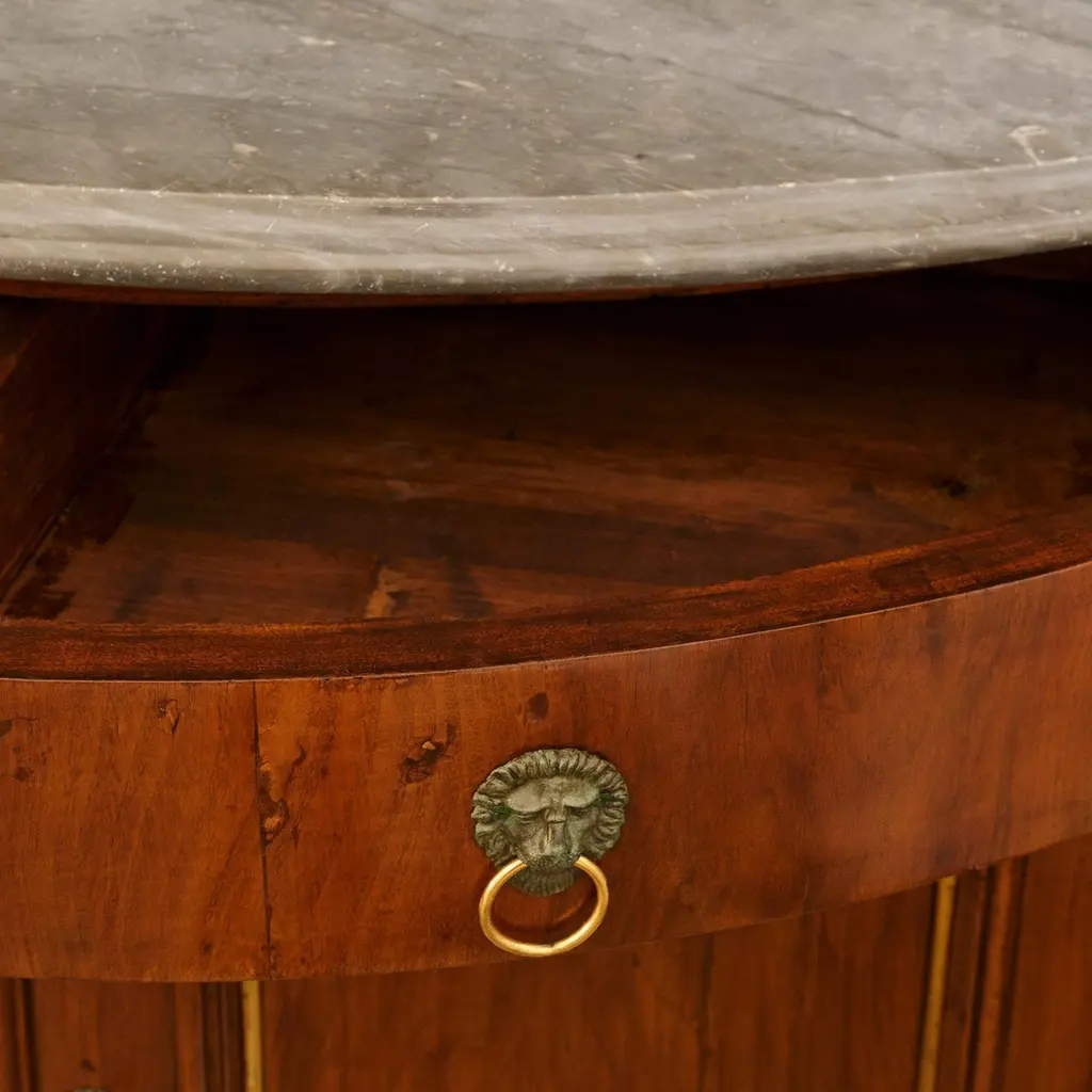 A sensational and most impressive Italian 18th century Neo-Classical st. Walnut, Verdigris Bronze, Giltwood and and Gris St. Anne marble cabinet. This handsome demi lune shaped cabinet is raised on four scrolled block feet below the mottled designed apron. The two curved front doors display wonderful recessed panels set within mottled Brass frames, which open to reveal a single interior shelf. The doors are flanked by most decorative tapered Walnut columns in the style of Caryatids with Giltwood sandals at the base and patinated Verdigris Bronze and Giltwood busts. Above are two drawers displaying handsome lion head pulls, while flanked by block reserves accented with Brass mottled inner frames. The drawers and doors are fitted by their original hardware including the keyhole escutcheons, pulls and locks. Above lays the solid Gris St. Anne marble top with an ogee edge and following the shape of the cabinet.