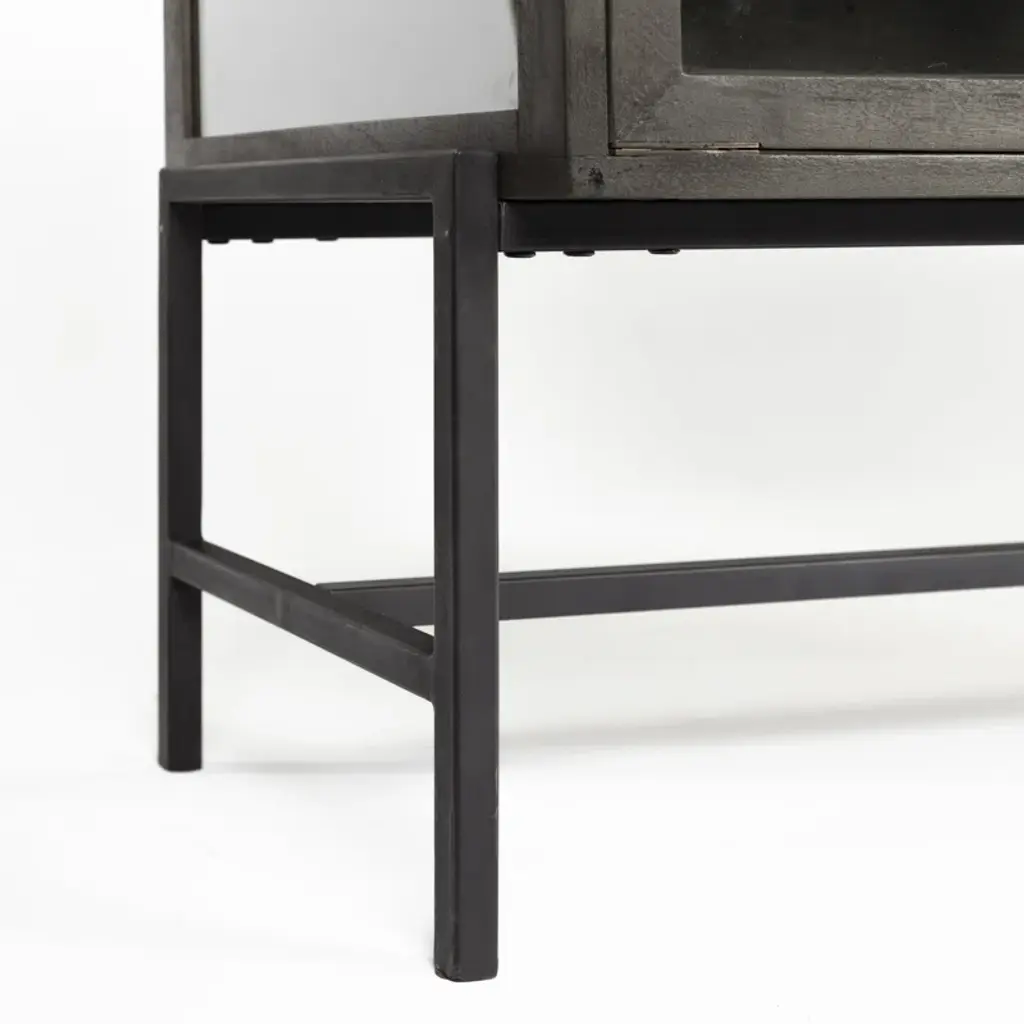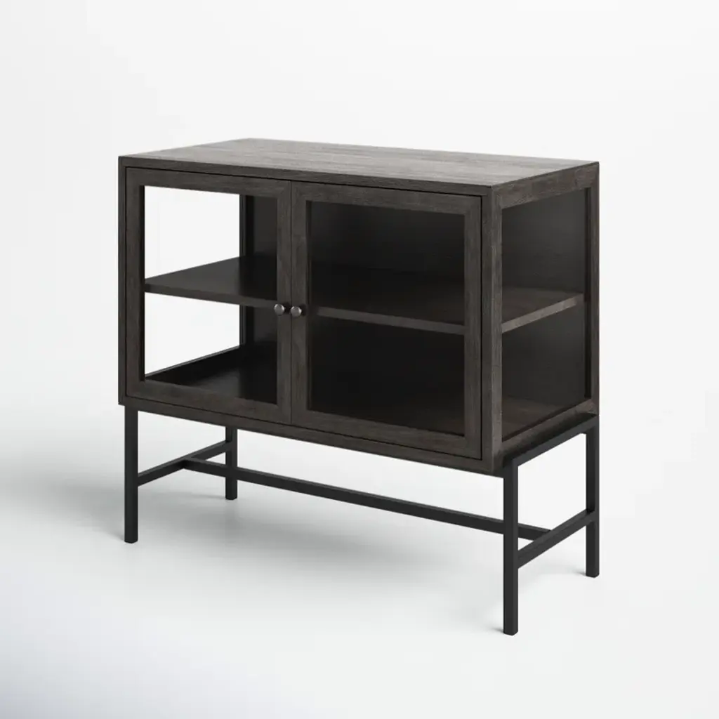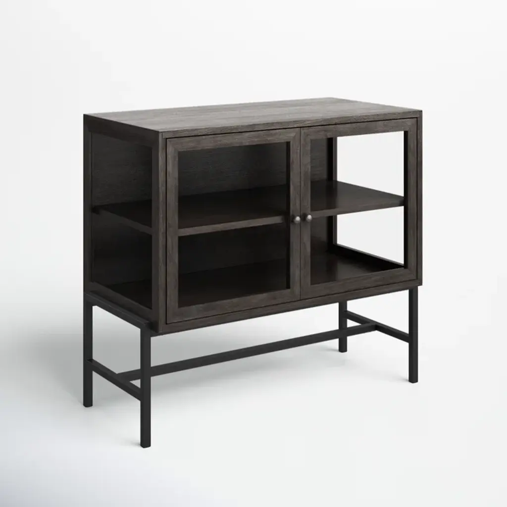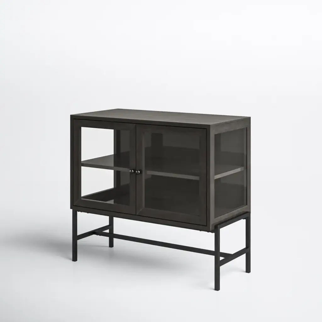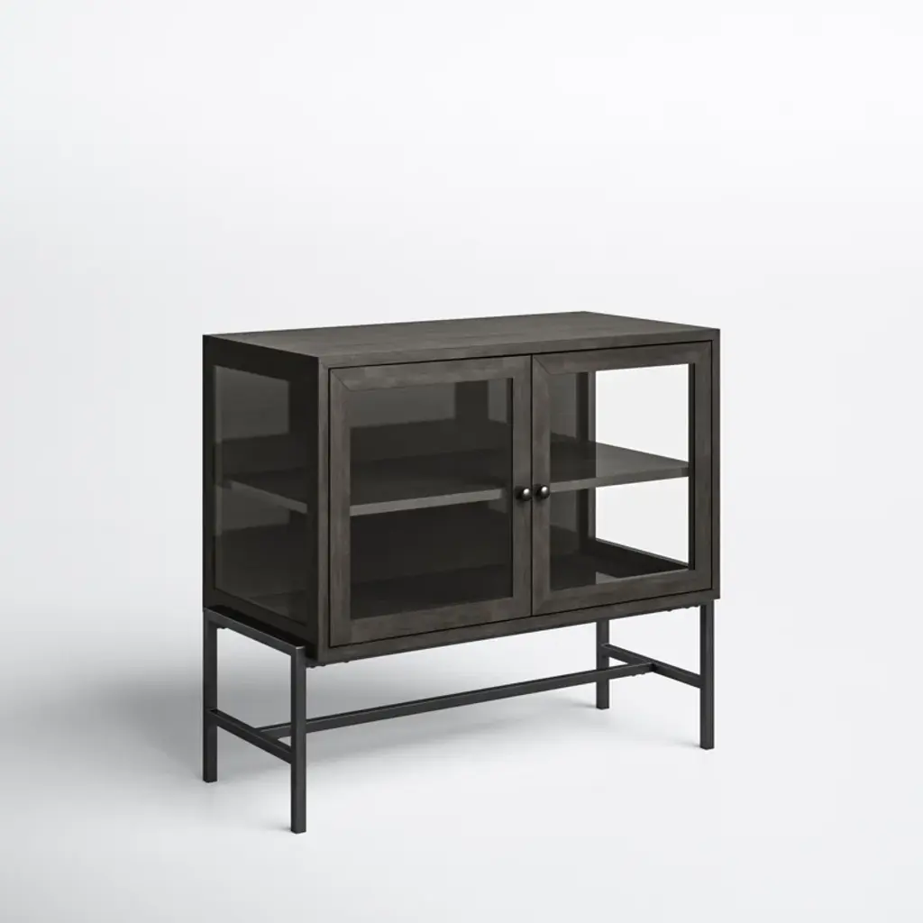 With its slim rectangular silhouette and clean lines, this accent cabinet is as visually appealing as it is functional. It's crafted from mango wood and sits on a four-legged solid iron base with cross bracing for added style and support. Up top, it's equipped with glass side panels and two clear, glass-lined doors. Inside, removable shelves offer ample storage space for everyday items, decorative objects, and anything else you want to show off while you stay organized. Plus, this accent cabinet easily comes together with only partial assembly.