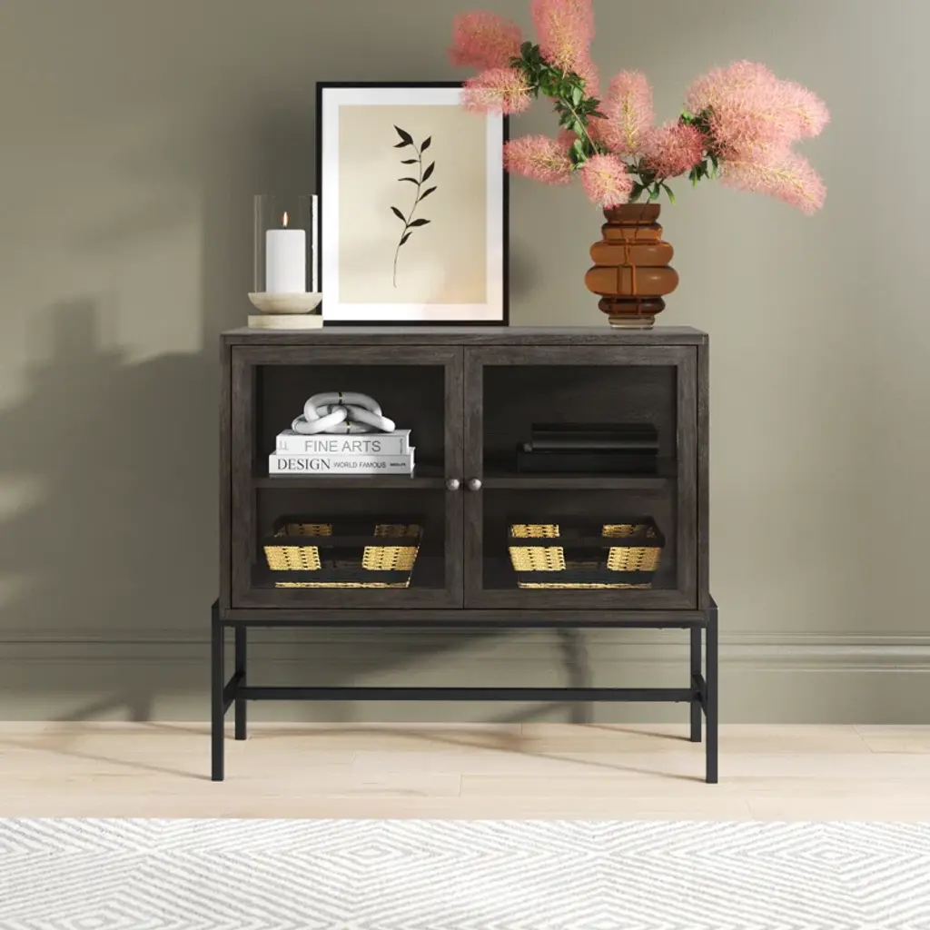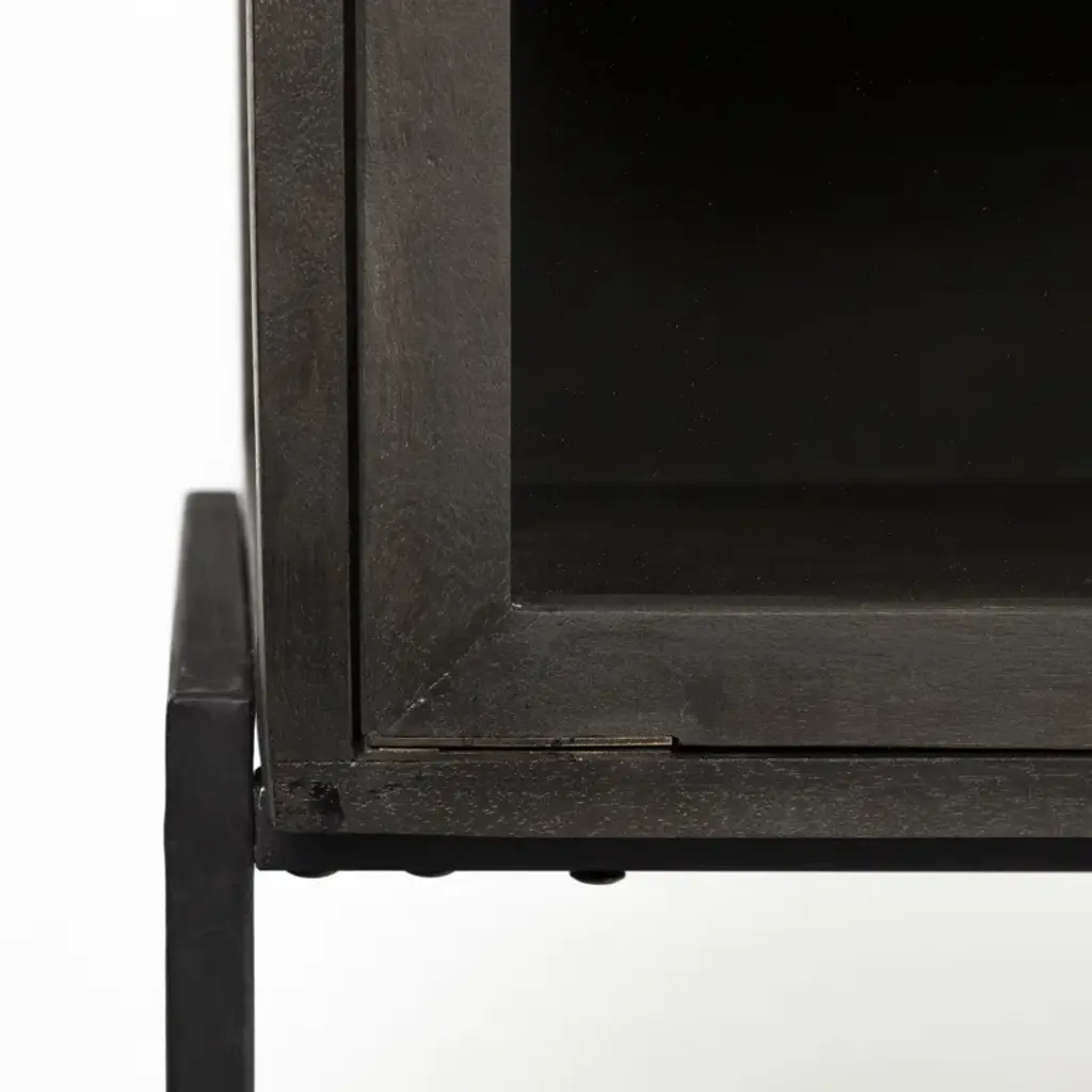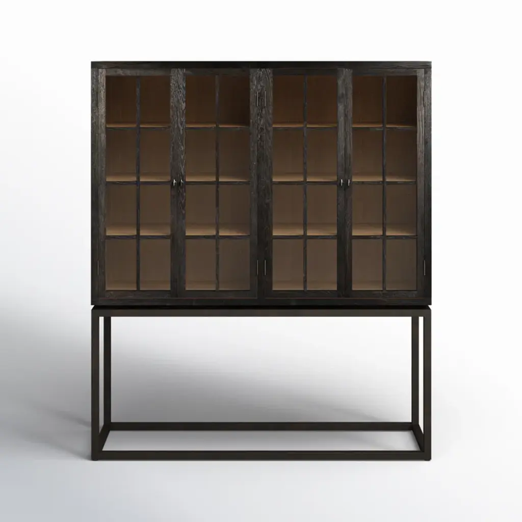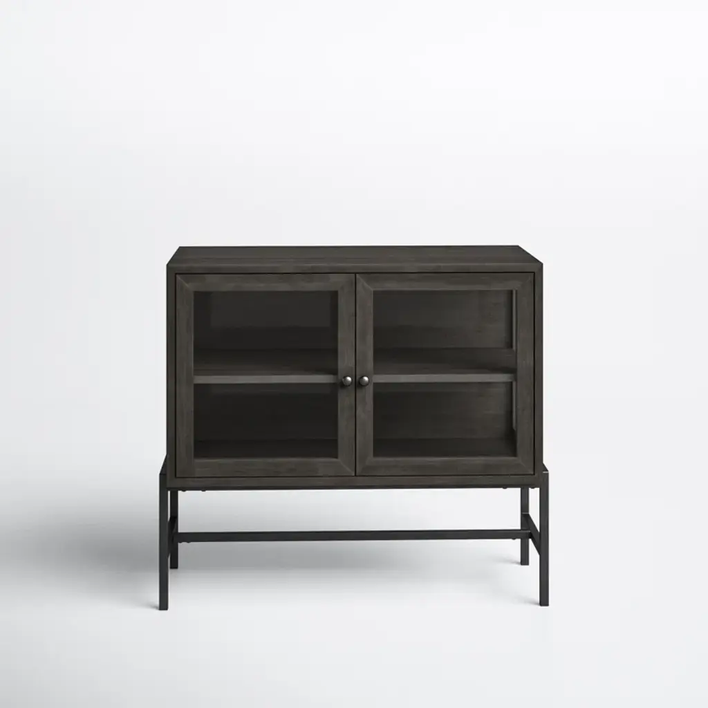 With its slim rectangular silhouette and clean lines, this accent cabinet is as visually appealing as it is functional. It's crafted from mango wood and sits on a four-legged solid iron base with cross bracing for added style and support. Up top, it's equipped with glass side panels and two clear, glass-lined doors. Inside, removable shelves offer ample storage space for everyday items, decorative objects, and anything else you want to show off while you stay organized. Plus, this accent cabinet easily comes together with only partial assembly.