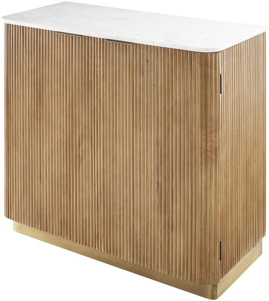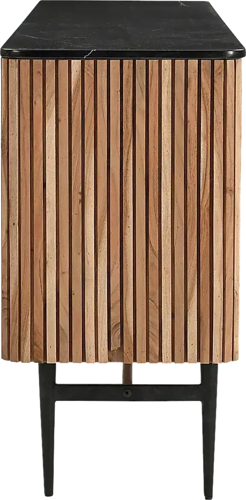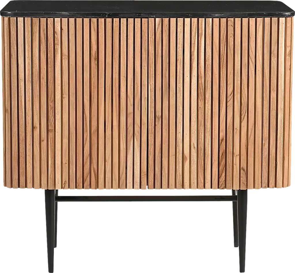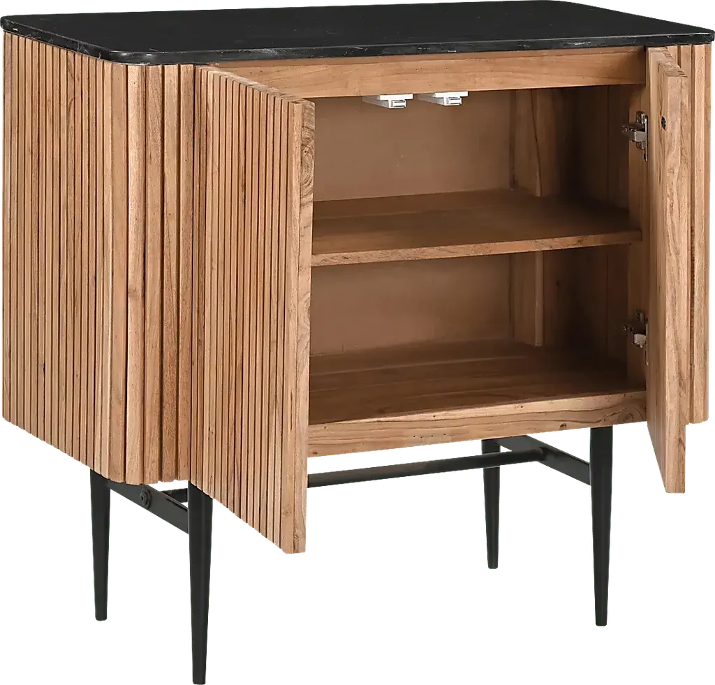 This two door Wentwirth accent cabinet perfectly captures the essence of rustic and industrial design. The frame is made of solid Acacia wood with a warm natural finish and features a carved linear design. The genuine black marble top adds a touch of elegance, while the black iron base provides the perfect balance to the color scheme and ensures stability. The clean-lined design is complemented by touch-latch hardware that opens the doors seamlessly, which are equipped with upgraded European hinges. The cabinet's interior is spacious, thanks to the single fixed shelf, offering flexible storage options. Customer assembly is required.