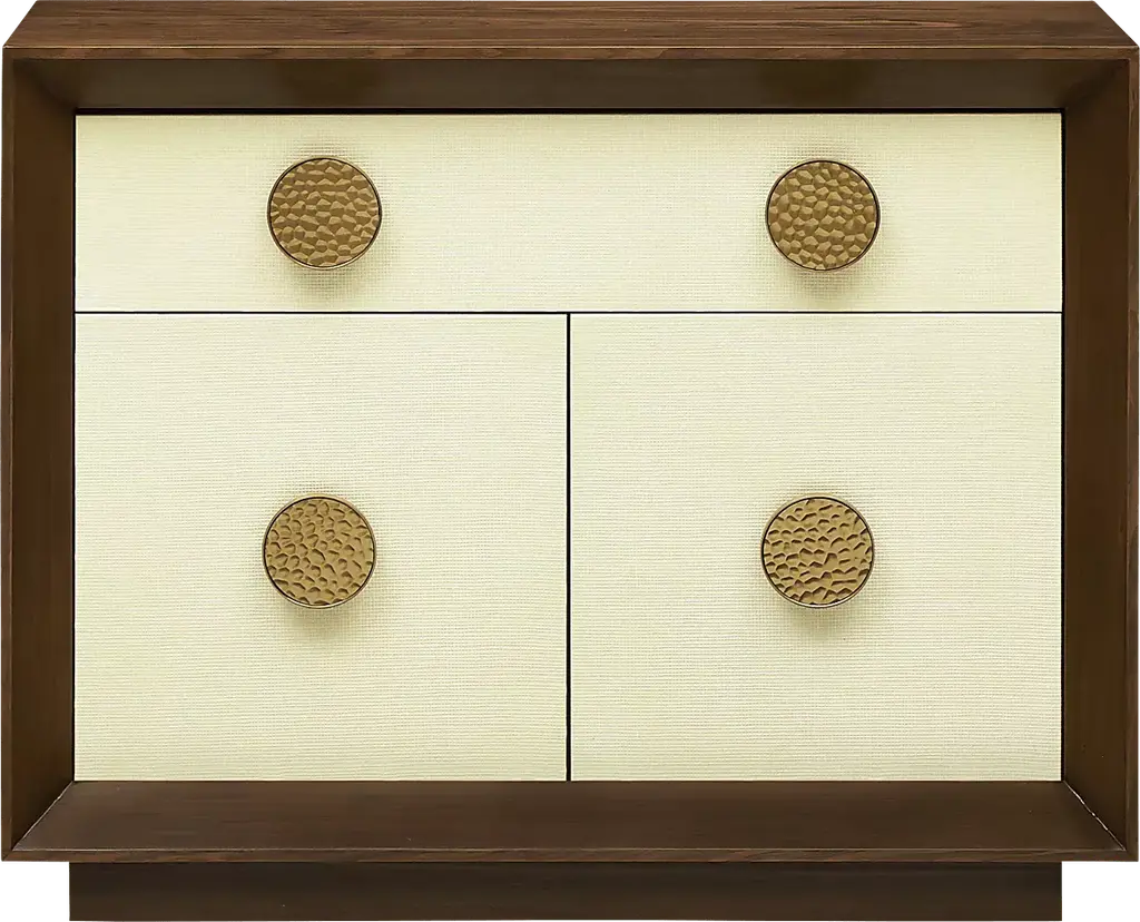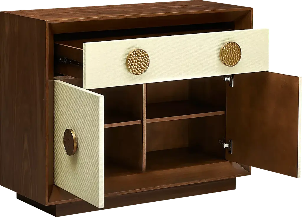Get ready to swoon over this show-stopping Wesseles cabinet with its walnut veneer and luxe, warm brown finish. But wait, there's more Feast your eyes on the cream-colored Raffia wrapped door fronts, adding just the right amount of texture and elegance. And check out that oversized gold hardware, that gives off a chic retro vibe. With two adjustable shelves and European hinges, it's a storage dream come true. Plus, the roomy drawer with extended glides gives you even more space to stash your treasures. Customer assembly is required.