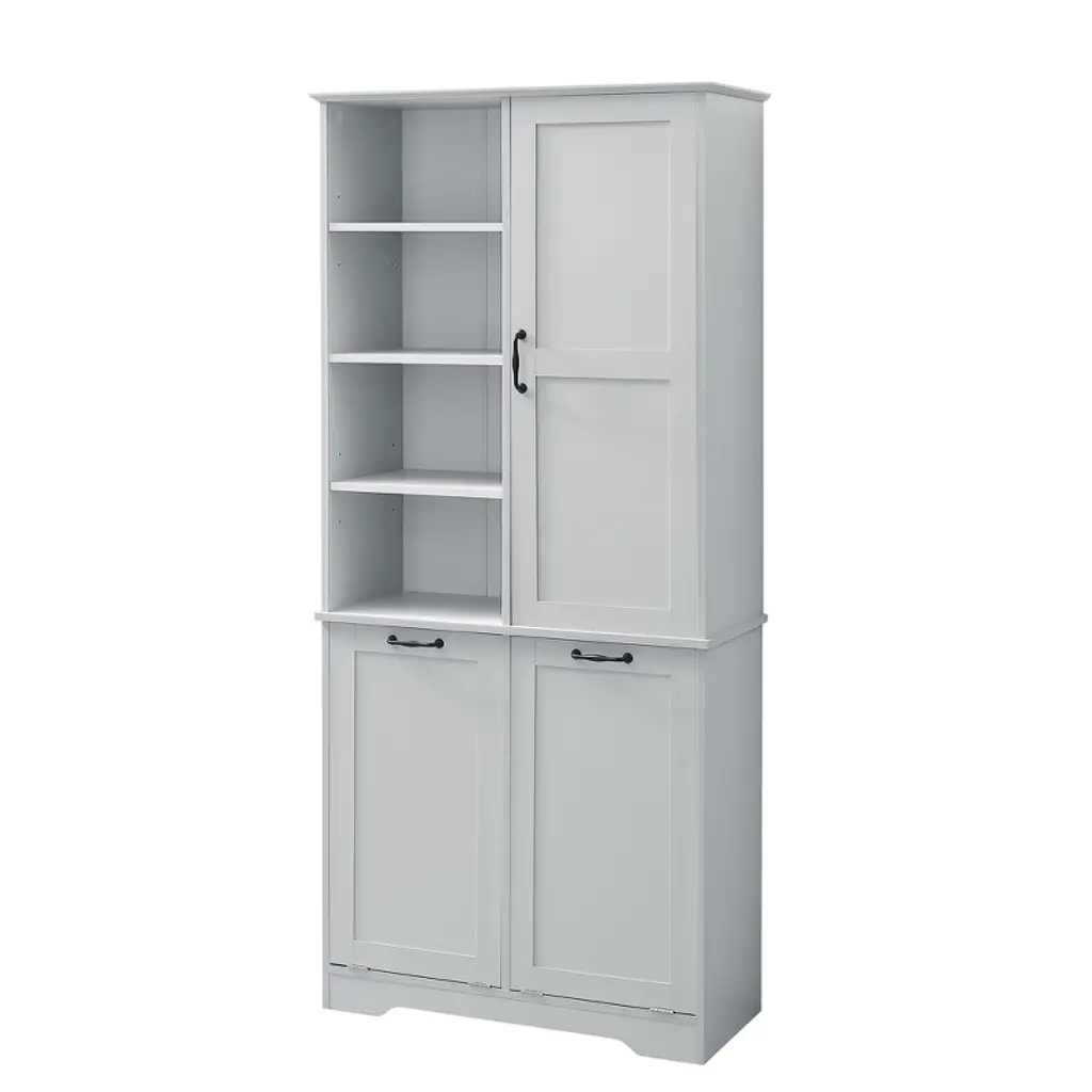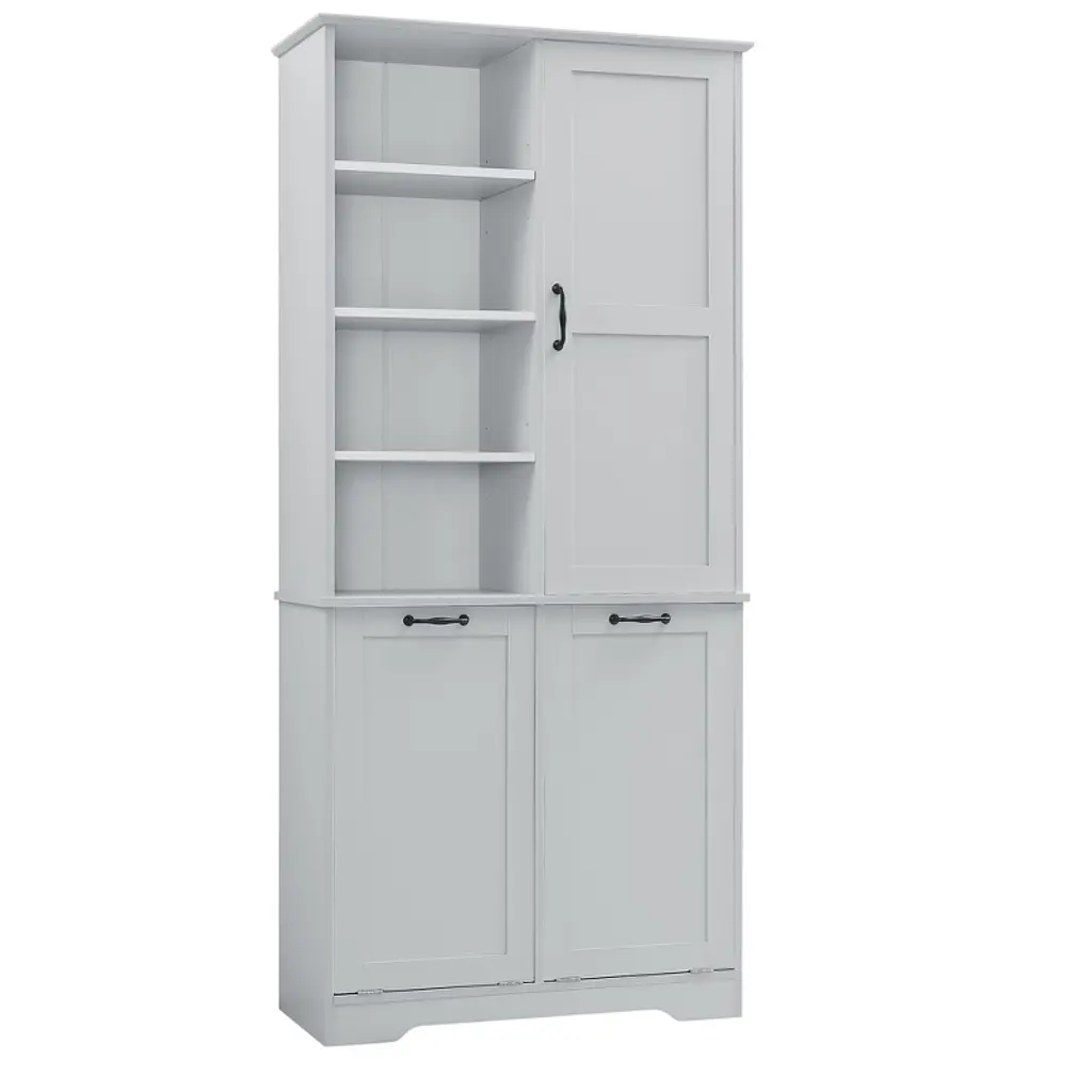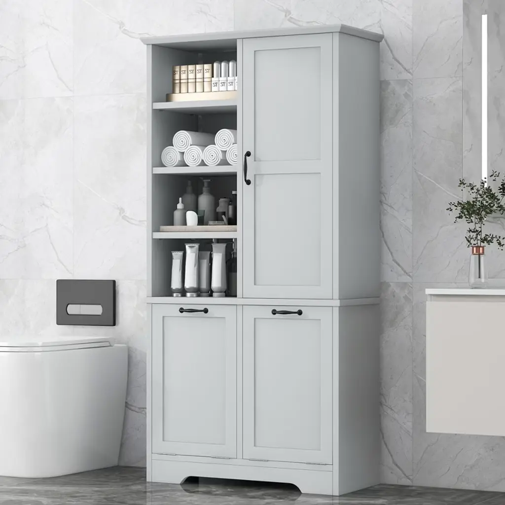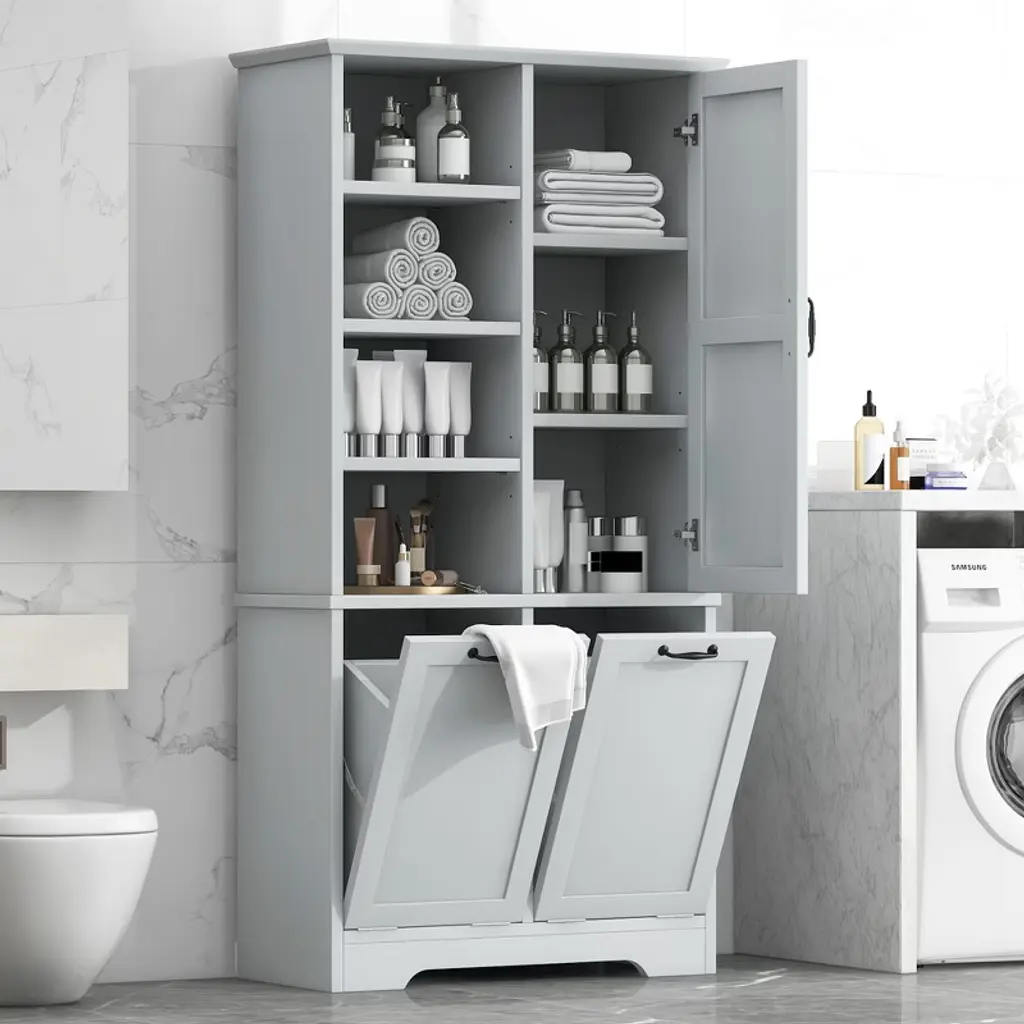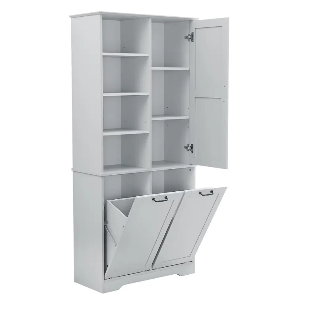 This versatile bathroom storage cabinet combines style and practicality, offering ample space for organizing your bathroom essentials. Constructed from high-quality MDF boards, the cabinet features a smooth, waterproof surface that is easy to clean. The sturdy metal door handle and hinges ensure durability. The cabinet includes four open shelves, perfect for storing decorations or daily necessities. Additionally, the right side is equipped with three layers of storage shelves, while two tilt-out laundry hampers offer convenient storage for towels, bath linens, and other items. The adjustable shelves allow for flexible storage, accommodating items of various sizes. This stylish and functional cabinet is an ideal addition to any bathroom or laundry room, seamlessly blending with a wide range of decor styles. For safety, the cabinet includes an anti-tipping device, securing it to the wall to prevent accidental tipping.