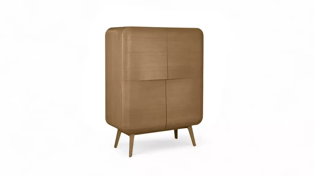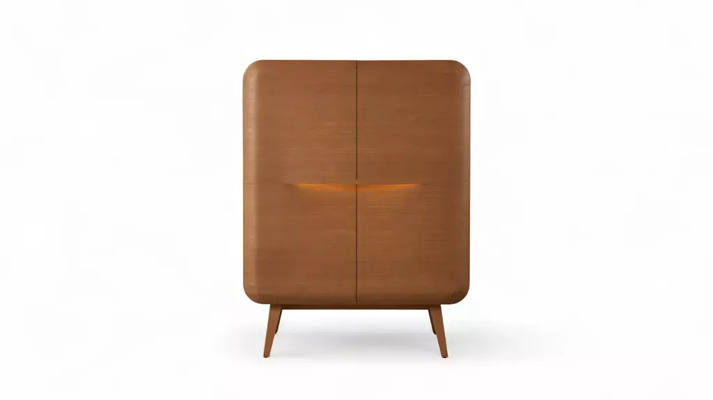 The Whisper China Cabinet, designed by Sacha Lakic, features a smooth, flowing line without any sharp angles. The only distinctive element is the undulating line, like a wave, that forms the handles of the cabinet doors, highlighted by a delicate line of light.