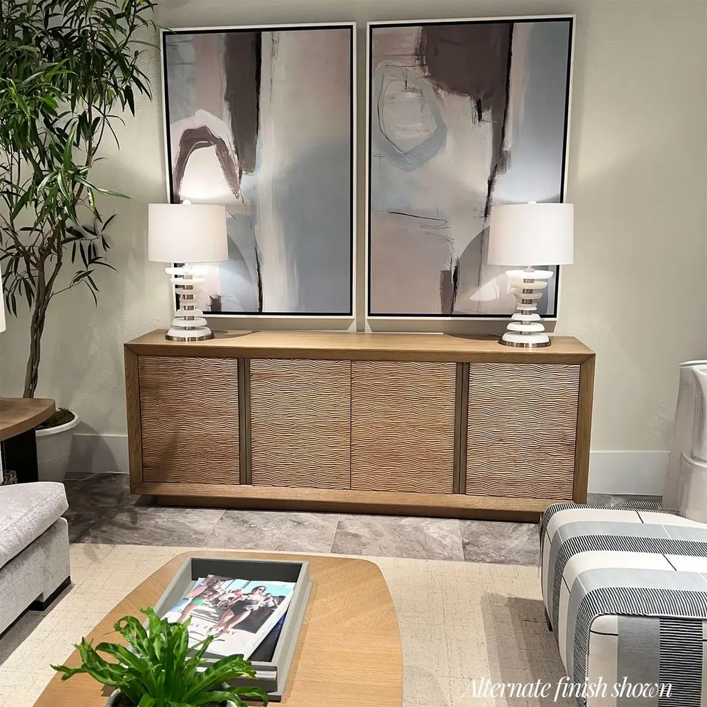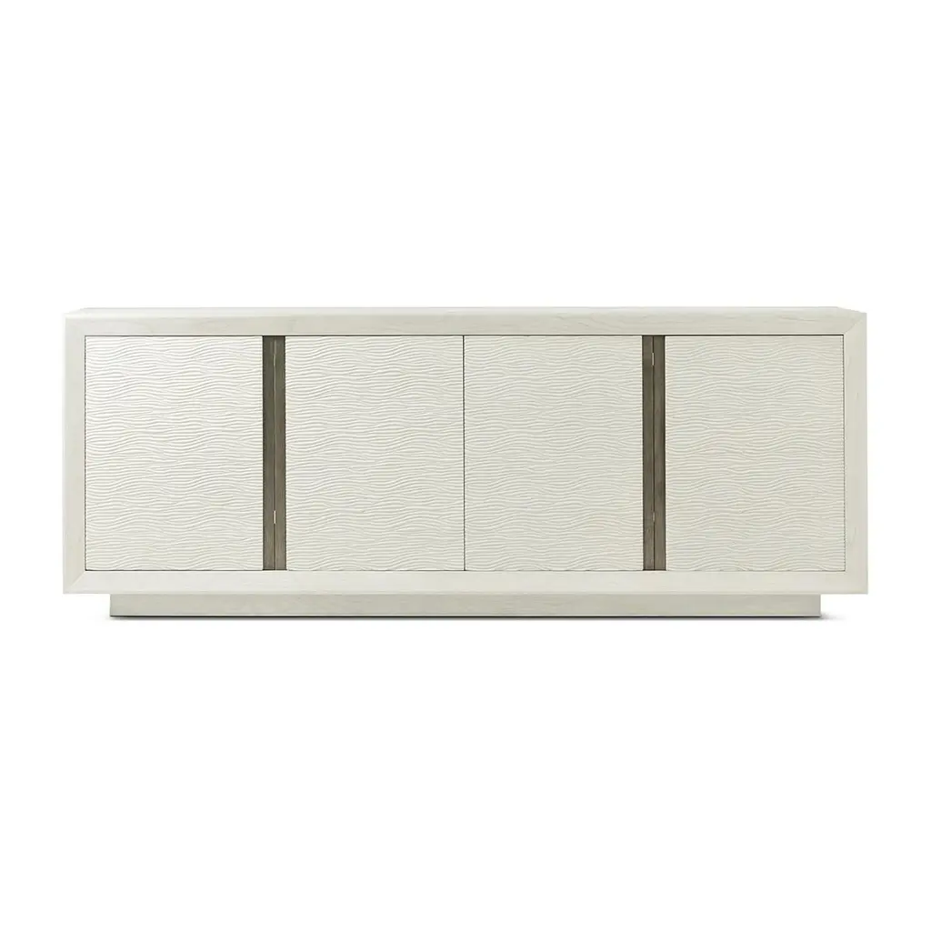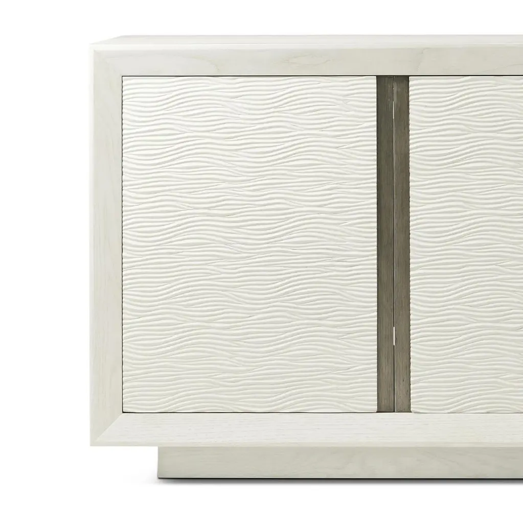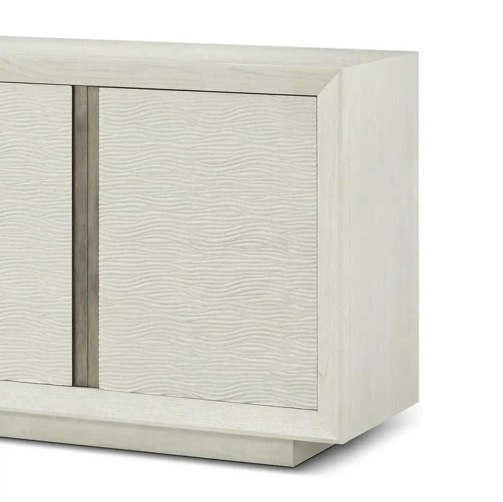 Its four doors feature a delicately carved wave-like pattern, complemented by recessed metal accents for a refined contrast. The Opal finish enhances its light, airy aesthetic, making it a sophisticated addition to modern interiors.Balancing style with functionality, this cabinet includes ventilation and discreet openings for seamless integration of electrical components. An adjustable shelf provides customizable storage, making it an ideal piece for both entertainment and display purposes. Inspired by Scandinavian and organic modern influences, this media cabinet is a perfect blend of minimalist design and natural textures.Dimensions: 90.25" W x 20" D x 34" H