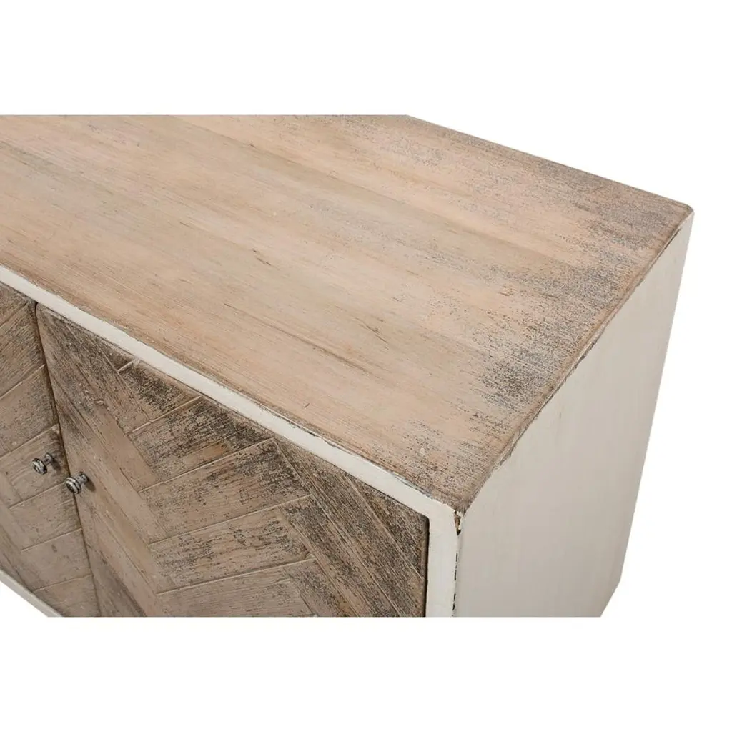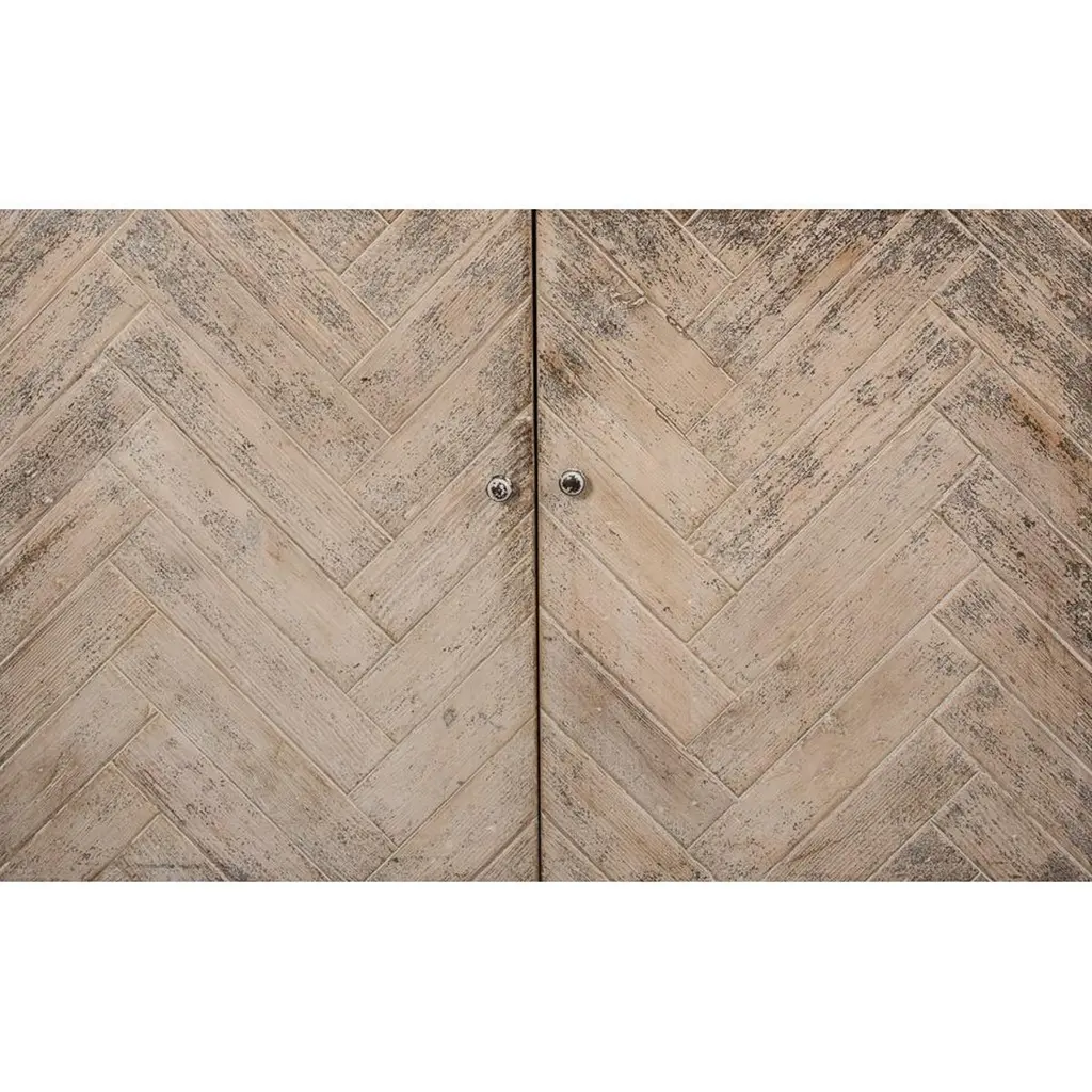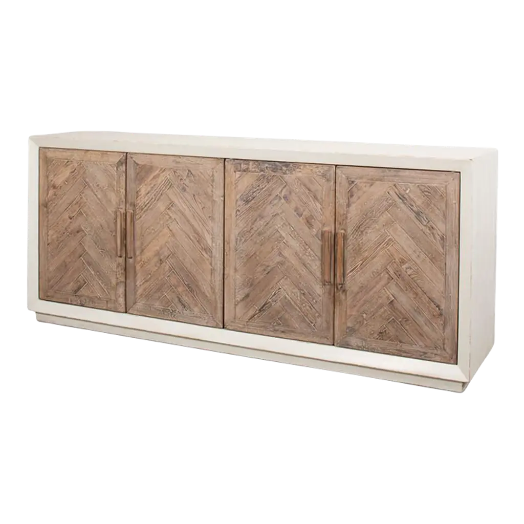 Elevate your home with the perfect blend of form and function. This sideboard boasts a timeless chevron herringbone pattern, adding a touch of artisanal sophistication to your space. With generous storage behind four sleek doors, it’s ideal for keeping your essentials tucked away yet accessible.Perfect for a mid-century modern or classic setting, this piece not only serves as a functional asset but also as a statement piece that complements your discerning taste. Made with reclaimed pine and finished in a distressed antique white frame with natural finished doors.Dimensions: 65" W x 17" D x 24" H