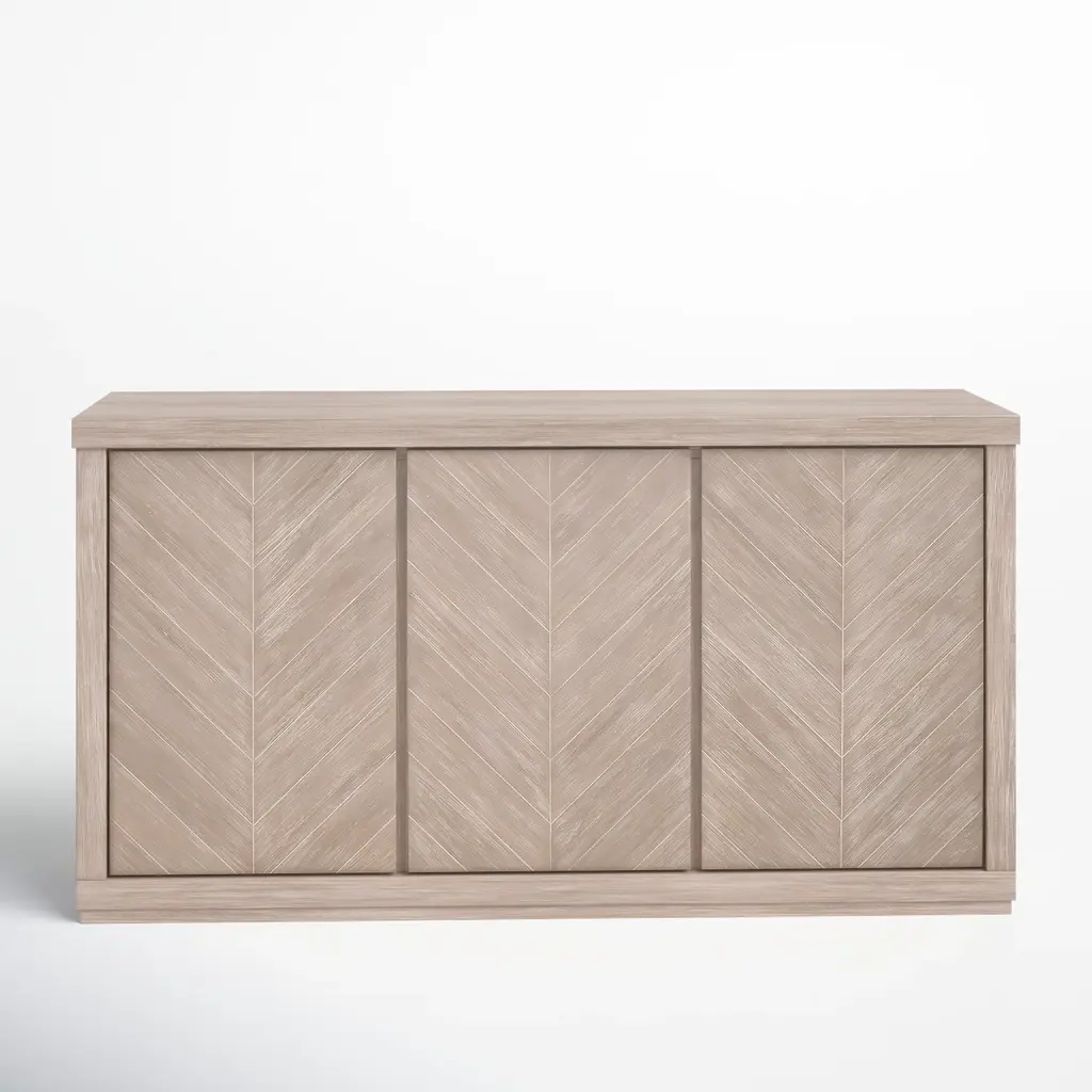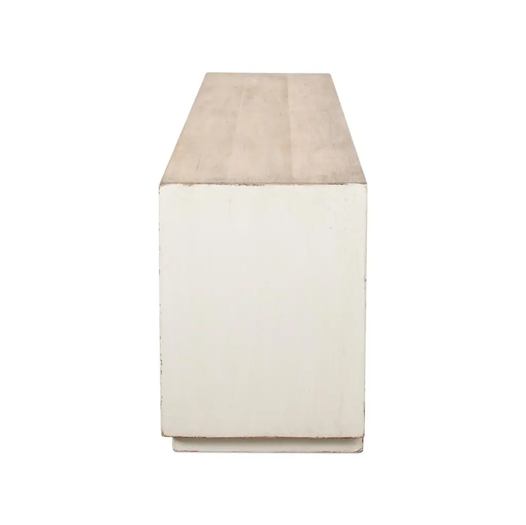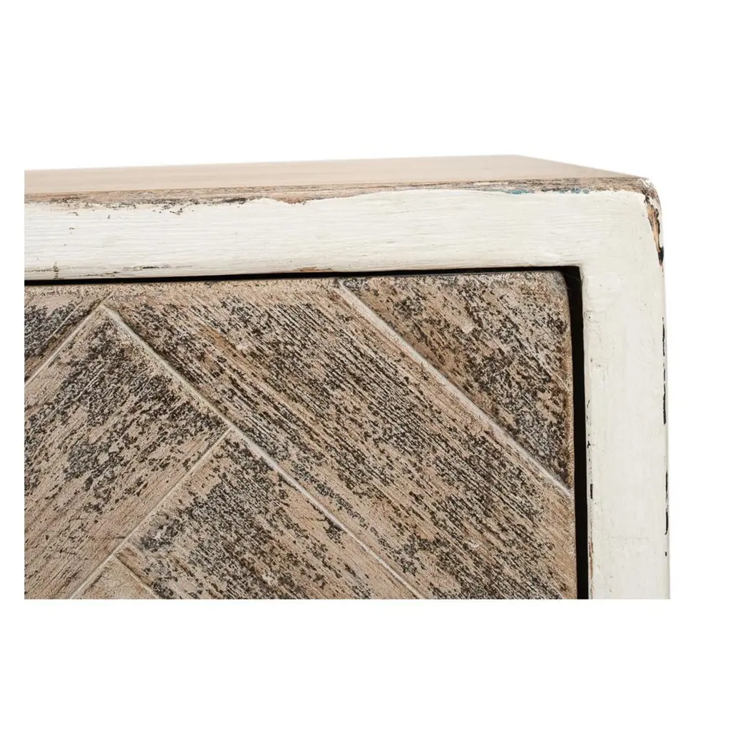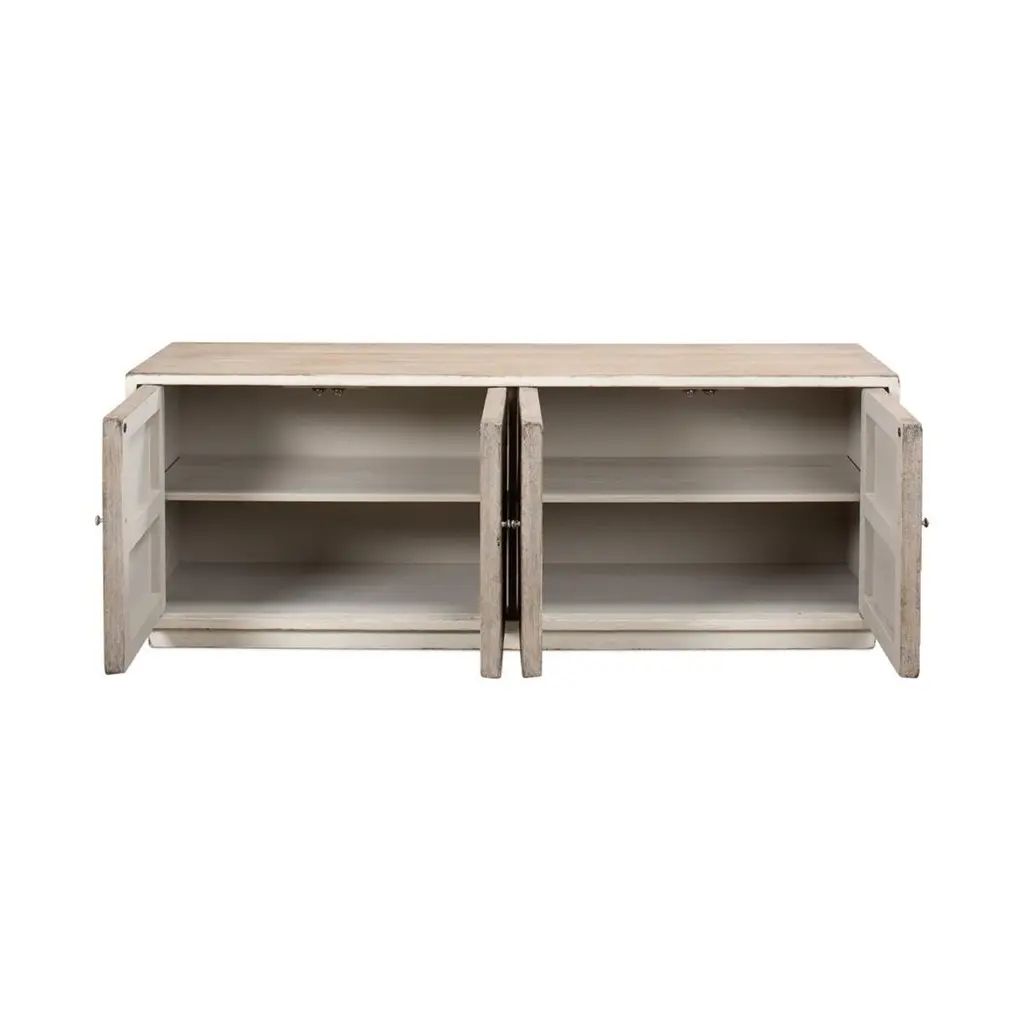 Elevate your home with the perfect blend of form and function. This sideboard boasts a timeless chevron herringbone pattern, adding a touch of artisanal sophistication to your space. With generous storage behind four sleek doors, it’s ideal for keeping your essentials tucked away yet accessible.Perfect for a mid-century modern or classic setting, this piece not only serves as a functional asset but also as a statement piece that complements your discerning taste. Made with reclaimed pine and finished in a distressed antique white frame with natural finished doors.Dimensions: 65" W x 17" D x 24" H