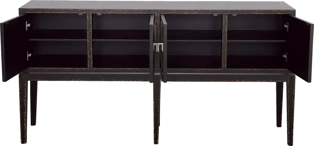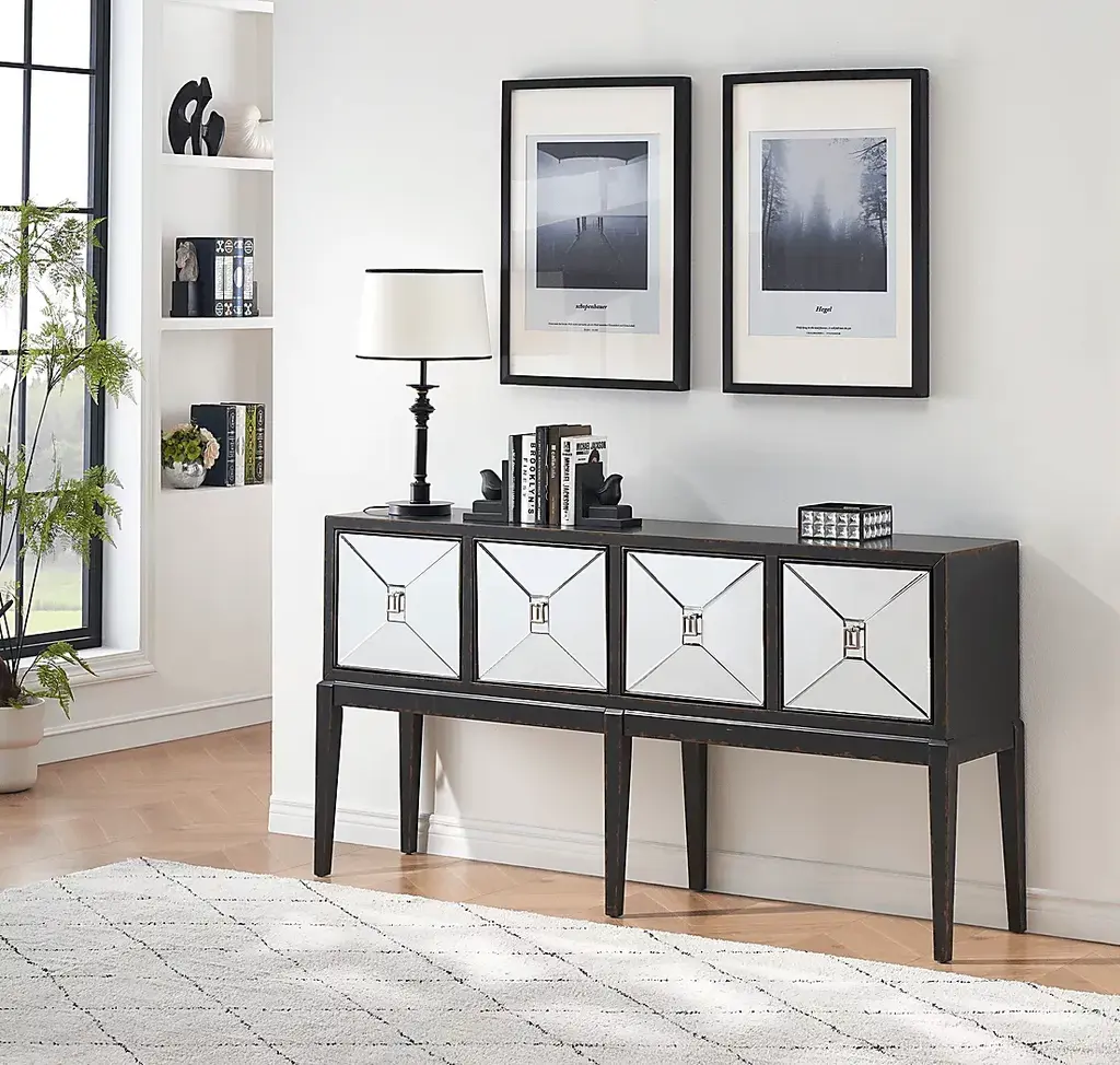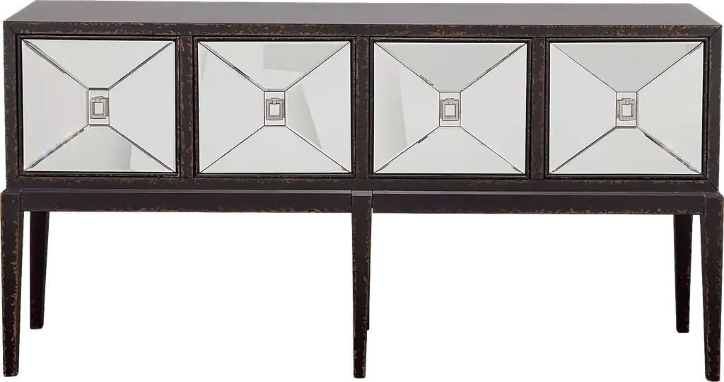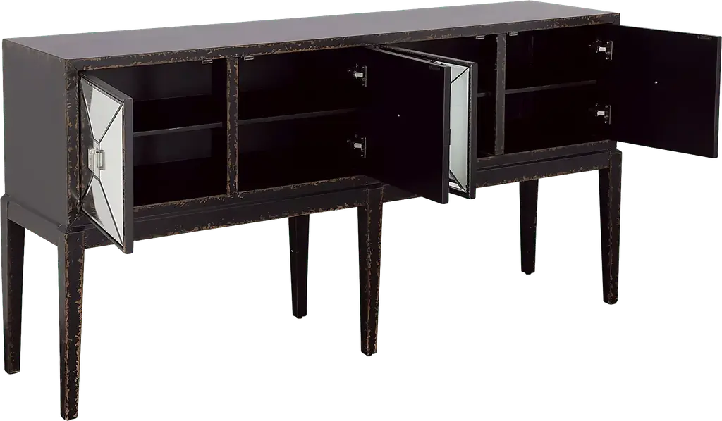 Chic and spacious, this Whitecrowe four door console makes the perfect addition to entryways, dining rooms, and living rooms. The textured black finish highlights the mirrored door fronts while the long slender tapered legs add a sophisticated touch. Behind each of the four doors, there is a fixed shelf that makes it easy to store a variety of items. Add your favorite lamp, family photos, and decor to the spacious top to create the perfect display. Customer assembly is required.