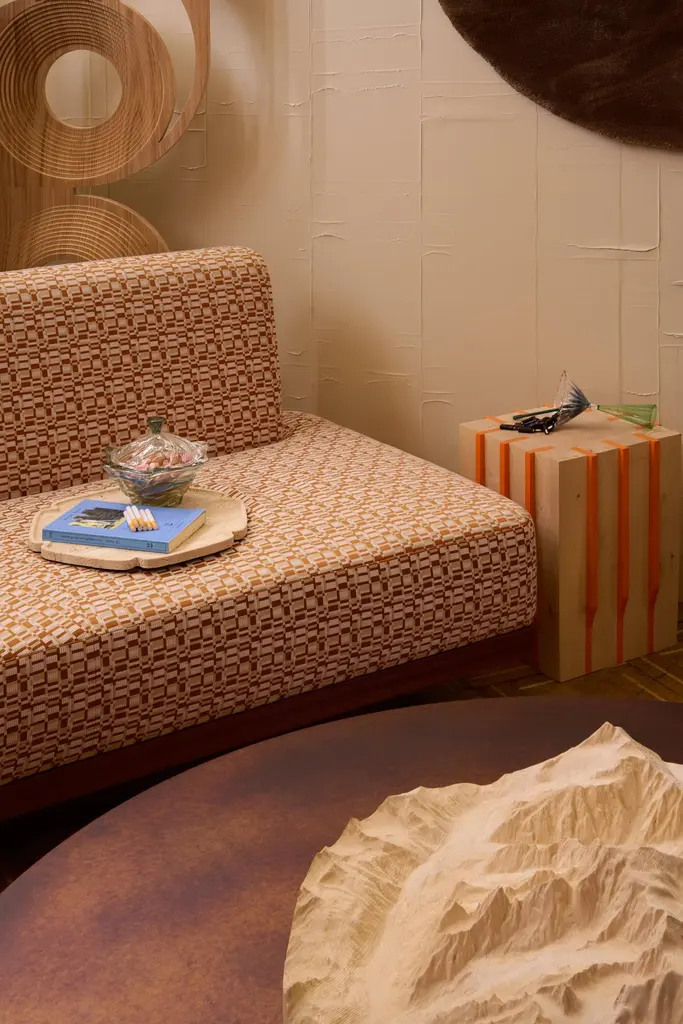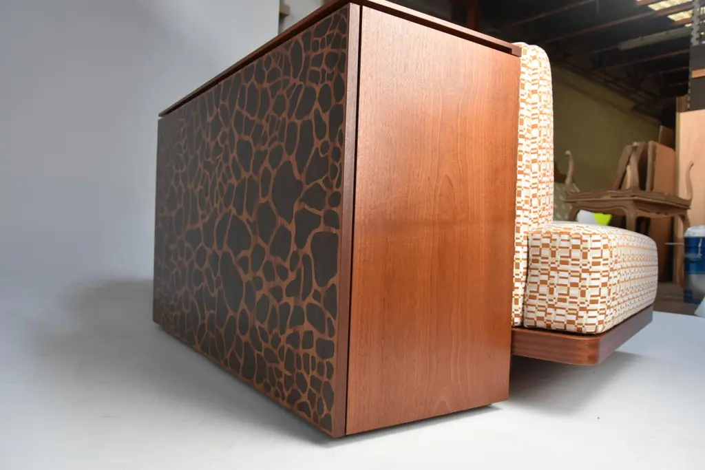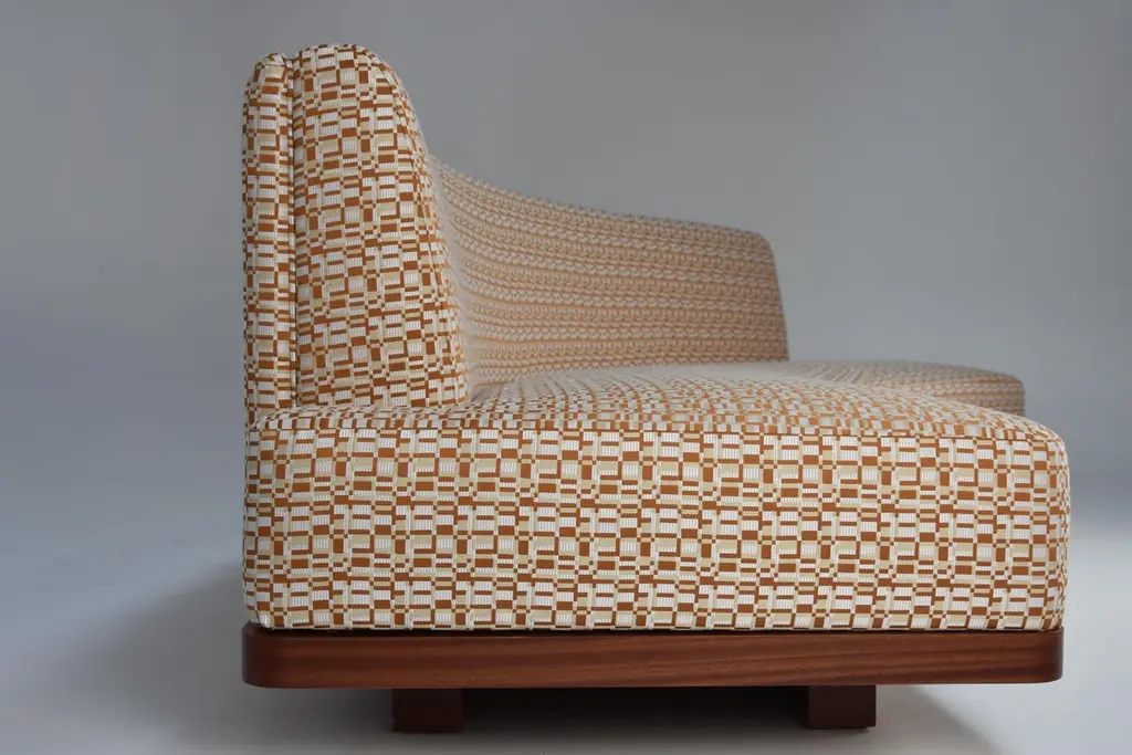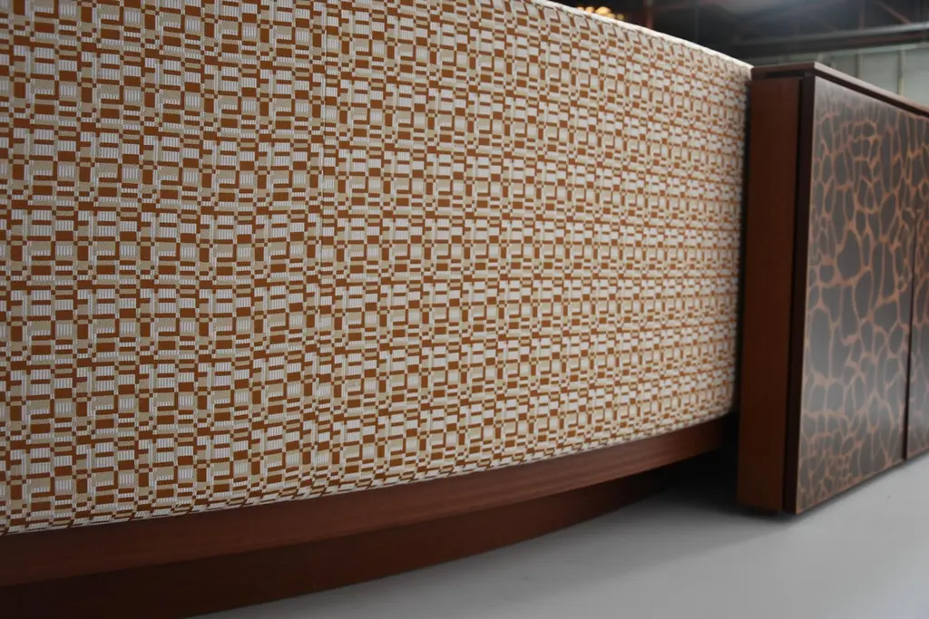 Sofa with back cabinet made of mahogany plywood featuring a giraffe-striped inlay, with two doors and a shelf. It comes with scatter cushions upon request and is upholstered in a fabric with a subtle check jacquard pattern blending three harmonious colors. This piece is ideal for complementing any decor with its geometric motif.