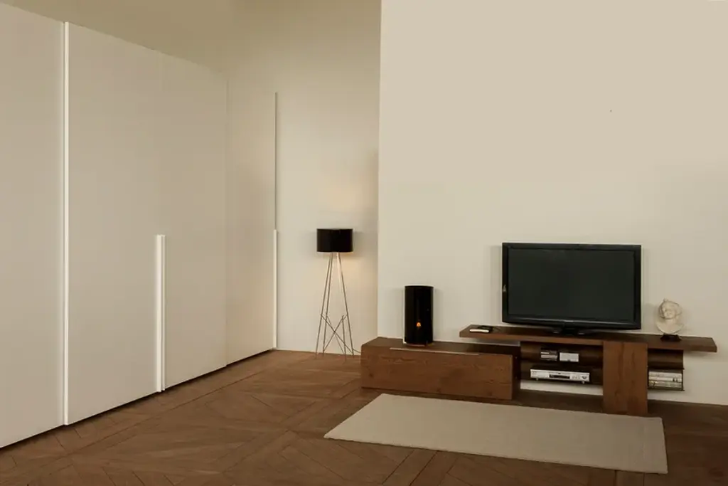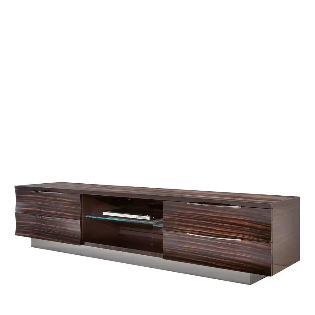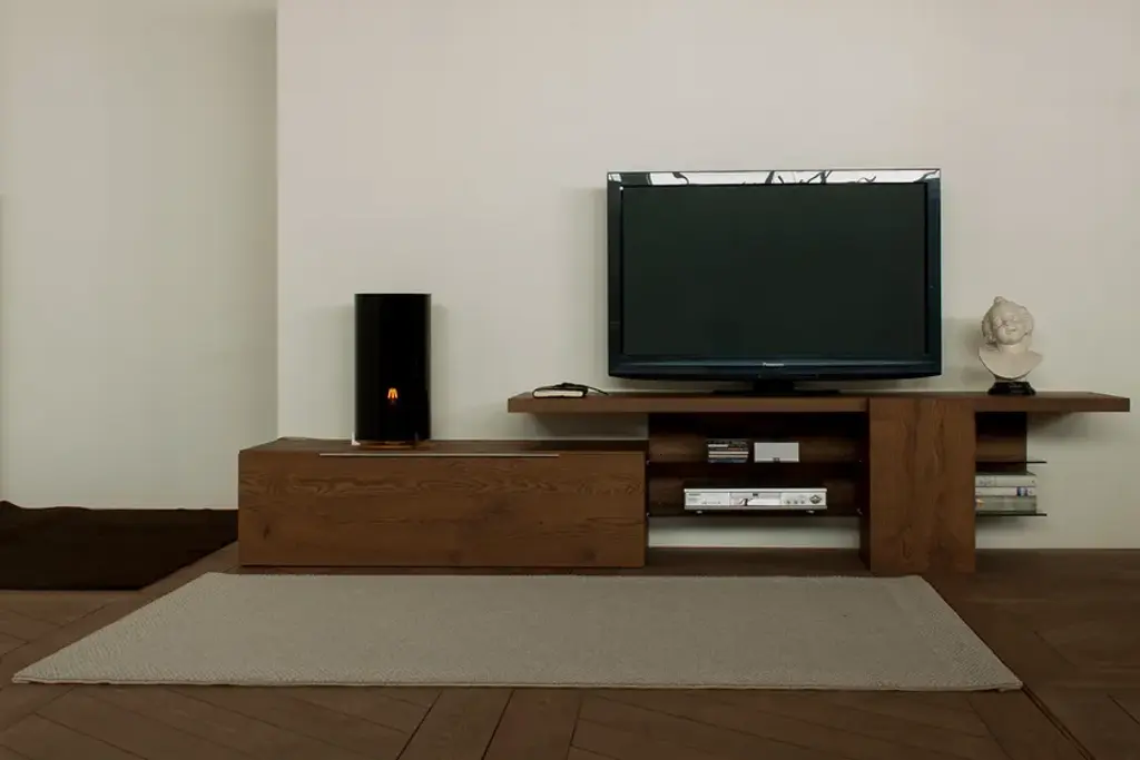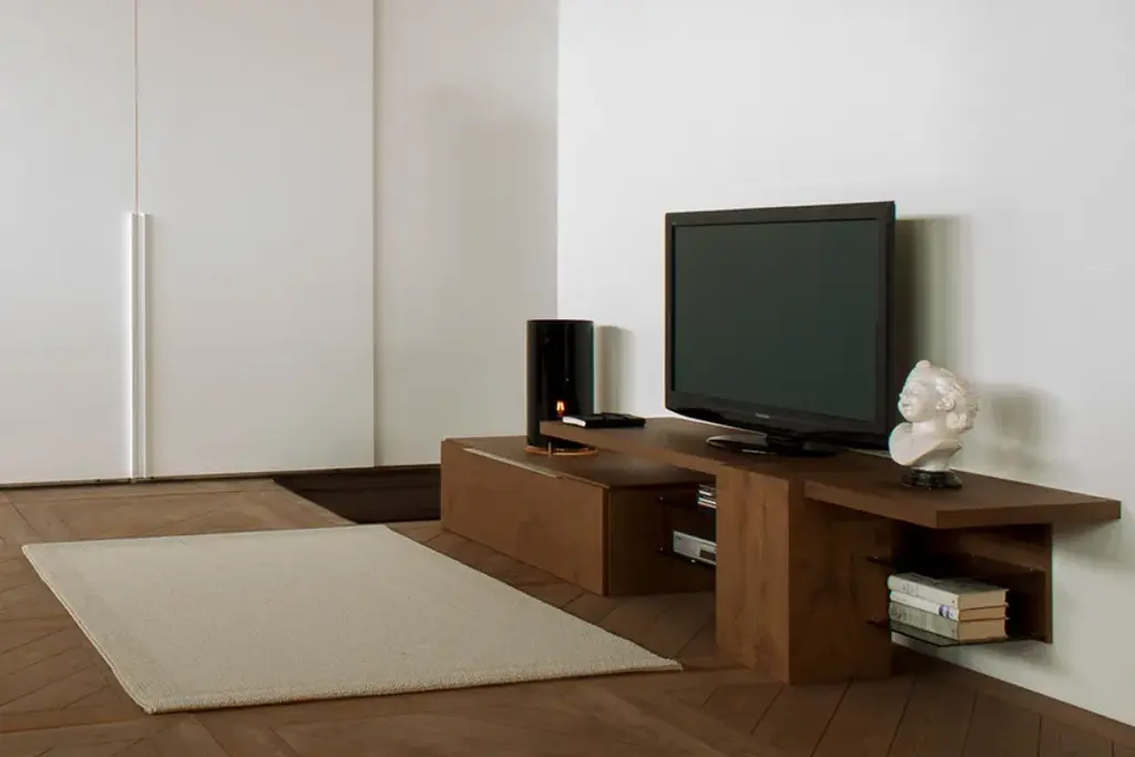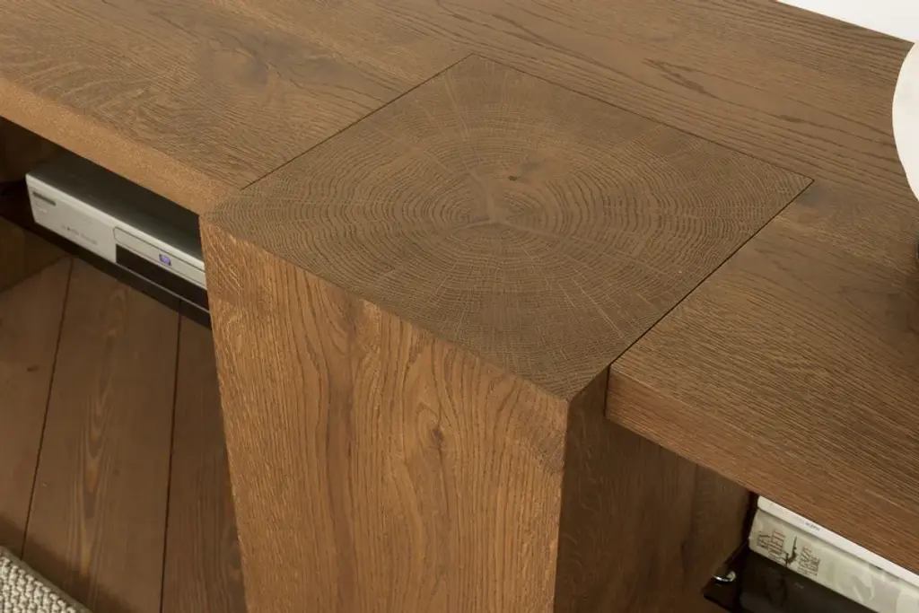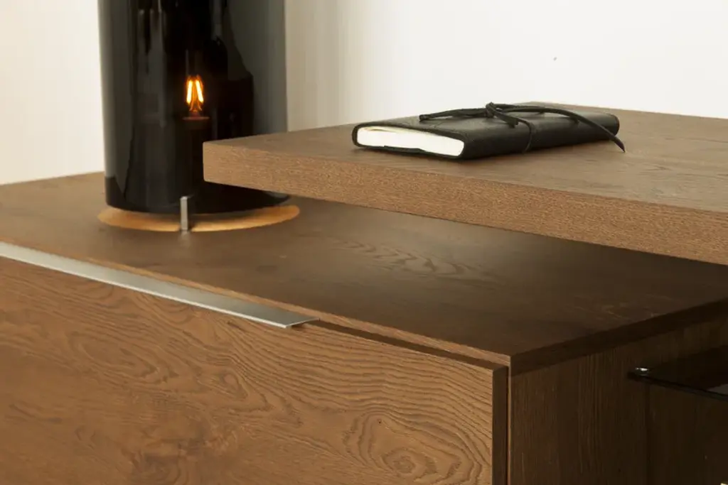 Wild is an oak TV cabinet with drawers.The central log is the pivot of this restrained but elegant composition, cutting the top. Combined with the wood panelling attached on the wall, it sustains the smoked glass shelves. The craftsman's hand creates the perfect match between the 45° cut elements and the horizontally cut of the veneer, highlighting the grain of the log, creating a single flat surface. The drawer is enriched by the blade shaped handle in anodized aluminium (M170 handle). The material used in this project is dark oak with knots colour 5310. The product is available in the variants of the Deodara palette.Manufacturing that shows the circular design of the trunk sections, diagonal joints that underline the veins' dynamism and the craftsman's skill, or logs that take shape and acquire meaning by subtraction of matter: thus Wild was born, a collection enhancing the beauty of natural wood. The collection includes furnishing for the living area, as well as ornaments and accessories to decorate walls, such as the Otto and the Pebble shelves.