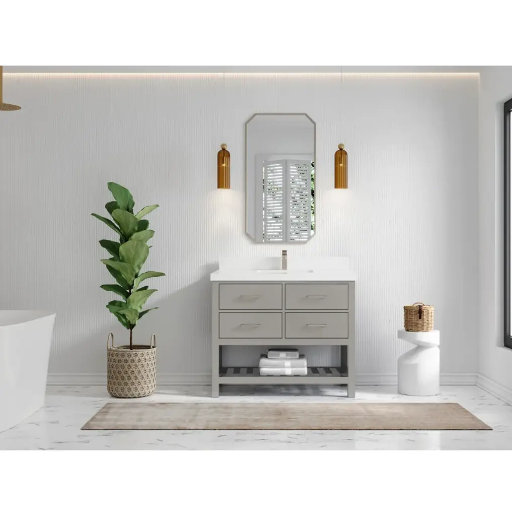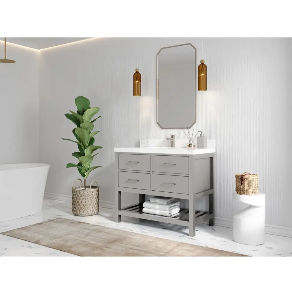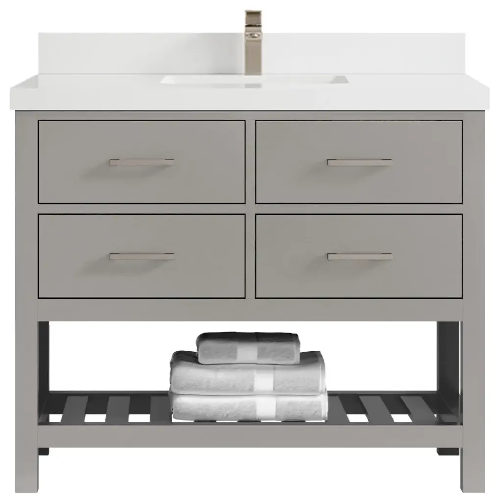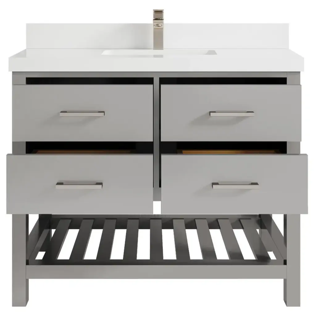 Willow Collections Parker 42 in. W x 22 in. D Vanity in Coventry Gray with 2 in White QuartzThe Santa Fe series is designed with a bold clean style and built with strong, top-notch materials including designer handles. It offers an abundance of storage space and state of the art technology with its soft closing drawers. Featuring a high-quality solid wood with a zero-emissions, finish that will last for years to come.SET INCLUDED: CABINET, COUNTERTOP WITH BACKSPLASH( PLEASE CONTACT US IF YOU NEED SIDESPLASH EXTRA COST), WHITE RECTANGULAR BASIN[S], HARDWARE (MIRROR NOT INCLUDED)Due to countertops slabs variations ��� you must be aware that the products you receive will not be exactly the same from piece to piece; each material will have different degrees of this variation; please keep this information in mind as you place your order because we cannot guarantee that your next order will match the previous one. Willow will not be held responsible for stone variationDetails:Product Finish: Coventry GrayMaterial: Solid Wood and E0 grade plywood ( NO MDF )Installation Type: FreestandingNumber of Sinks: OneNumber of Doors: 0Number of Drawers: 4 regular, 1 Open ShelfSink Installation: Under-mounted rectangle SINK(S)Hardware: Soft closing hinges and slidersHandles Finish: Brushed FinishCabinet Width: 41 inCabinet Depth: 21-1/2 inchHeight: CABINET ONLY - 34", CABINET WITH COUNTERTOP - 42", CABINET WITH TOP AND BACKSPLASH - 40"Faucet: NOT IncludedFaucet Hole(S): Comes with SINGLE hole faucetSink: White CUPC ceramic sinkVanity Top: 2 in White QuartzVanity Top Depth: 22 inVanity Top Width: 42 inBacksplash: 4 inLooking for different sizes and colors? We got it! please check our other listings. Size Availbale: 24", 30", 36", 42", 48", 60 Double/Single Sink(s), 72", 84" Color: White, Navy Blue, Gray, Lafaytee Green Countertop: Calacatta Quartz, Pure White Quartz, Empira White Quartz, Carrara Marble