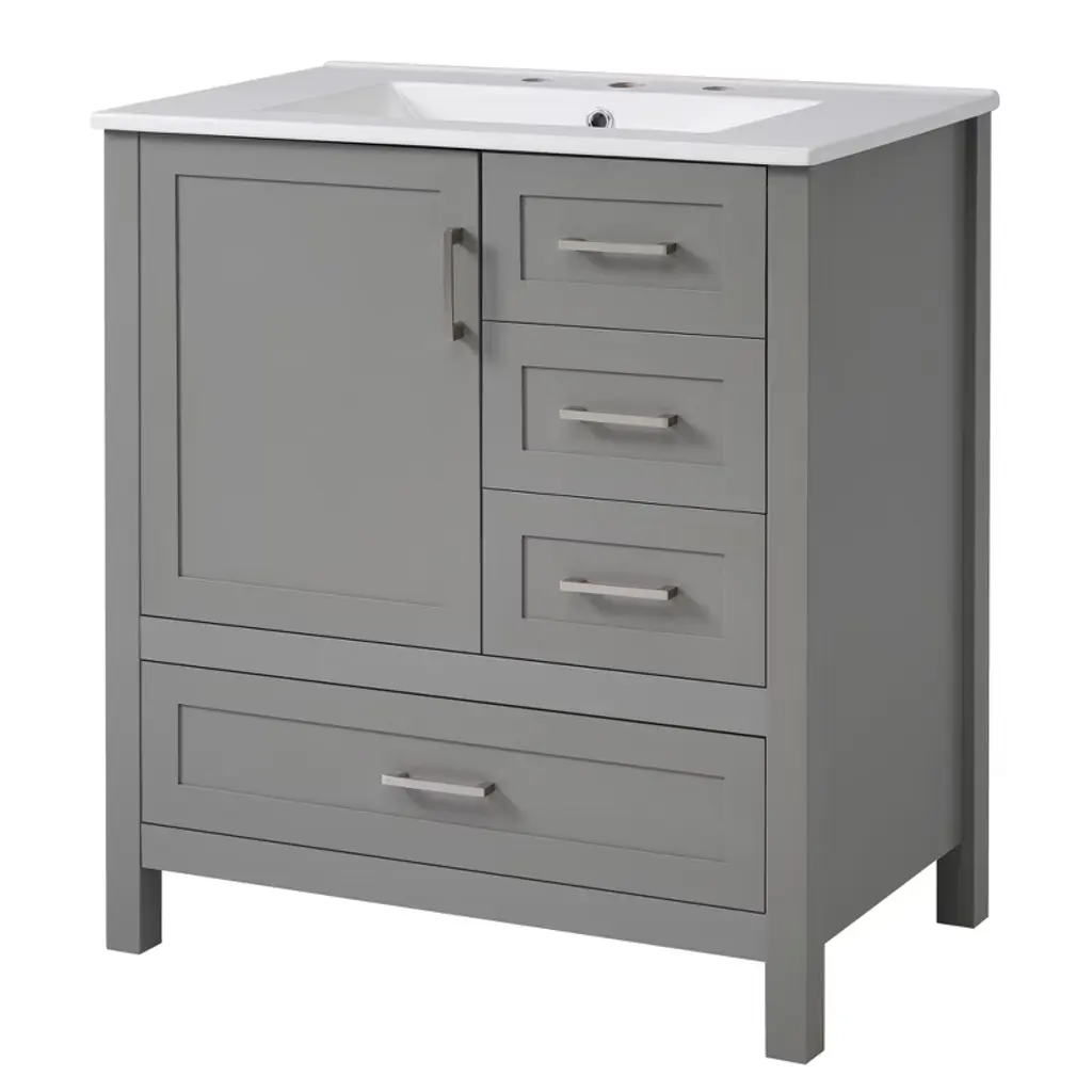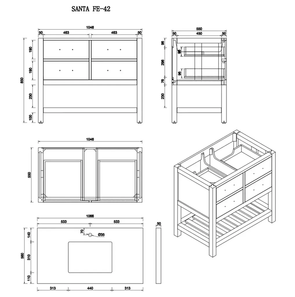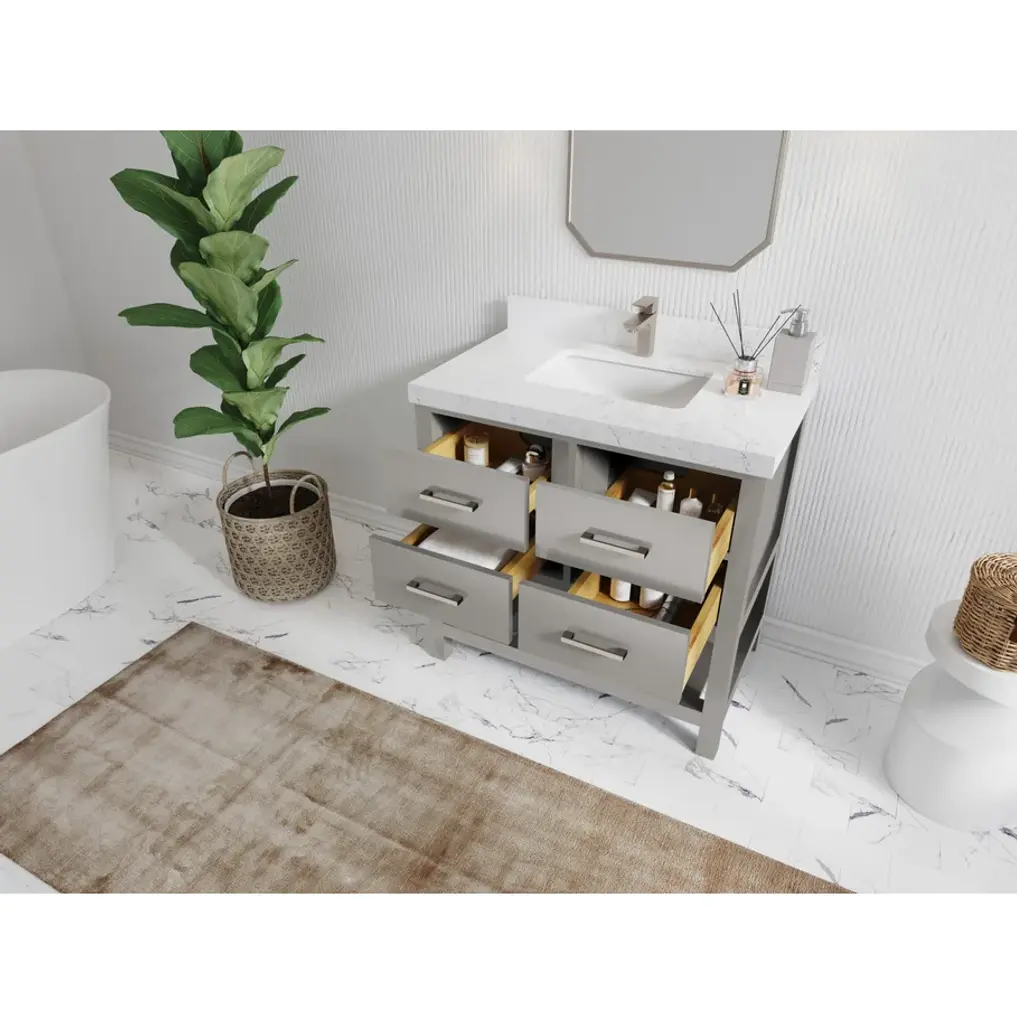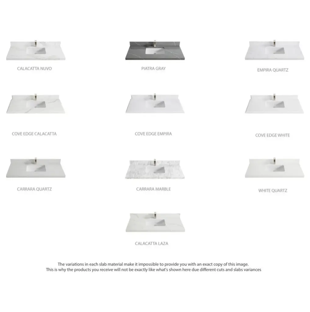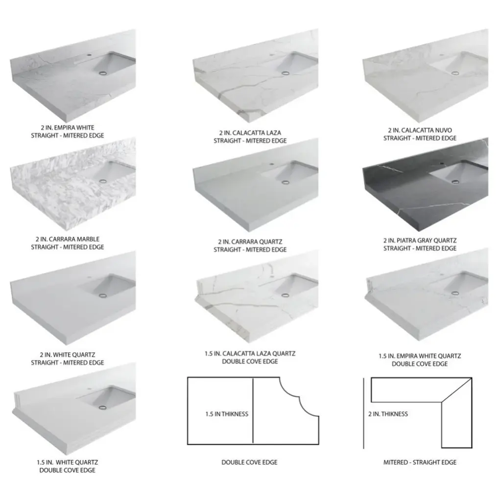 Willow Collections Parker 42 in. W x 22 in. D Vanity in Coventry Gray with 2 in White QuartzThe Santa Fe series is designed with a bold clean style and built with strong, top-notch materials including designer handles. It offers an abundance of storage space and state of the art technology with its soft closing drawers. Featuring a high-quality solid wood with a zero-emissions, finish that will last for years to come.SET INCLUDED: CABINET, COUNTERTOP WITH BACKSPLASH( PLEASE CONTACT US IF YOU NEED SIDESPLASH EXTRA COST), WHITE RECTANGULAR BASIN[S], HARDWARE (MIRROR NOT INCLUDED)Due to countertops slabs variations ��� you must be aware that the products you receive will not be exactly the same from piece to piece; each material will have different degrees of this variation; please keep this information in mind as you place your order because we cannot guarantee that your next order will match the previous one. Willow will not be held responsible for stone variationDetails:Product Finish: Coventry GrayMaterial: Solid Wood and E0 grade plywood ( NO MDF )Installation Type: FreestandingNumber of Sinks: OneNumber of Doors: 0Number of Drawers: 4 regular, 1 Open ShelfSink Installation: Under-mounted rectangle SINK(S)Hardware: Soft closing hinges and slidersHandles Finish: Brushed FinishCabinet Width: 41 inCabinet Depth: 21-1/2 inchHeight: CABINET ONLY - 34", CABINET WITH COUNTERTOP - 42", CABINET WITH TOP AND BACKSPLASH - 40"Faucet: NOT IncludedFaucet Hole(S): Comes with SINGLE hole faucetSink: White CUPC ceramic sinkVanity Top: 2 in White QuartzVanity Top Depth: 22 inVanity Top Width: 42 inBacksplash: 4 inLooking for different sizes and colors? We got it! please check our other listings. Size Availbale: 24", 30", 36", 42", 48", 60 Double/Single Sink(s), 72", 84" Color: White, Navy Blue, Gray, Lafaytee Green Countertop: Calacatta Quartz, Pure White Quartz, Empira White Quartz, Carrara Marble