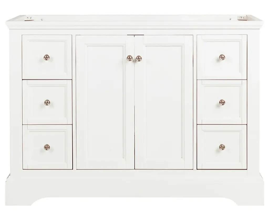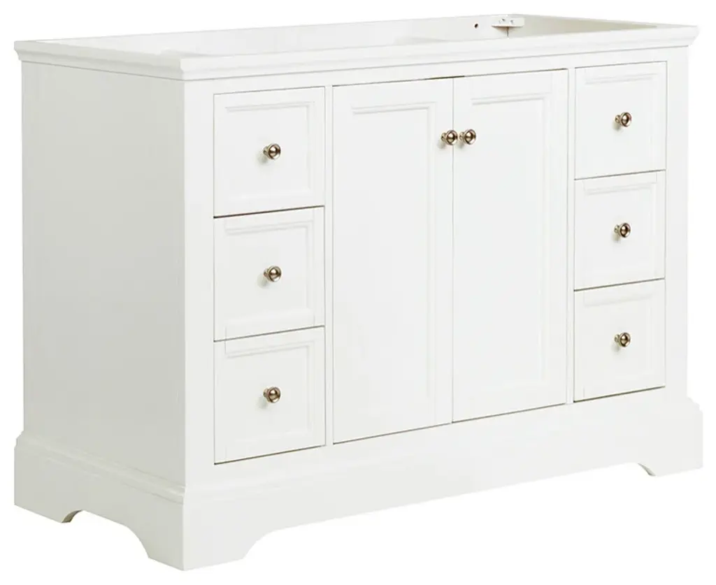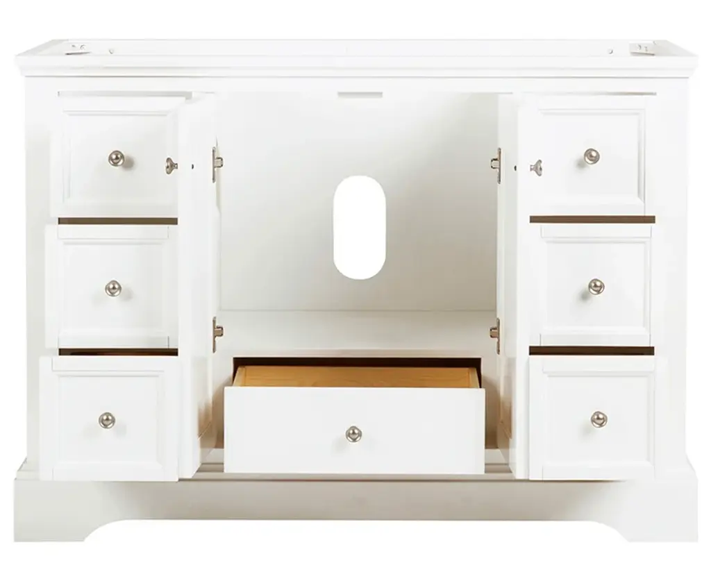 With its sophisticated textured White finish, the Windsor Traditional Freestanding Bathroom Cabinet features top-to-bottom details that elevate its beauty; Cavetto crown molding graces the top, while the toe kick with elegant stacked base molding adds the perfect finishing touch. The shaker-style flat panel door at the center, opens to reveal a roomy compartment for organizing products of varying sizes, with a lower shelf that's ideal for hand towels. Spacious, soft closing drawers down both sides provide ample storage space for all of your bathroom essentials. The dovetail drawers are solid pine with a clear coat finish. The soft-close drawers and door feature distinctive brushed nickel pulls. This lovely cabinet will enhance any decor and is available in multiple sizes and finishes. It includes installation hardware.Features:Dimensions of Cabinet: 47.8"W x 20.3"D x 33.5"HMaterials: Solid Wood Frame w/ MDF PanelsSingle Hole Faucet Mount2 Soft Closing Doors7 Soft Closing Drawers (1 Concealed in Main Cabinet)Solid Pine Dovetail Drawers w/ Clear Coat FinishBrushed Nickel HandlesCavetto Crown MoldingStacked Base Molding w/ ToekickIncluded: Main Cabinet and Hardware