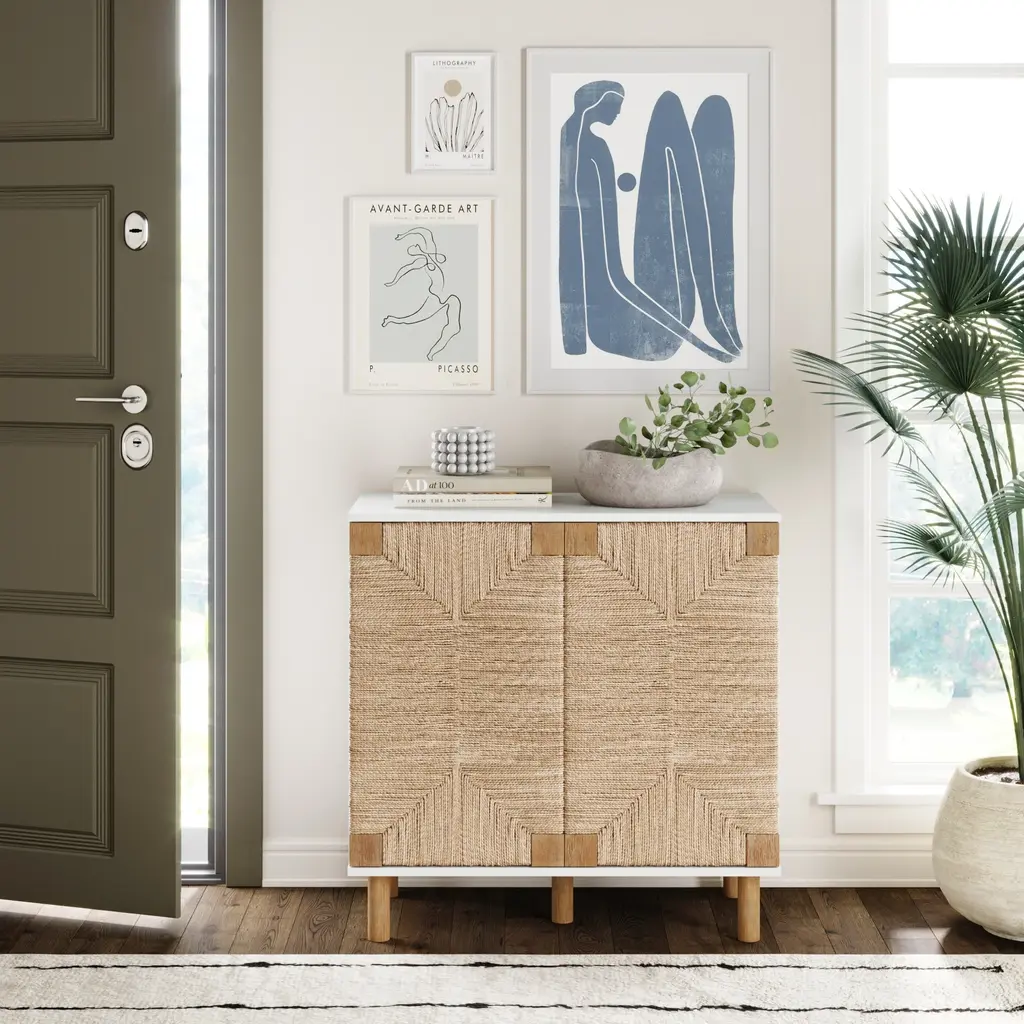 Say hello to Beacon, the perfect textured storage cabinet. A warm white finish is paired with push-latch natural seagrass cabinet doors for the an on-trend look that fits right in with any decor. An adjustable shelf gives you plenty of space to store records, books, or anything else you want to keep tidy and out of sight; or pair two side-by-side for extra storage. The handcrafted natural finish means some slight variations may occur.
