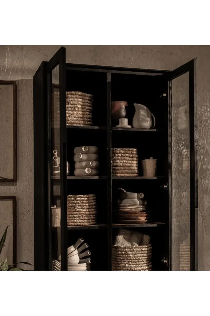 The high charcoal cabinet from the Karma collection is crafted from reclaimed wood, from a very high quality. Thanks to its iron frame, glass doors and high number of shelves, the cabinet is a practical and high-quality piece of furniture with a stylish, vintage industrial feel. Perfect to showcase all your treasures.