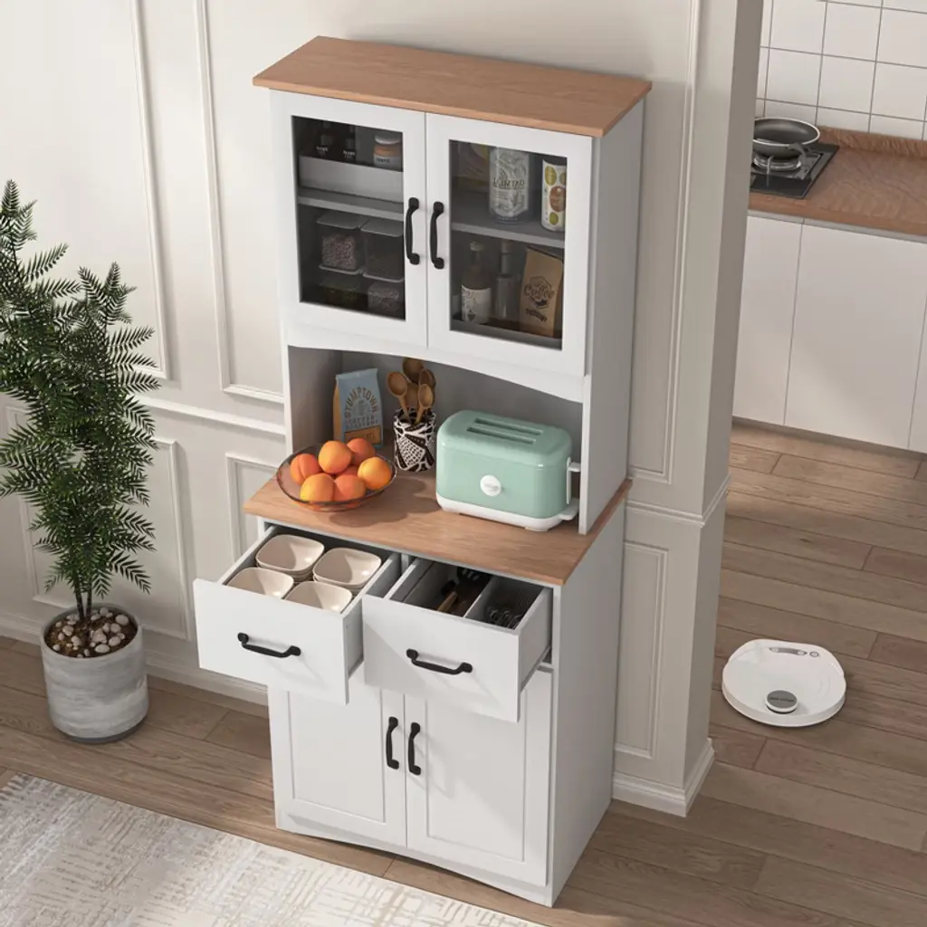 Wooden Kitchen Cabinet White Pantry Room Storage Microwave Cabinet With Framed Glass Doors And Drawer