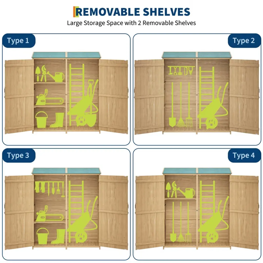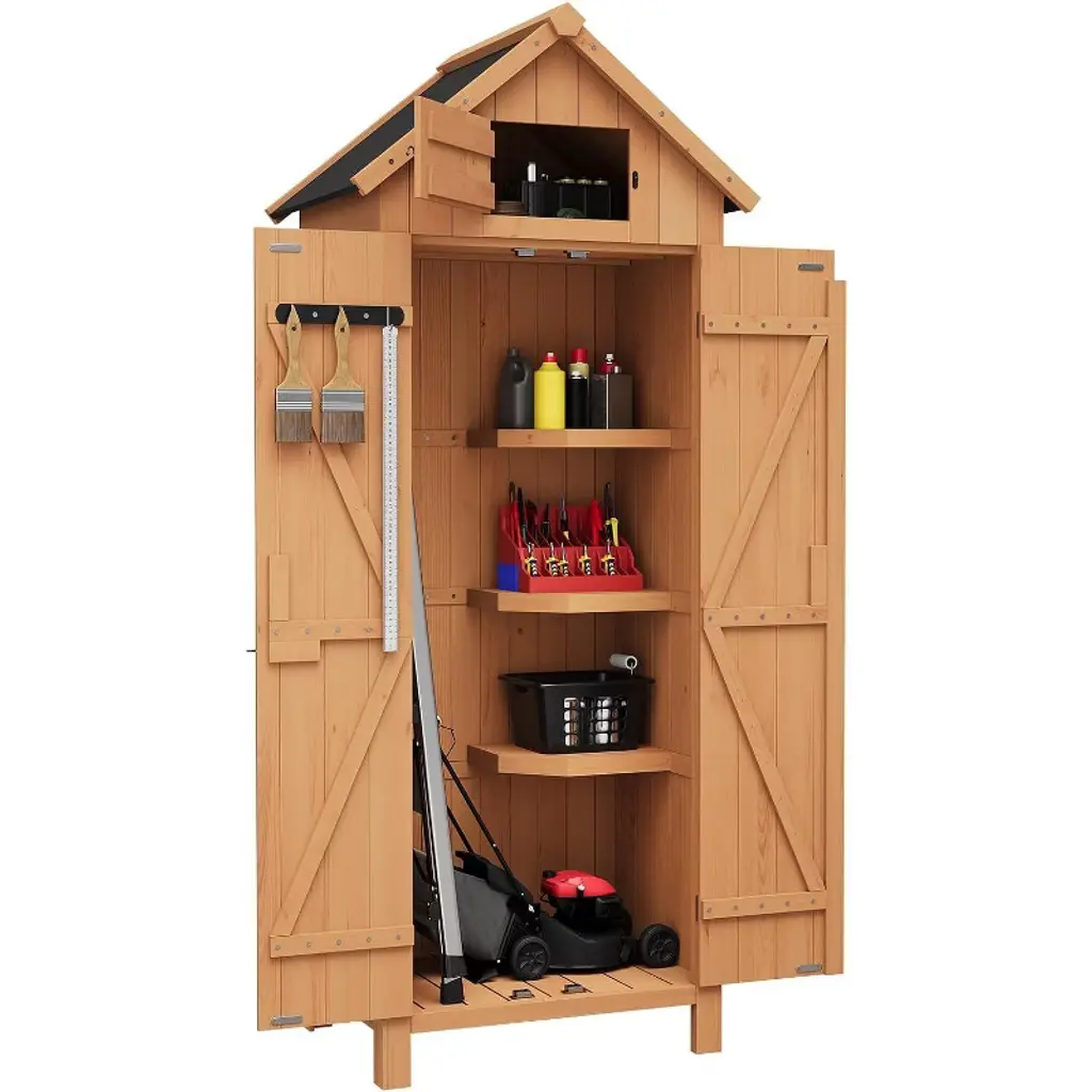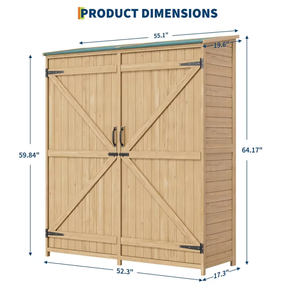 Organize your outdoor space effectively with this durable Wooden Storage Cabinet. Constructed from high-quality, weather-resistant fir or cedar wood, it naturally combats decay and endures sun and rain, featuring an attractive rustic finish. The key to its protection is the sloped asphalt-coated waterproof roof, designed to shed water efficiently and block harmful UV rays, keeping your tools, pool supplies, and gear dry and safe year-round. Maximize storage flexibility with two removable and adjustable shelves plus a spacious lower compartment, perfect for organizing everything from small gardening gloves and power tools to tall rakes and shovels. Security is assured with lockable double doors and sturdy metal handles, while wide openings ensure convenient access. Easy to maintain with a cleanable surface and occasional sealant, this versatile cabinet (approx. 55"D x 20"W x 64"H, 83 lbs, assembly required) is the ideal solution for decluttering garages, yards, patios, gardens, or poolside areas.
