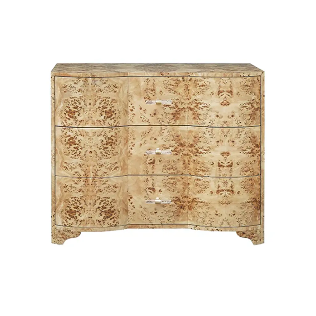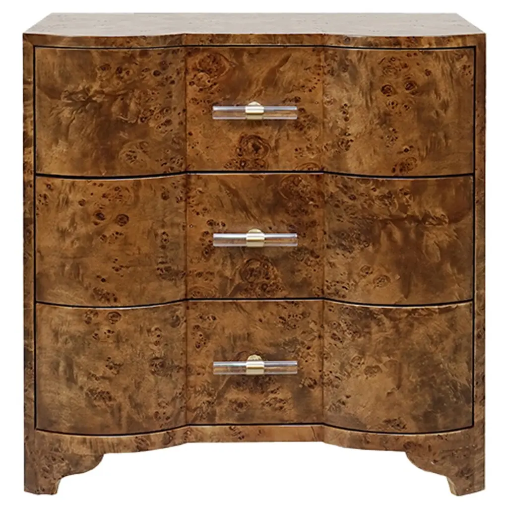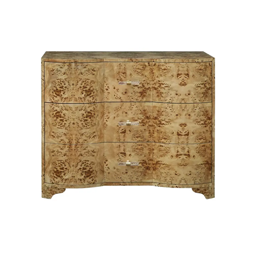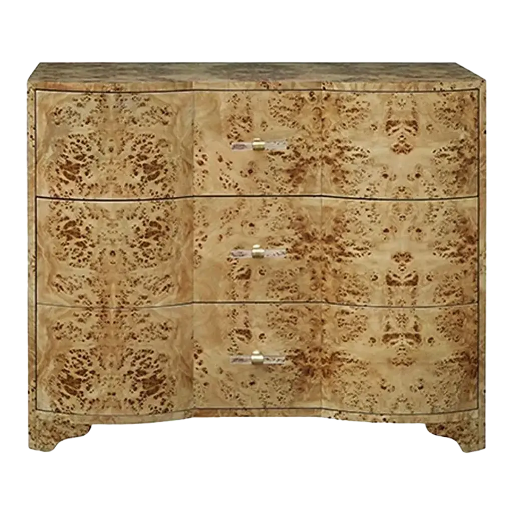 The stunning Plymouth three drawer chest by Worlds Away is a modern heirloom in the making! Distinctive, serpentine profile is dressed in exquisite, matte burl finish and accented with acrylic cylinder & brass hardware. Three generously scaled drawers make Plymouth an elegant storage solution for any interior. Available in light or dark burl wood.