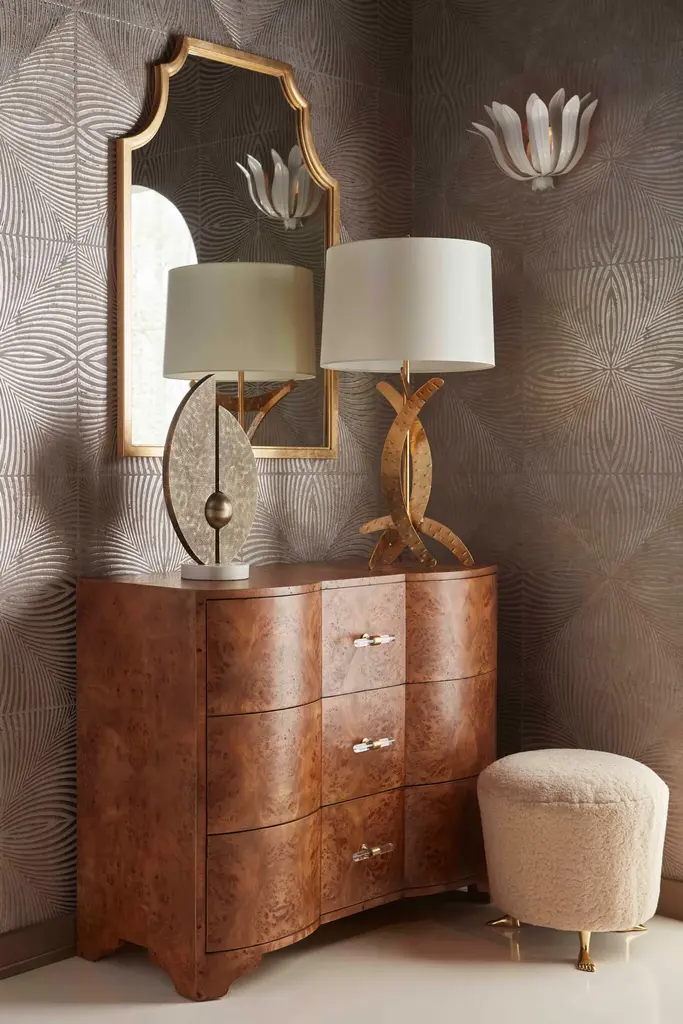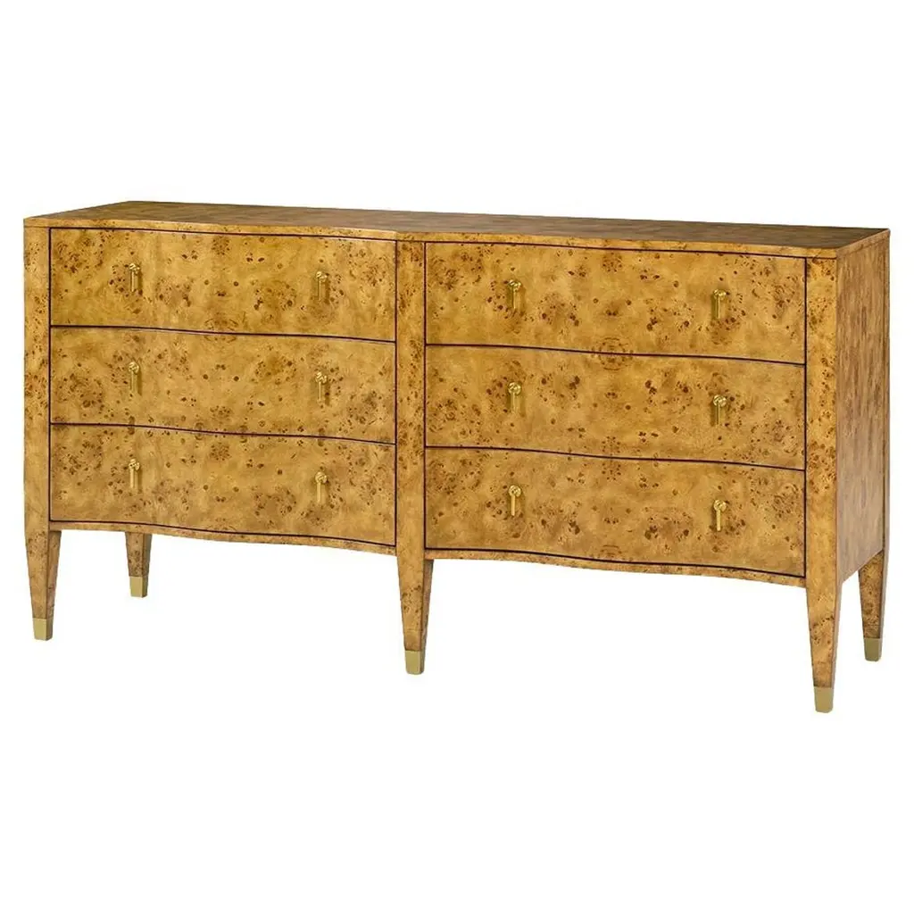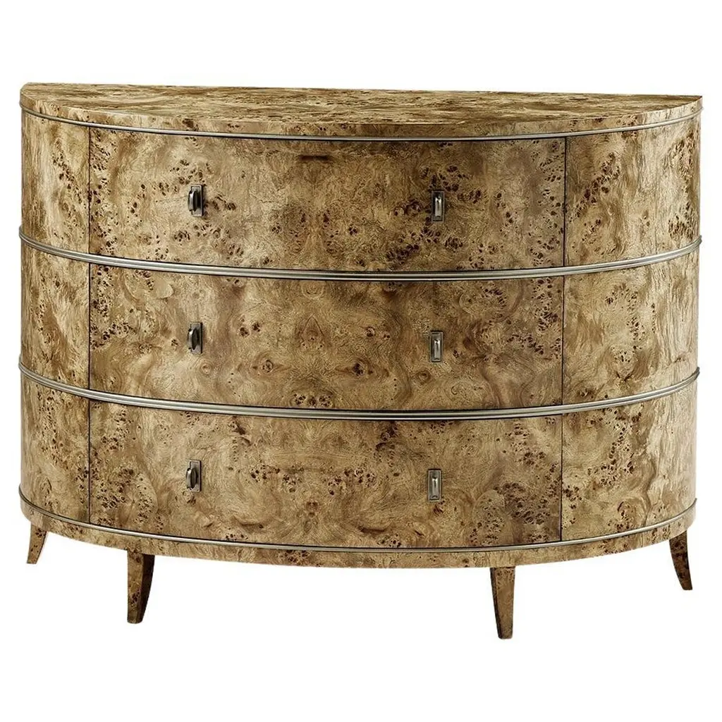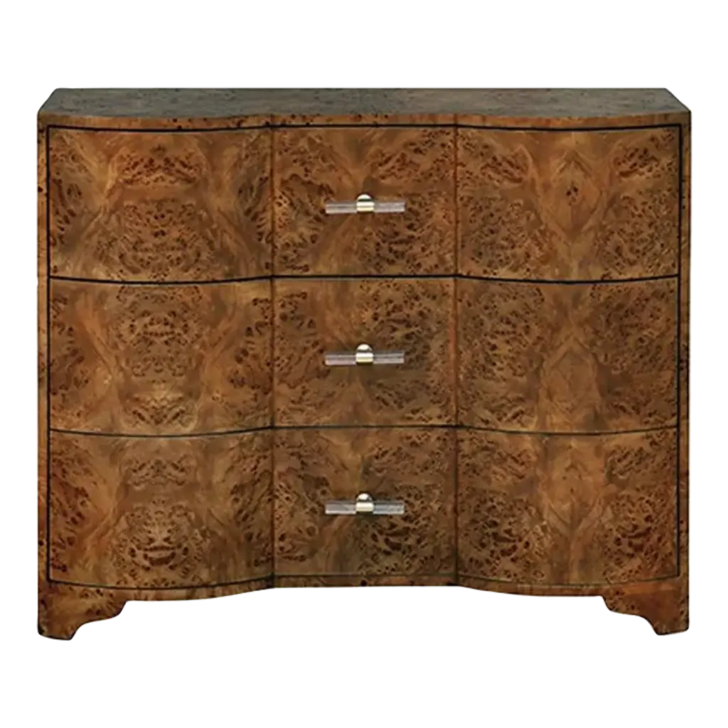 The stunning Plymouth three drawer chest by Worlds Away is a modern heirloom in the making! Distinctive, serpentine profile is dressed in exquisite, matte burl finish and accented with acrylic cylinder & brass hardware. Three generously scaled drawers make Plymouth an elegant storage solution for any interior. Available in light or dark burl wood.