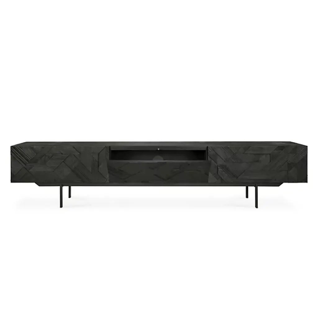 The Wrongwoods Low Cabinet from Established and Sons offers an expressive contemporary appeal to its surroundings. A sturdy structure using six legs to elevate a slender rectangular cabinet, it was designed in 2007 by Richard Woods & Sebastian Wrong. A plywood construction with painted cartoon-style fake woodgrain planks across its surface, it uses Richard Wood’s classic block prints to embellish Sebastian Wrong’s simple, strong design. The formation evokes Pop Art, with bold, exaggerated print lines that add a memorable touch of character to its surroundings.
