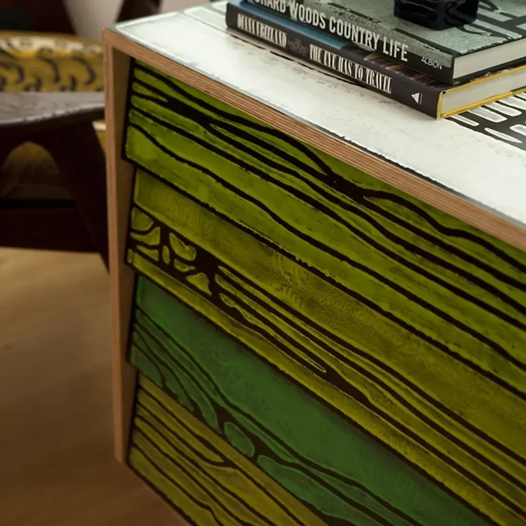 The Wrongwoods Credenza from Established & Sons reimagines functional storage with a bold artistic twist. Designed in 2007 by Richard Woods and Sebastian Wrong, this tall rectangular cabinet stands on four slim yet sturdy legs, supporting two spacious sliding drawers. AMade from plywood, every surface is covered in Woods’ signature cartoon-style fake woodgrain print, infusing a Pop Art influence into its clean, structured form. The exaggerated lines and playful patterns create a dynamic artistic offering that insists on attention.