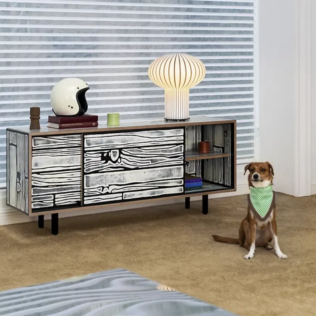 The Wrongwoods L500 Low Cabinet from Established & Sons transforms everyday storage into a bold design statement. This rectangular cabinet was designed in 2007 by Richard Woods and Sebastian Wrong, stands on four slim, strong legs and features two spacious sliding drawers. Each sturdy cabinet is made from plywood, with every surface covered in Woods’ signature cartoon-style fake woodgrain print, bringing a Pop Art influence to its clean, functional form. The playful patterns and exaggerated lines make each cabinet a dynamic, artistic addition to living areas.