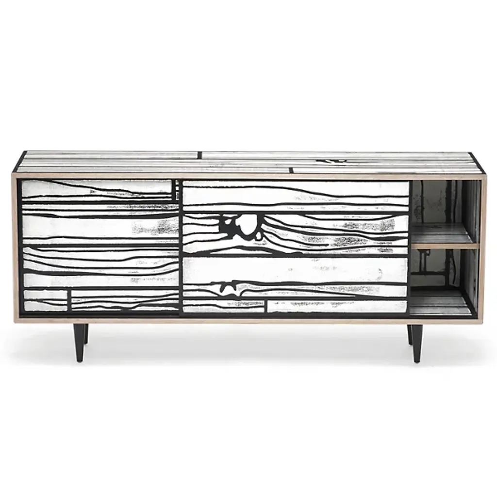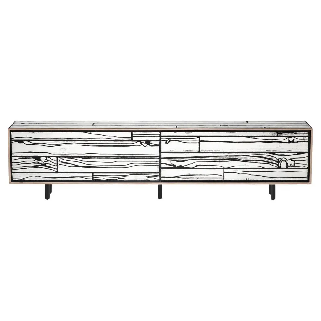The Wrongwoods L500 Low Cabinet from Established & Sons transforms everyday storage into a bold design statement. This rectangular cabinet was designed in 2007 by Richard Woods and Sebastian Wrong, stands on four slim, strong legs and features two spacious sliding drawers. Each sturdy cabinet is made from plywood, with every surface covered in Woods’ signature cartoon-style fake woodgrain print, bringing a Pop Art influence to its clean, functional form. The playful patterns and exaggerated lines make each cabinet a dynamic, artistic addition to living areas.