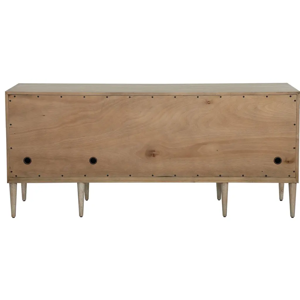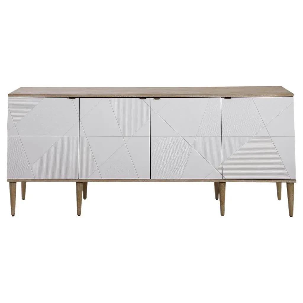 The Xavienne 4 Door Cabinet is a masterpiece of modern elegance, a symphony of design that captures the heart with its crisp and contemporary allure. This exquisite cabinet serves as the perfect sideboard, media unit, or console cabinet, offering versatility wrapped in sophistication. The elm veneer case exudes a light and airy ambiance, inviting a sense of tranquility into any space. Its geometrically textured doors, poised atop sleek tapered legs, whisper of mid-century charm, creating a harmonious blend of past and present. Each door, adorned with an aged steel tab, opens gracefully to reveal a compartment with an adjustable shelf, thoughtfully designed with wire management for seamless functionality. This cabinet is not just a piece of furniture; it's a romantic ode to style and practicality, destined to be the centerpiece of your home.