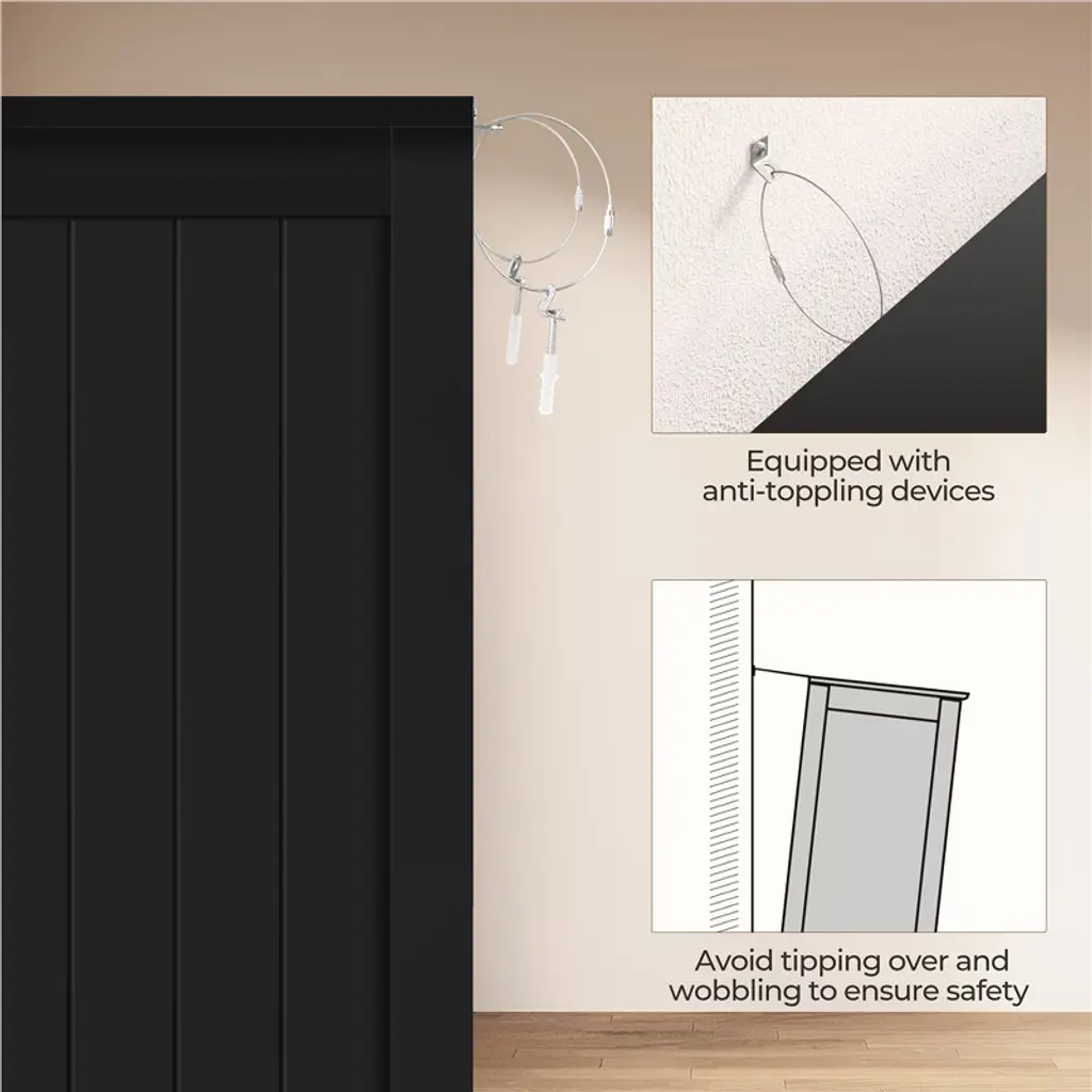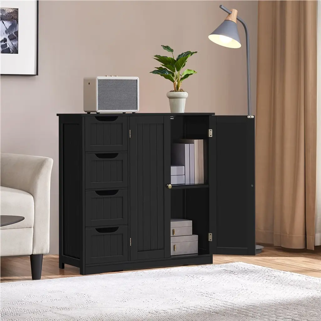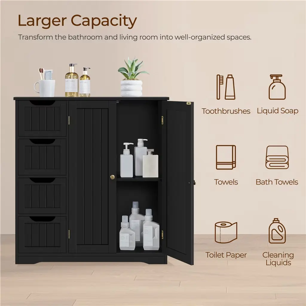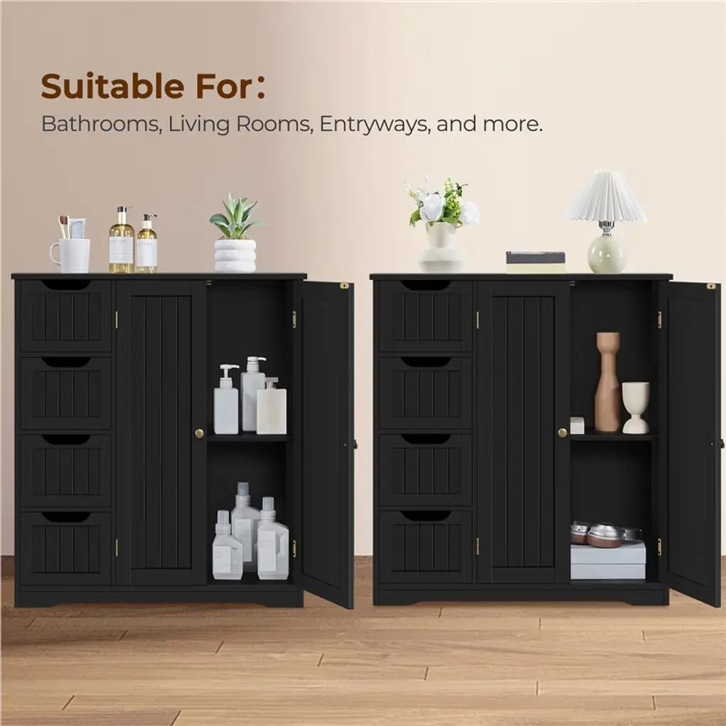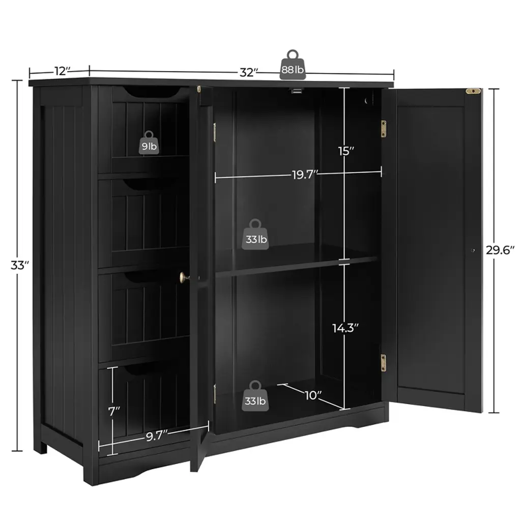 If extra toiletries and spare towels are piled up in your bathroom ensemble, having a spacious storage cabinet can help you hide all the clutter behind the door and out of sight. This 32″ L × 12″ W × 33″ H cabinet has 4 no-handle sliding drawers and 1 roomy cupboard with a fixed shelf, allowing you to keep items of different sizes behind the doors. Once you have it, the storage space in your bathroom, kitchen, and sitting room will instantly expand. *Specifications: Color: White, BlackMaterials: MDF, Metal HardwareAssembled Dimensions: 32″ L × 12″ W × 33″ HTabletop: 32″ L × 12″ WDrawer: 9″ W × 9.6″ D × 4″ HDistance from Bottom to Fixed Shelf: 14.3″Maximum Weight CapacityTabletop: 88 lbDrawer: 9 lbShelf: 33 lbShipping Weight: 44.8 lbItem Weight: 40.9 lb Please see the image for exact measurement Please allow a 1/2″ measurement tolerance.