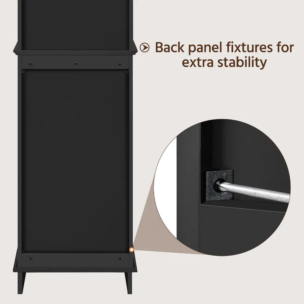 The clean-lined design combined with slatted paneling makes this cabinet modern and sleek, making it works well in a variety of aesthetics. The Crown molded top echos the curved silhouette at the bottom, adding a touch of elegance to the whole piece. P2 MDF and metal hardware, are selected materials to make sure that the storage rack works well for a long time. The mix of open and concealed storage brings more flexibility to your daily storage. Specifications: Material: MDF boards with paint sprayingColor: White, BlackOverall size: 16" L x 12" W x 60.5" HThe size of the door: 27.6" L x 13.5" W x 0.6" ThicknessThe adjustment range of the moveable shelf: 6.4", 9", 11.4"Max. load bearing of each shelf: 20 lbThe fixed shelf size: 13.6" L x 10.5" W x 8.2" HShelf depth: 10" Please see the image for exact measurements.