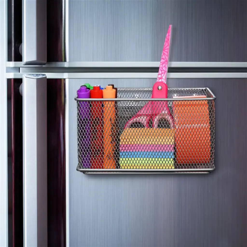 EEPING TRACK OF YOUR OFFICE OR COLLEGIATE ACCESSORIES IS EASY WITH THIS HANDY MAGNETIC BASKET. These baskets are attachable to any magnetic surfaces.This makes it perfect for holding whiteboard accessories such as markers and erasers.You can also use this basket on a desktop for school or work supplies or attach to a magnetic fridge and store just about anything like coffee tea.Straighten up your workplace or home with this handy wire mesh basket. THESE ARE GREAT FOR GARAGES, KITCHENS, OR ANY OTHER ROOM IN NEED OF ORGANIZING. Useful for both kitchen and office, this magnetic mesh storage basket brings convenient organization and a touch of quirky steam-era style to desks and refrigerators alike. This magnetic bin is ideal for keeping frequently needed herbs and spices at hand in the kitchen, or for holding pens, pencils, notepads, markers, or tape at a workstation in the office. Also a convenient way to keep cards, coupons, receipts, or other small items organized, you could also put it onto your desk and use it as a small trash caddy. This uniquely styled basket is sure to prove useful at home or work. SAVE SPACE AND ORGANIZE QUICKLY WITH THE SILVER MESH MAGNETIC STORAGE BASKET BY YBMHOME. Large capacity mesh basket will hold bills, letters, pens, pencils, whatever you want! The large magnet on back is powerful and will not slip or slide. Magnetic storage basket is perfect for filing cabinets, magnet boards, stoves or refrigerators. Try one today! You won't be disappointed at the many ways you can organize with this magnetic storage basket.