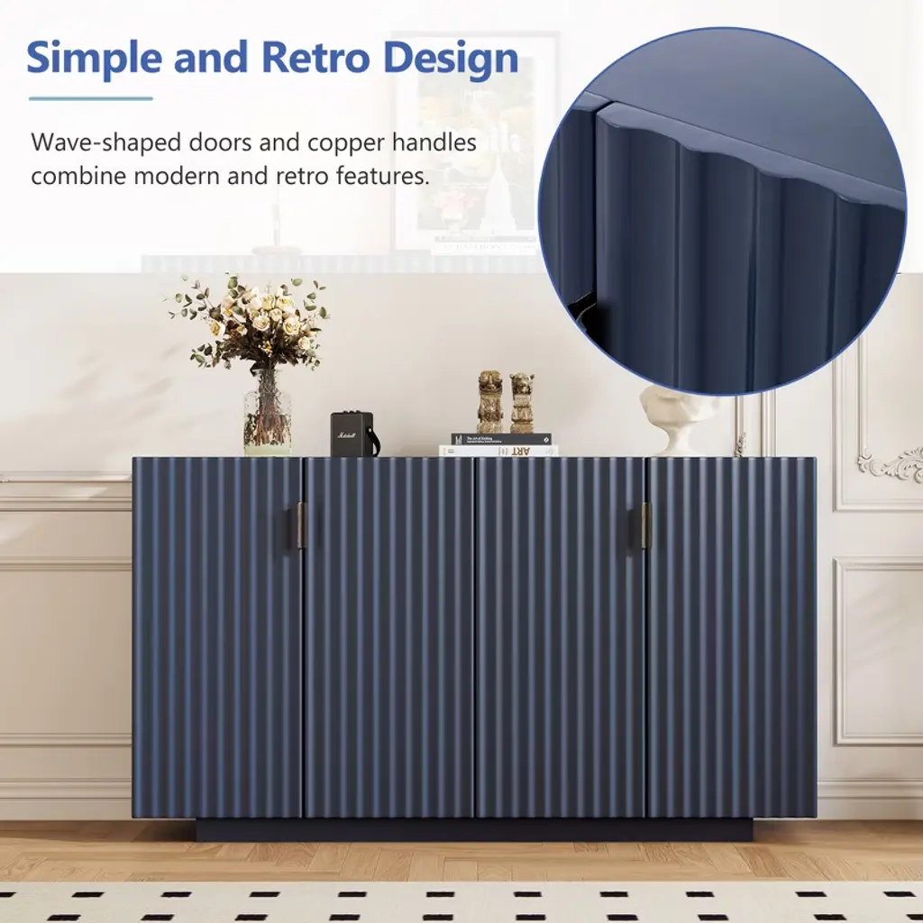 This buffet cabinet is designed to combine elegance with practicality, making it a perfect addition to your dining room or living room. With its simple and retro design, it features four fluted doors that add a touch of sophistication to any space. Constructed from high-quality MDF, it offers ample storage with adjustable shelves and cable holes for easy organization. The cabinet includes adjustable foot pads for stability and soft-closing hinges for smooth operation. Easy to assemble with detailed instructions, this cabinet is both stylish and functional.