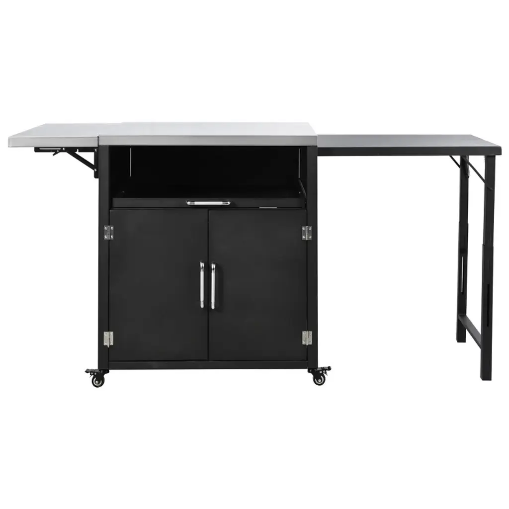 This versatile outdoor cabinet is designed to meet your outdoor needs with its expandable work surfaces, ample storage, and durable construction. It features a foldable tabletop and an extendable iron panel for flexible workspace, a stainless steel worktop for easy cleaning, and both a spacious drawer and cabinet for organized storage. The robust iron frame ensures stability, while lockable wheels provide easy mobility and secure positioning. Perfect for BBQs, gardening, or any outdoor activity, this cabinet combines functionality with style.