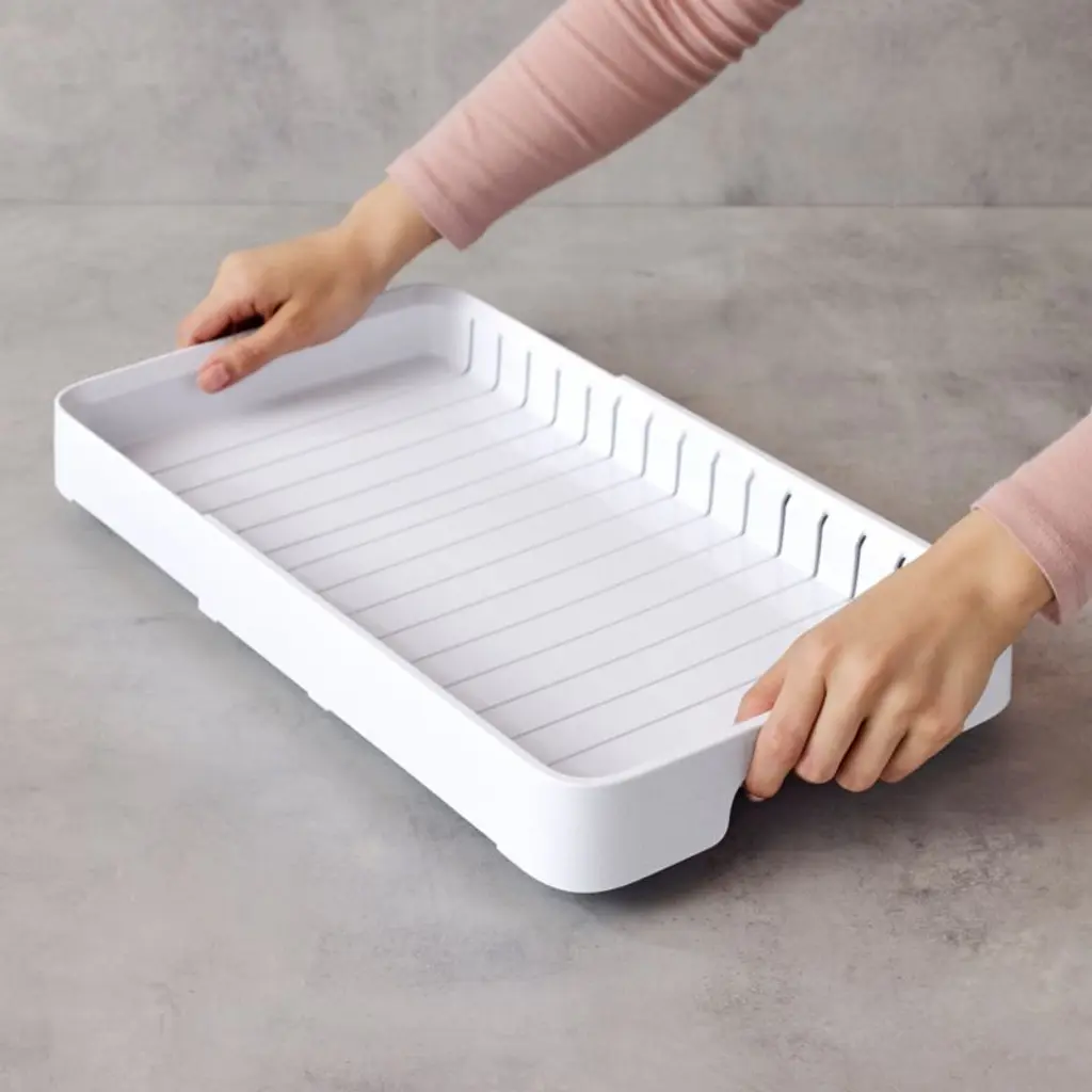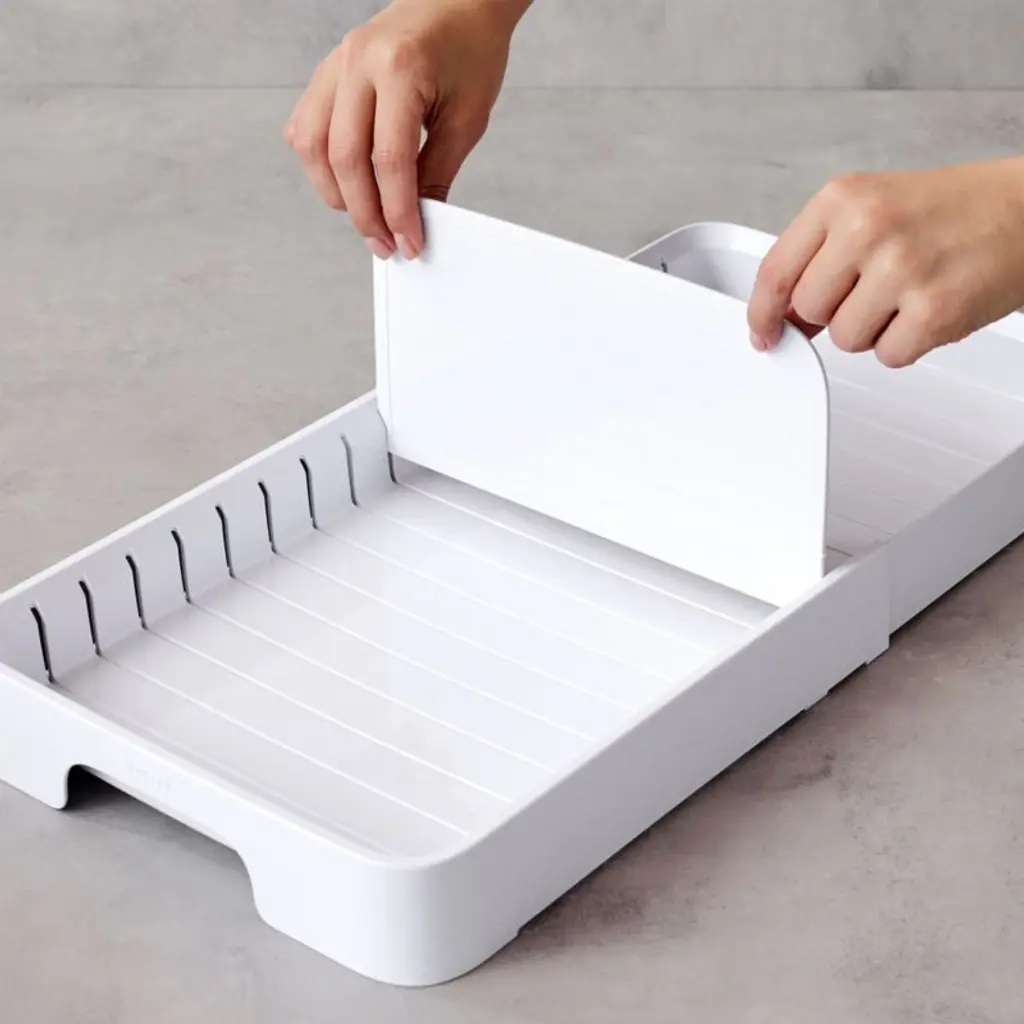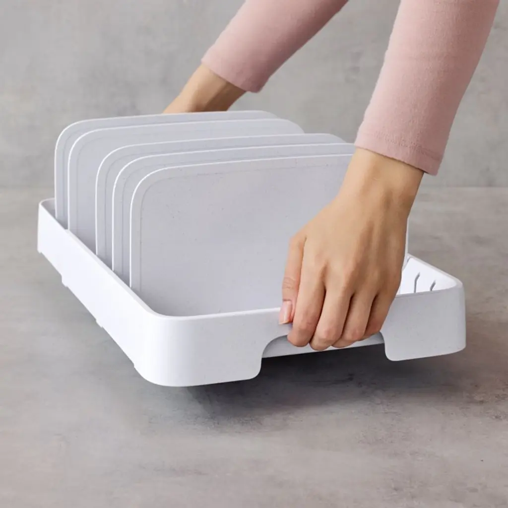 This ingenious organizer makes the most of your available storage space, neatly holding food storage lids so they're easy to grab and go. Supported on a speckled white base, eight slim dividers keep a variety of lids sorted and uprightno stacking required. Expand the base to fit your space, then easily position and reposition the dividers to suit your collection and keep your pantry or cabinets orderly and accessible.