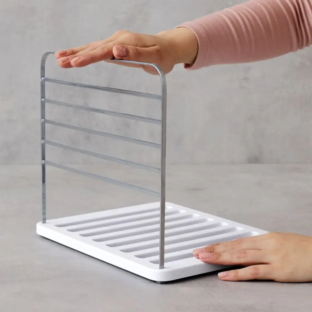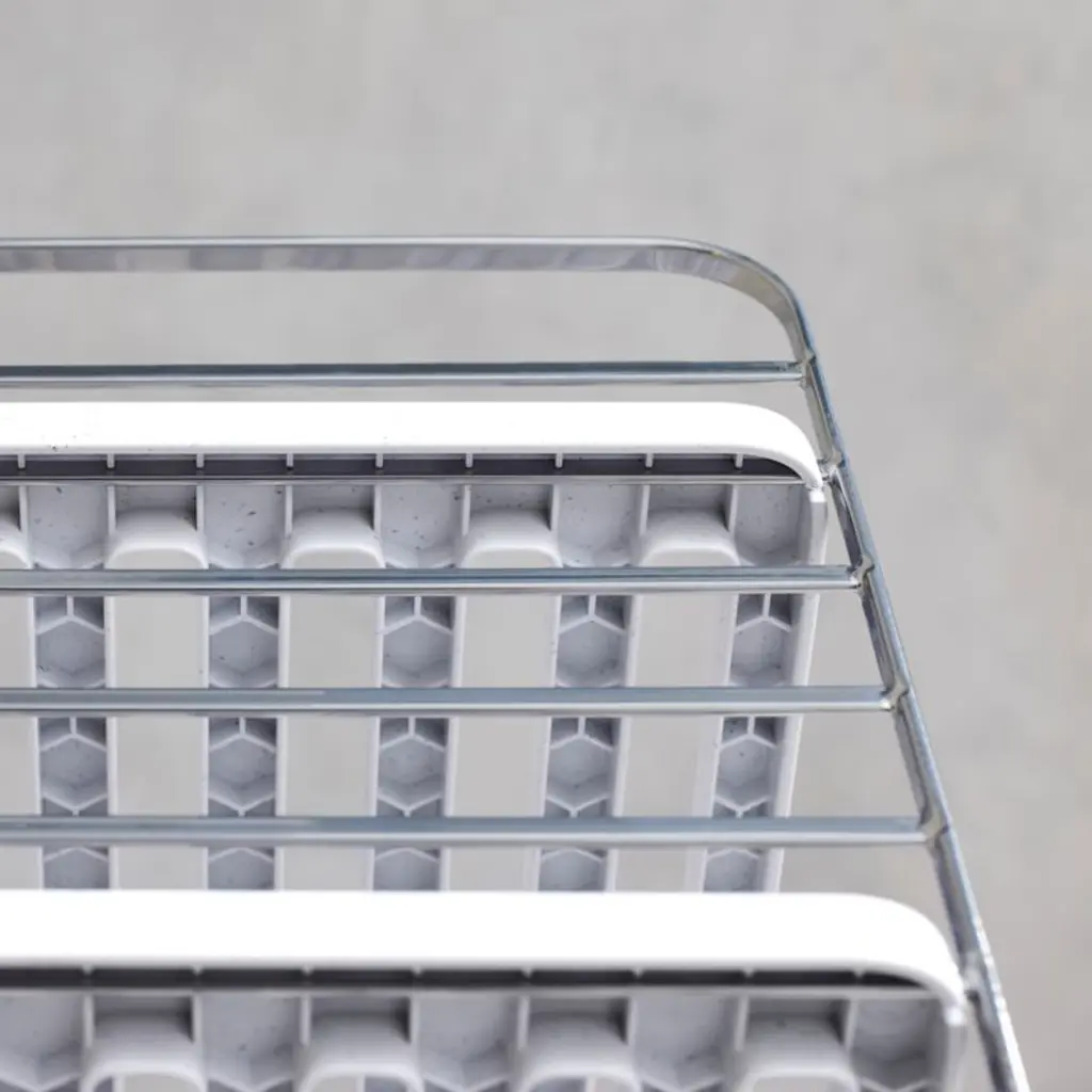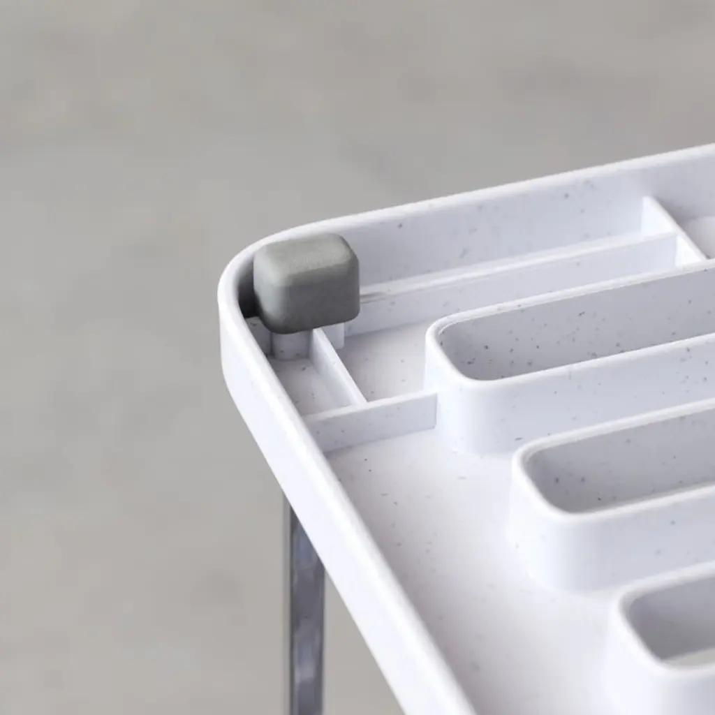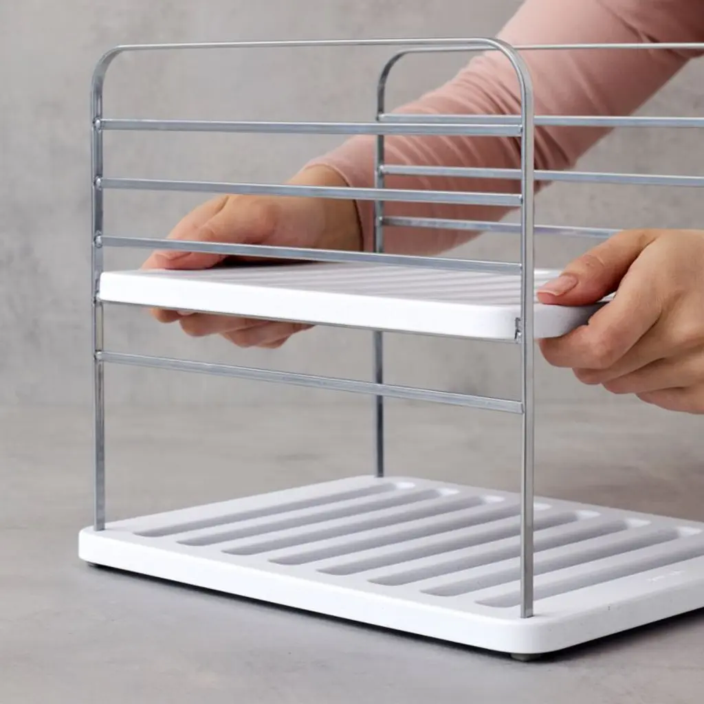 This ingenious organizer makes the most of your available storage space, neatly holding dishes or dry goods so they're easy to grab and go. Supported by a strong reinforced steel frame, the three speckled white shelves support up to 20 pounds. Nonslip feet keep the small organizer in place whenever you add or remove items. Adjust the shelves to suit your storage needs and keep your pantry or cabinets orderly and accessible.