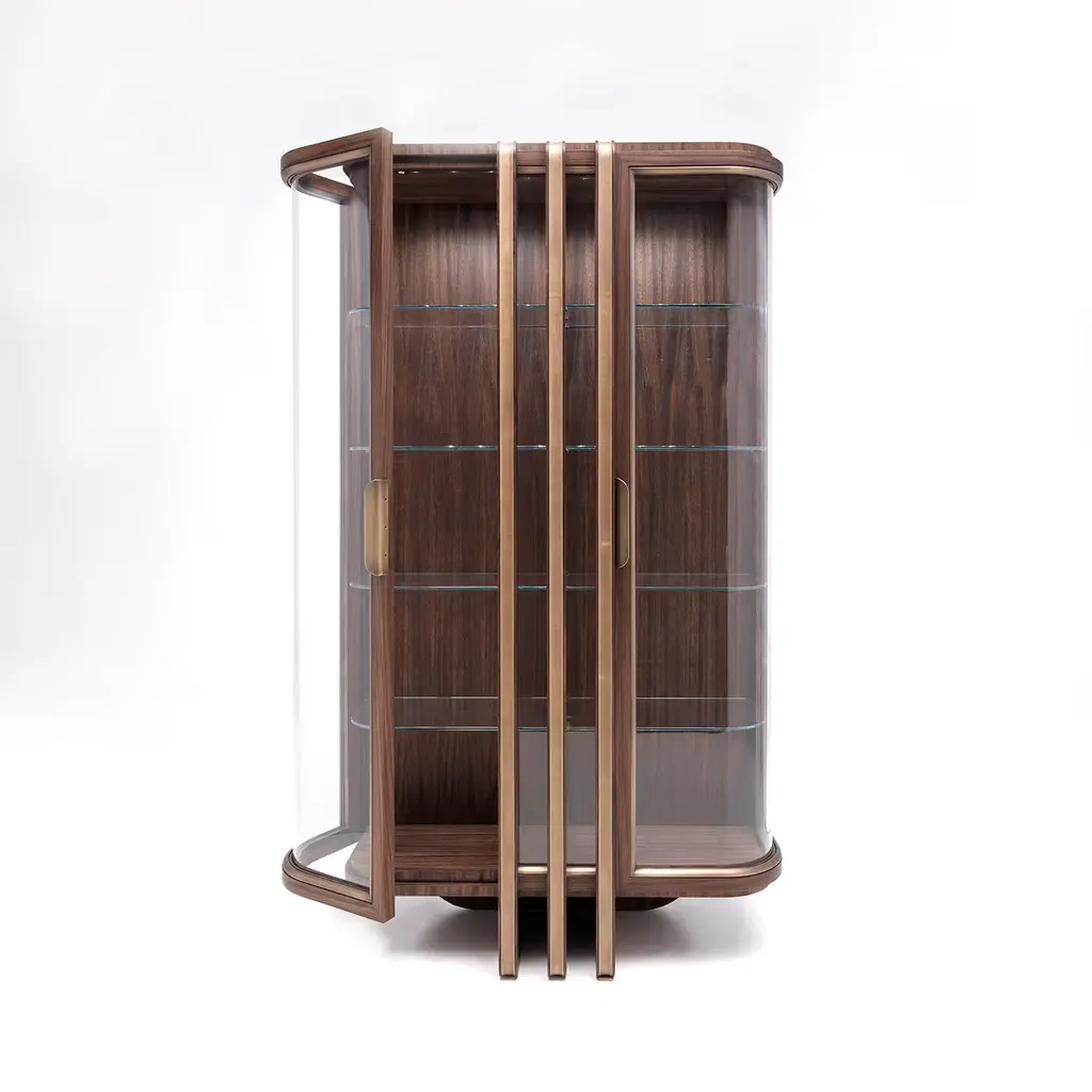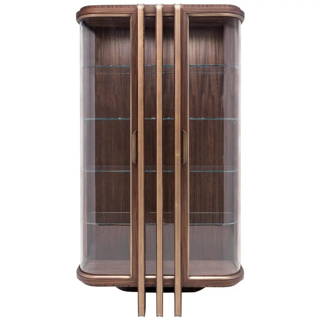 The perfect accent piece for a classic or modern decor, this precious display cabinet features an imposing zebra wood frame. The curved profile of the front is traced by the two glass doors extending to the wooden back to set the attention on the collectibles and other remarkable objects that can be distributed along the four inner glass shelves. Luminous brass details enliven the overall look.