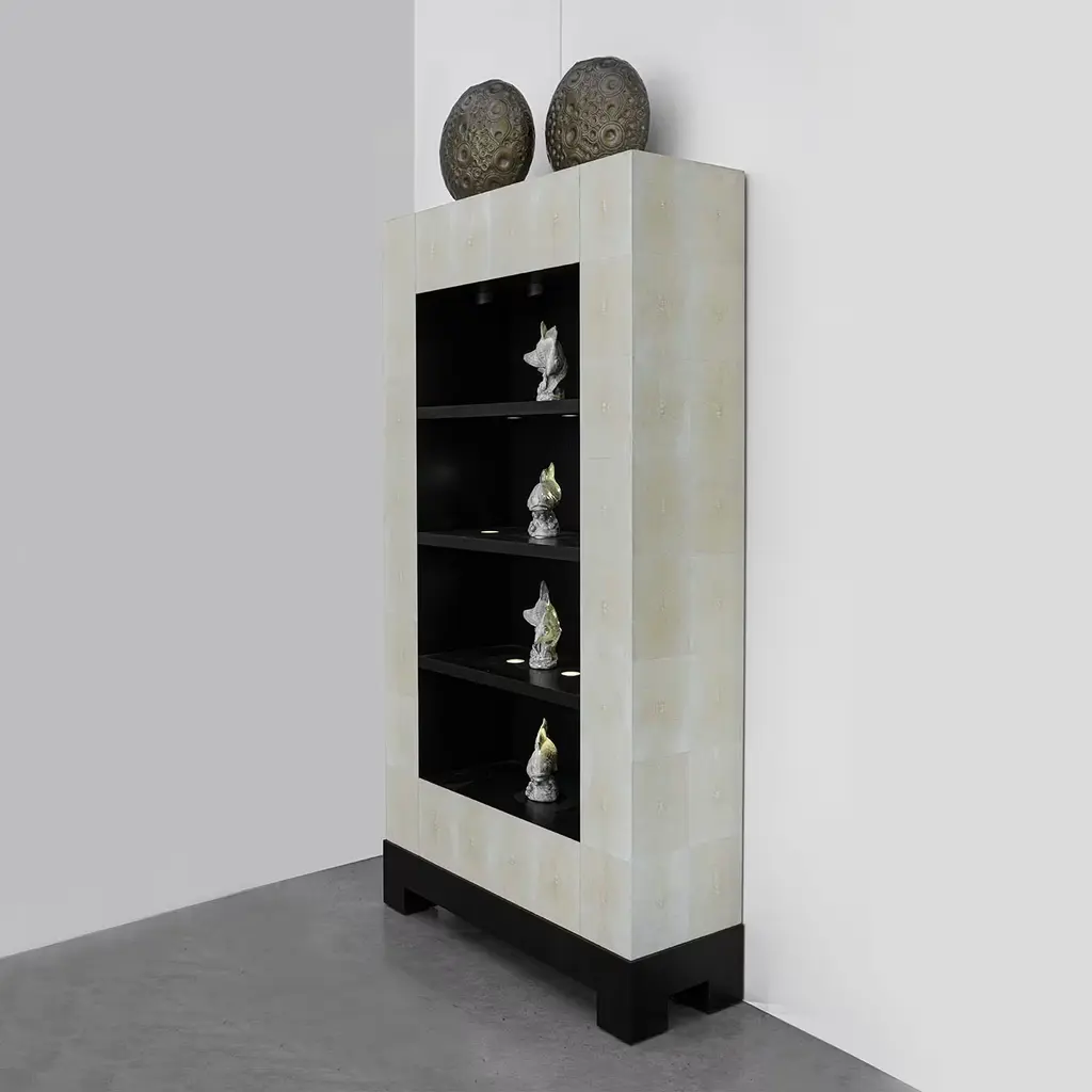A magnificent design of timeless sophistication, this display cabinet is handcrafted with first-rate materials. Boasting three wooden shelves enhanced with spotlights to illuminate displayed objects, it features a wengé-lacquered oak structure, enriched with an external frame covered with natural shagreen ivory leather. Please consult the Concierge for further information.