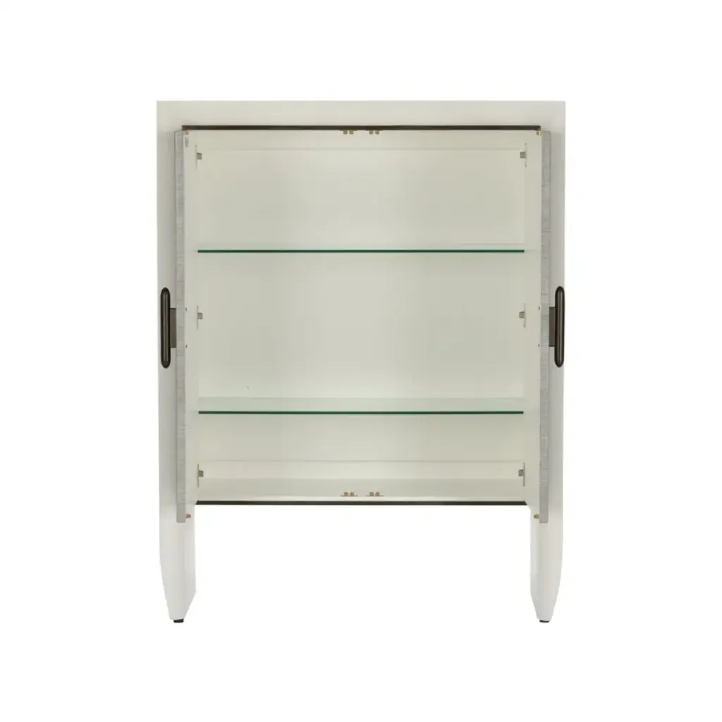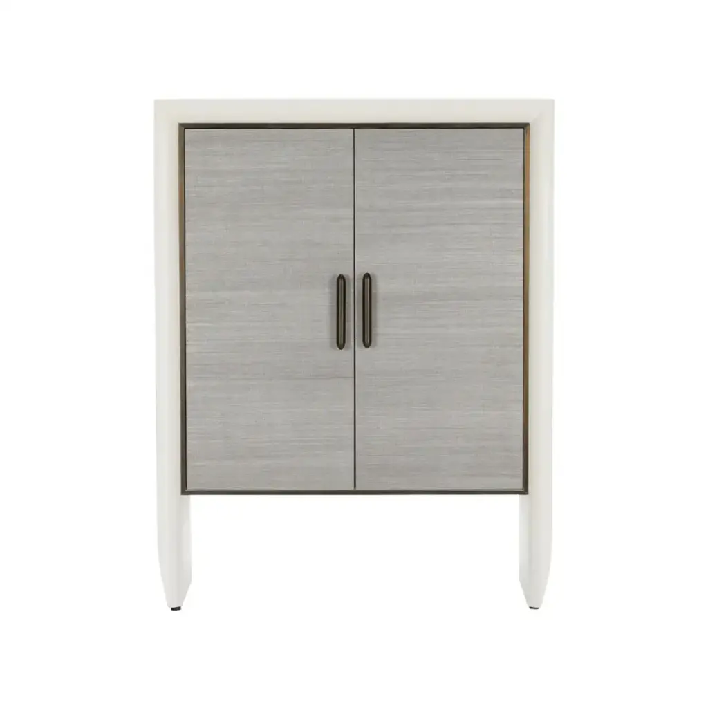 Introducing the Zep Bar Cabinet, a sleek and modern addition to any contemporary living space. The cabinet boasts a minimalist white wood frame with a bold and striking presence, accentuated by its slightly curved legs that add a touch of elegance to its silhouette. The front features gray grasscloth doors, lending a soft texture and a subtle, sophisticated pattern to the design. Enhanced by bronze hardware, the handles complement the muted tones of the cabinet while providing a stylish contrast. Finished with two interior glass shelves, this piece is perfect for storing your favorite spirits, glassware, and bar accessories, making it a functional and chic statement in your home.